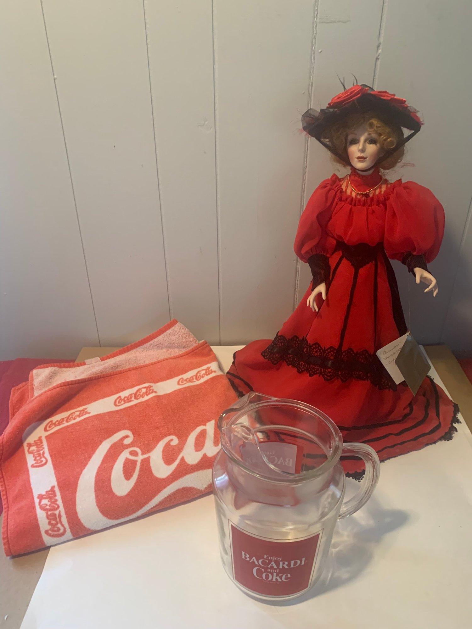 COCA COLA LOT WITH PITCHER, BEAUTIFUL DOLL, TOWEL