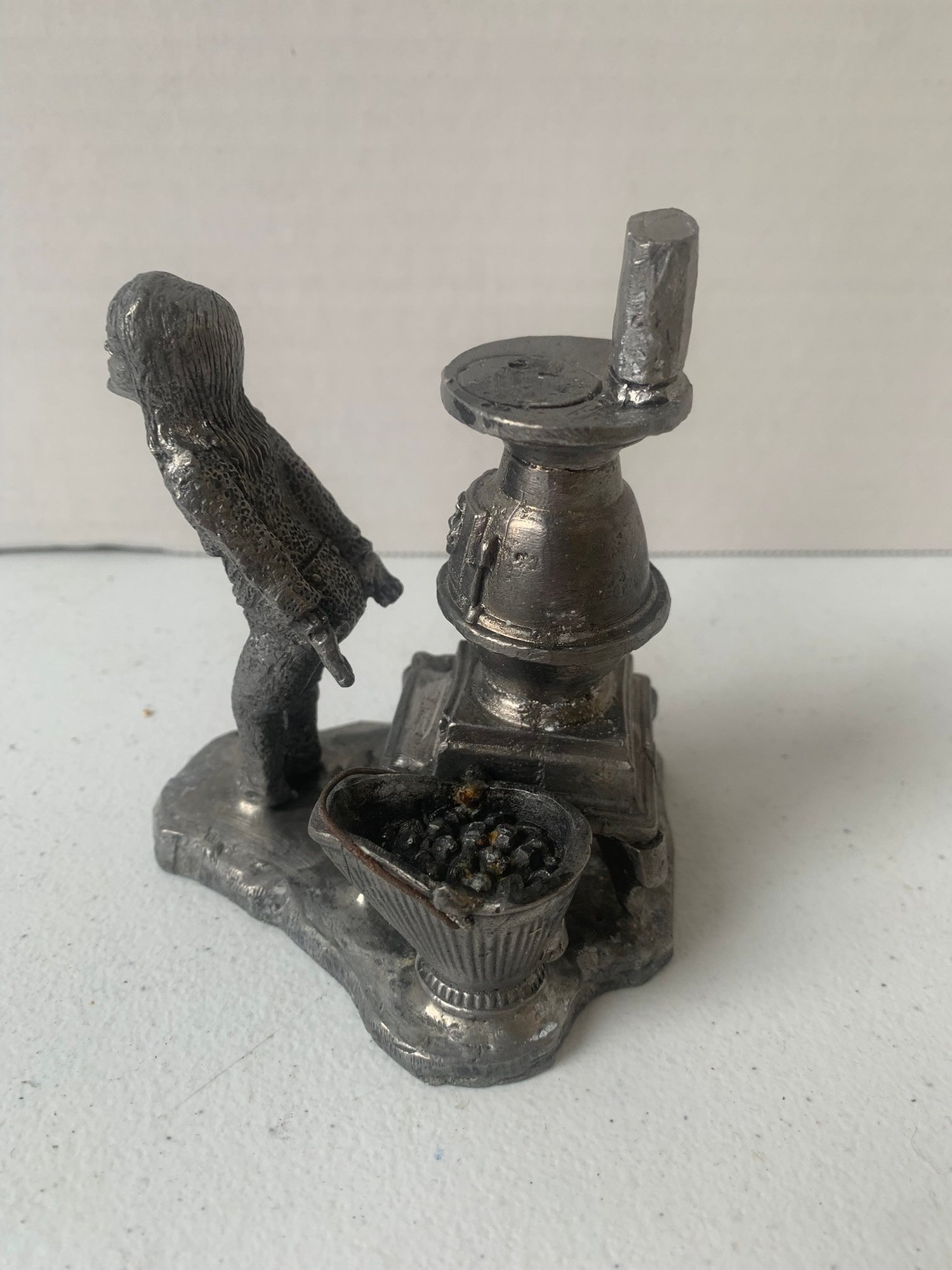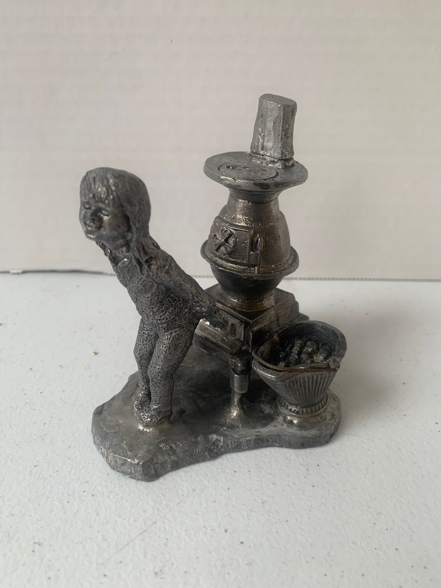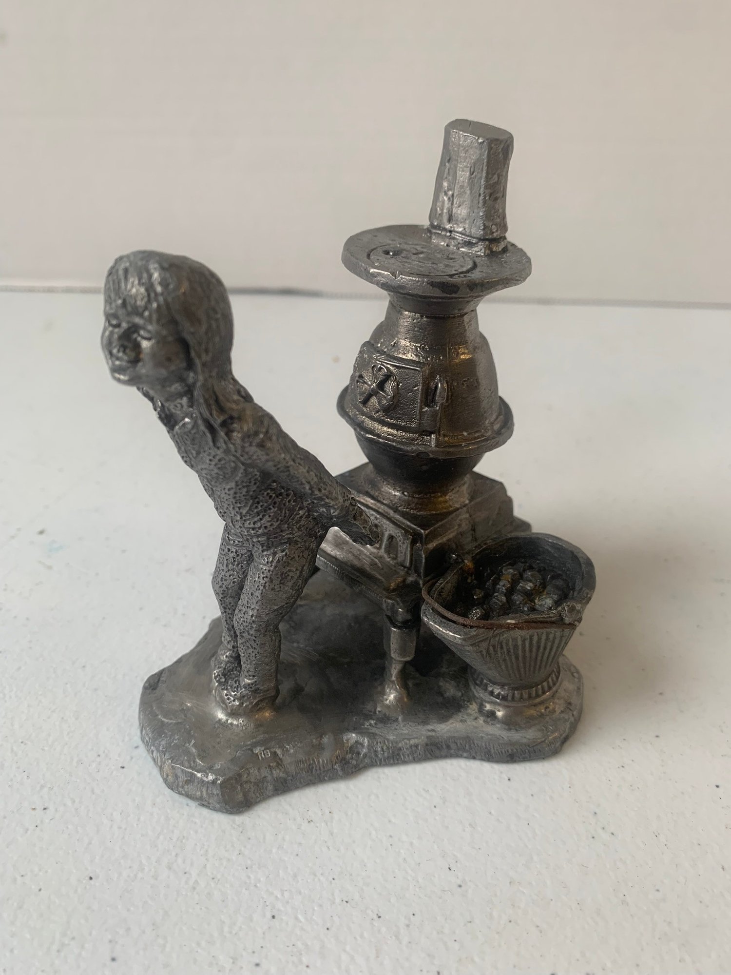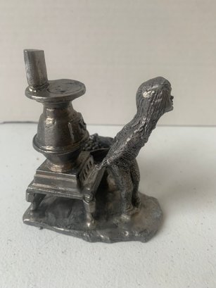 HEAVY MICHAEL RICKER PEWTER SCULPTURE, MISTY AND A POT BELLY STOVE, 4"H 522/2000