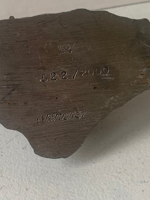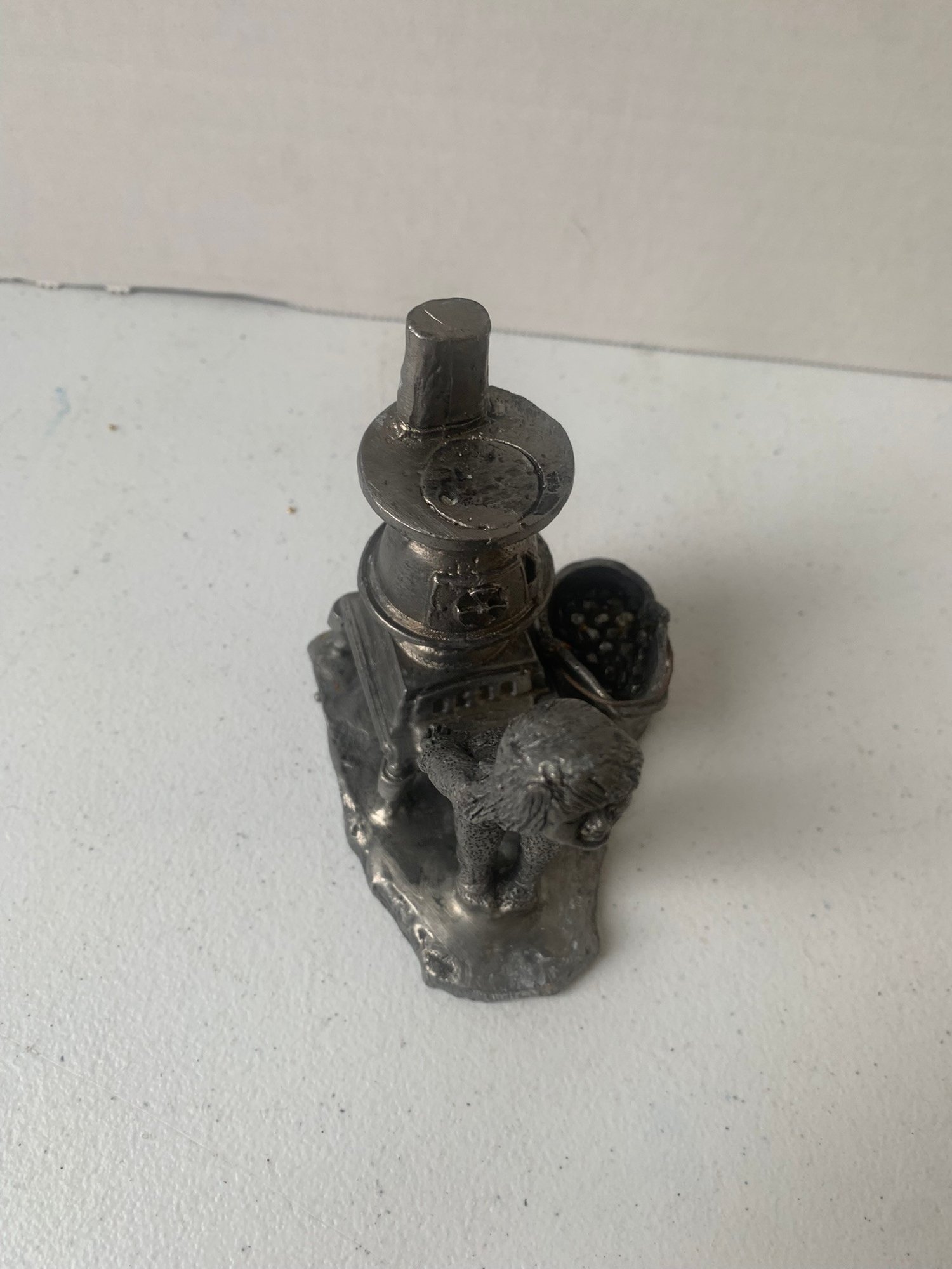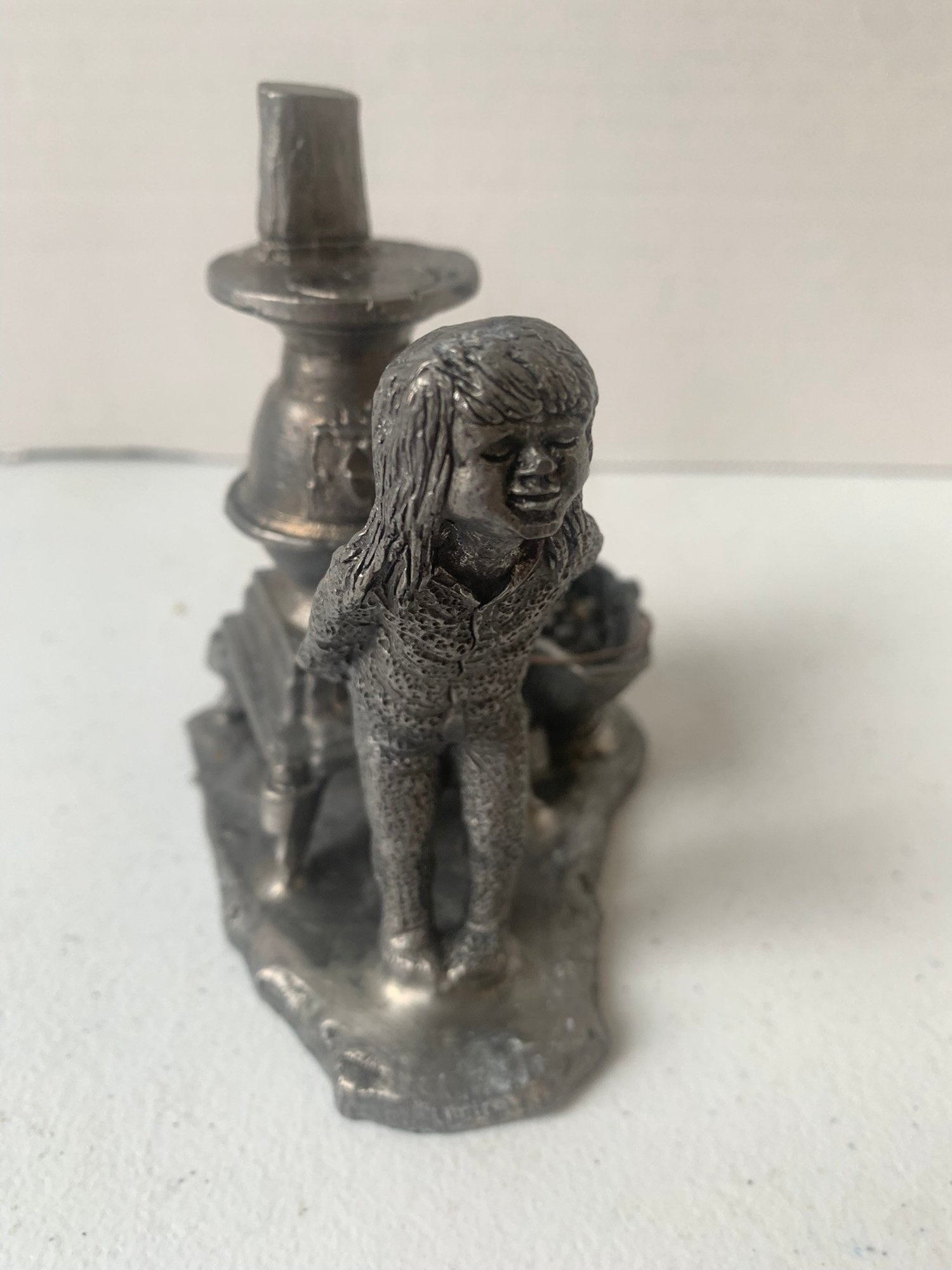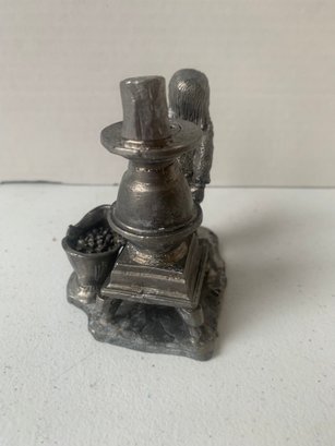 HEAVY MICHAEL RICKER PEWTER SCULPTURE, MISTY AND A POT BELLY STOVE, 4"H 522/2000