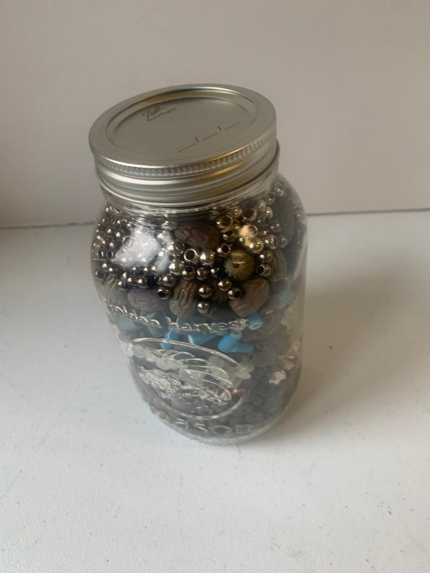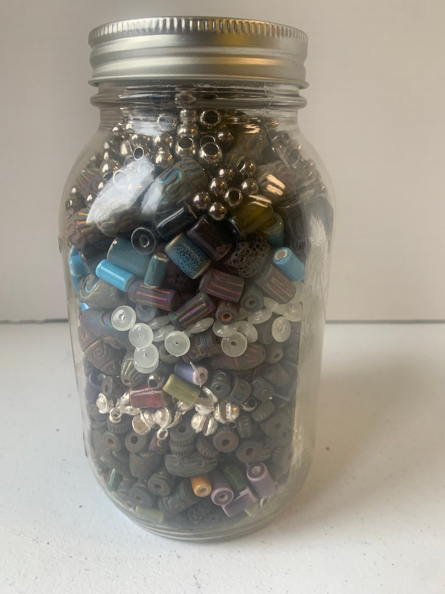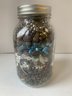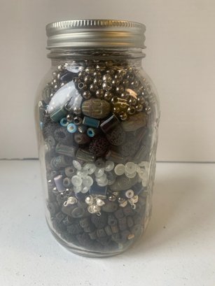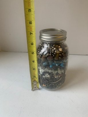 JAR FULL OF BEADS INCLUDING CLAY BEADS, ETC, 7"H