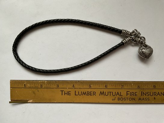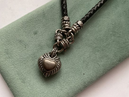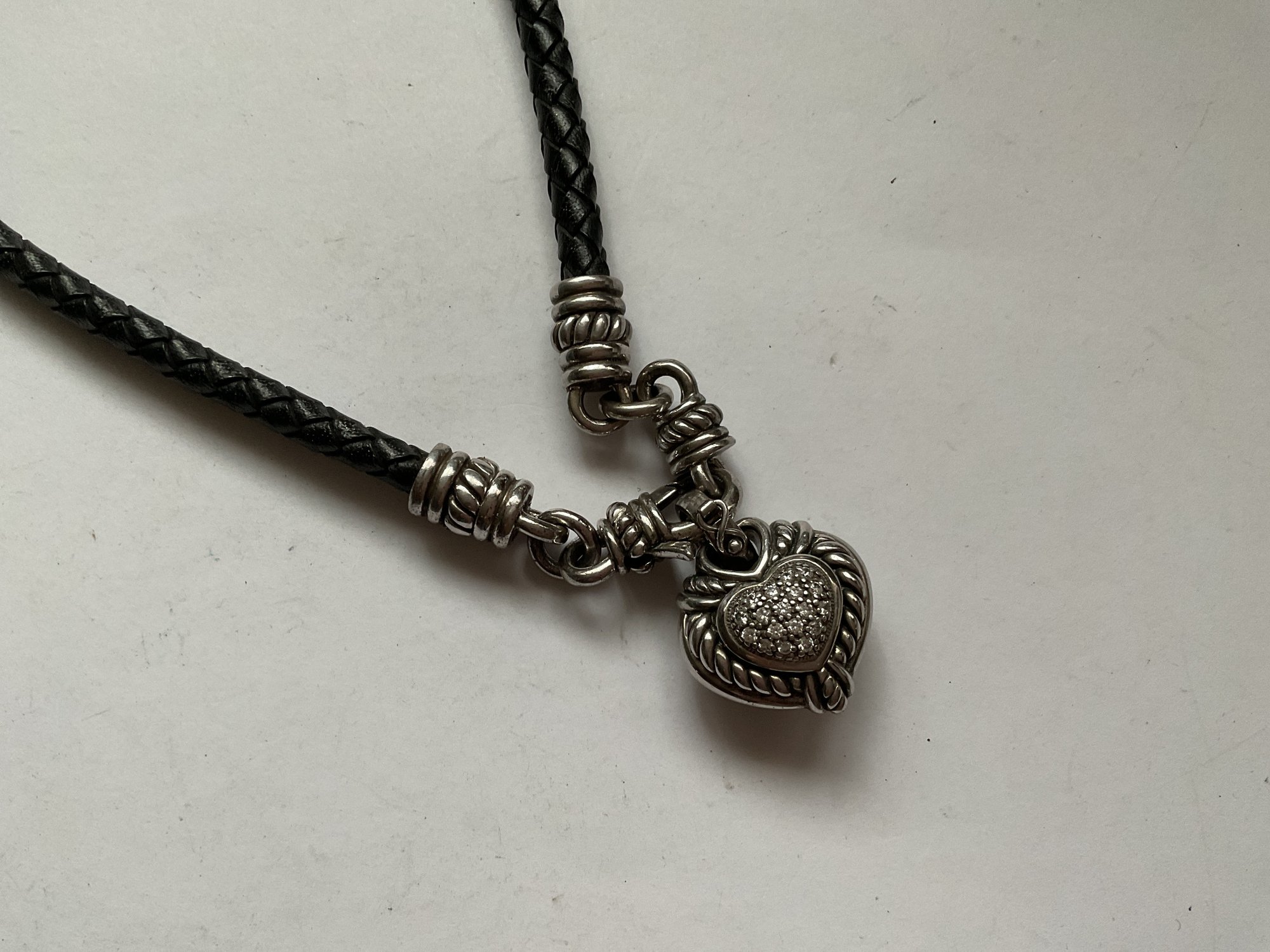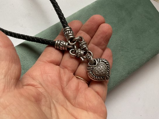 Very nice Judith RIPKA necklace featuring a pave’ crystal heart connected magnetically to a braided leather length. The leather has sterling caps which attach to the heart. I’m sure this is interchangeable with other Judith RIPKA pieces.