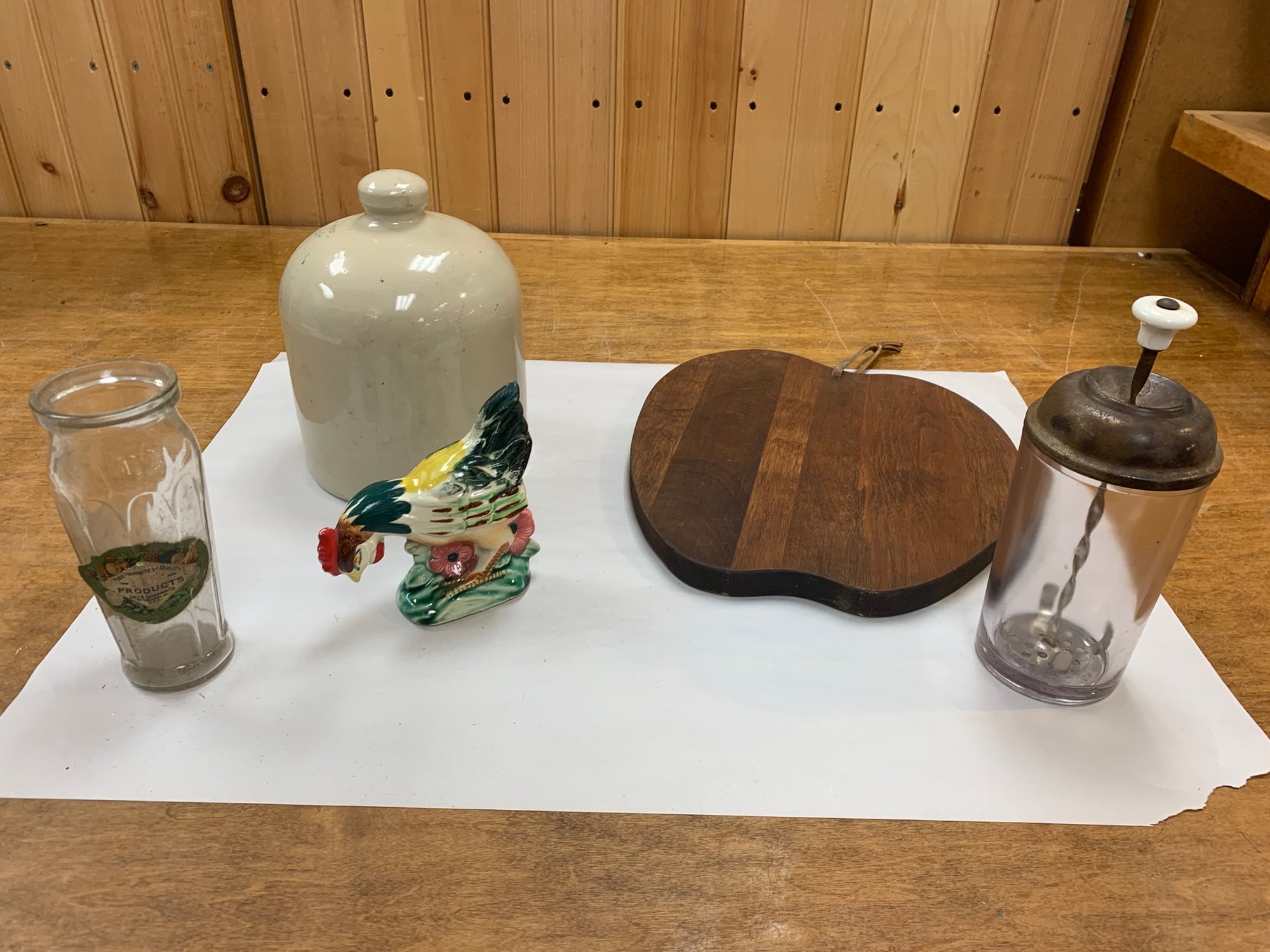 CROCK CHICKEN FEEDER, ROOSTER, VINTAGE FOOD CHOPPER, BOTTLE, CUTTING BOARD