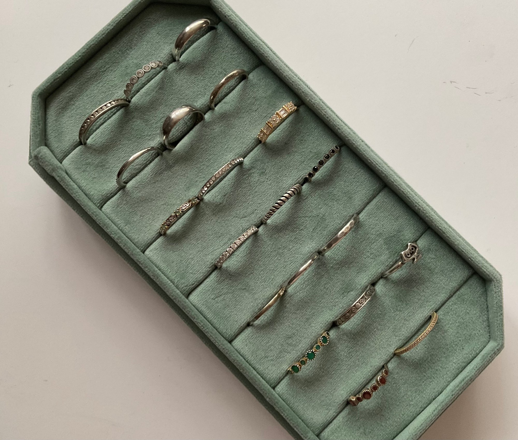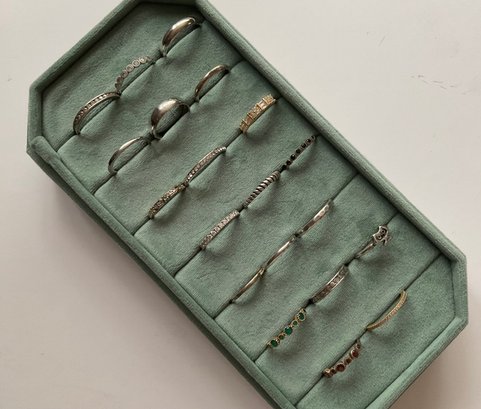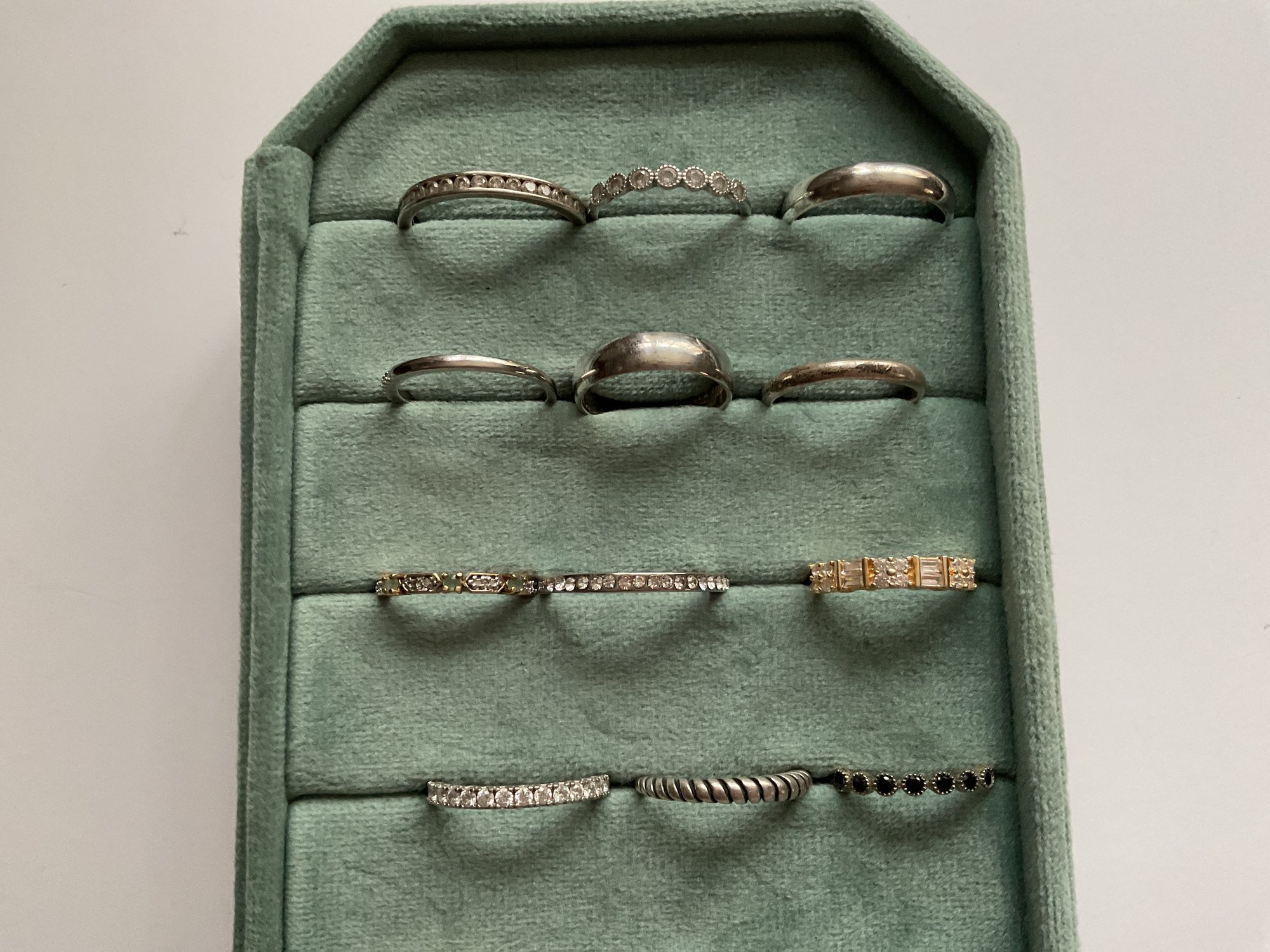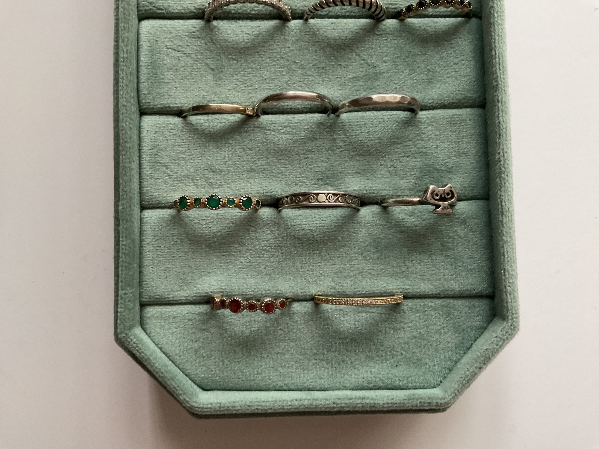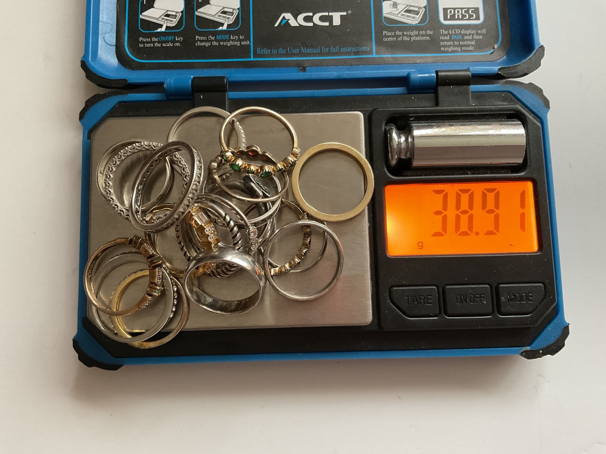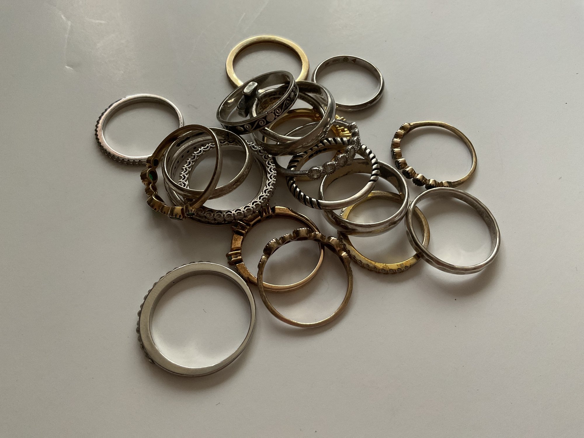 This is a lot of twenty sterling silver stacking rings. Many styles and sizes. Some are gold wash. Probably need a bit more cleaning. 39.8 grams. All marked.