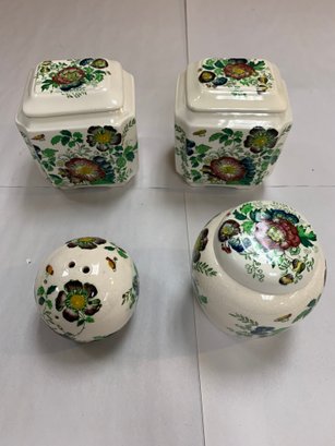TEA CADDYS AND ONE INFUSOR. 1 TEA CADY HAS A CHIP AND CRAZING AS SHOWN.NO CHIPS OR CRACKS ON THE OTHERS