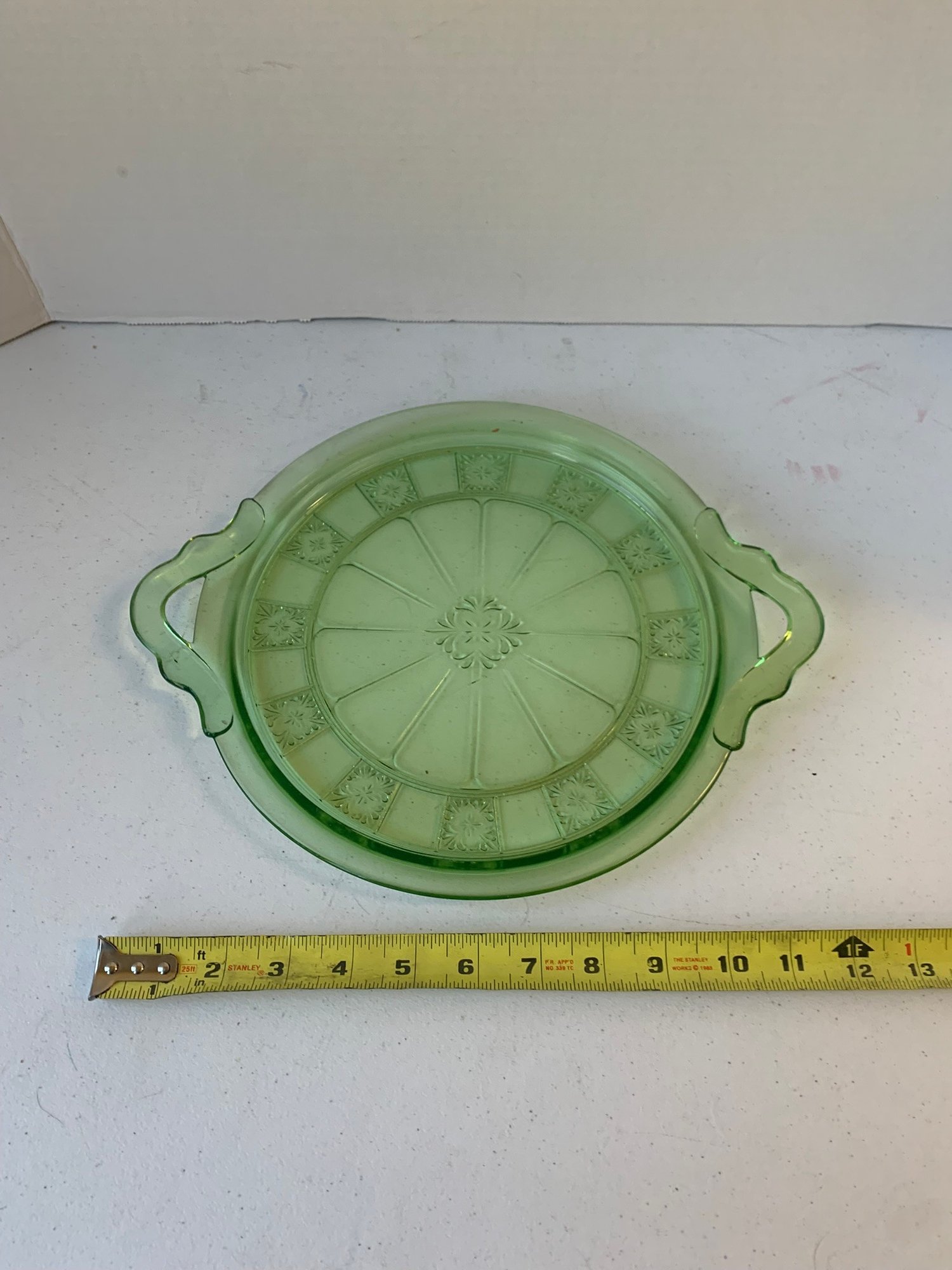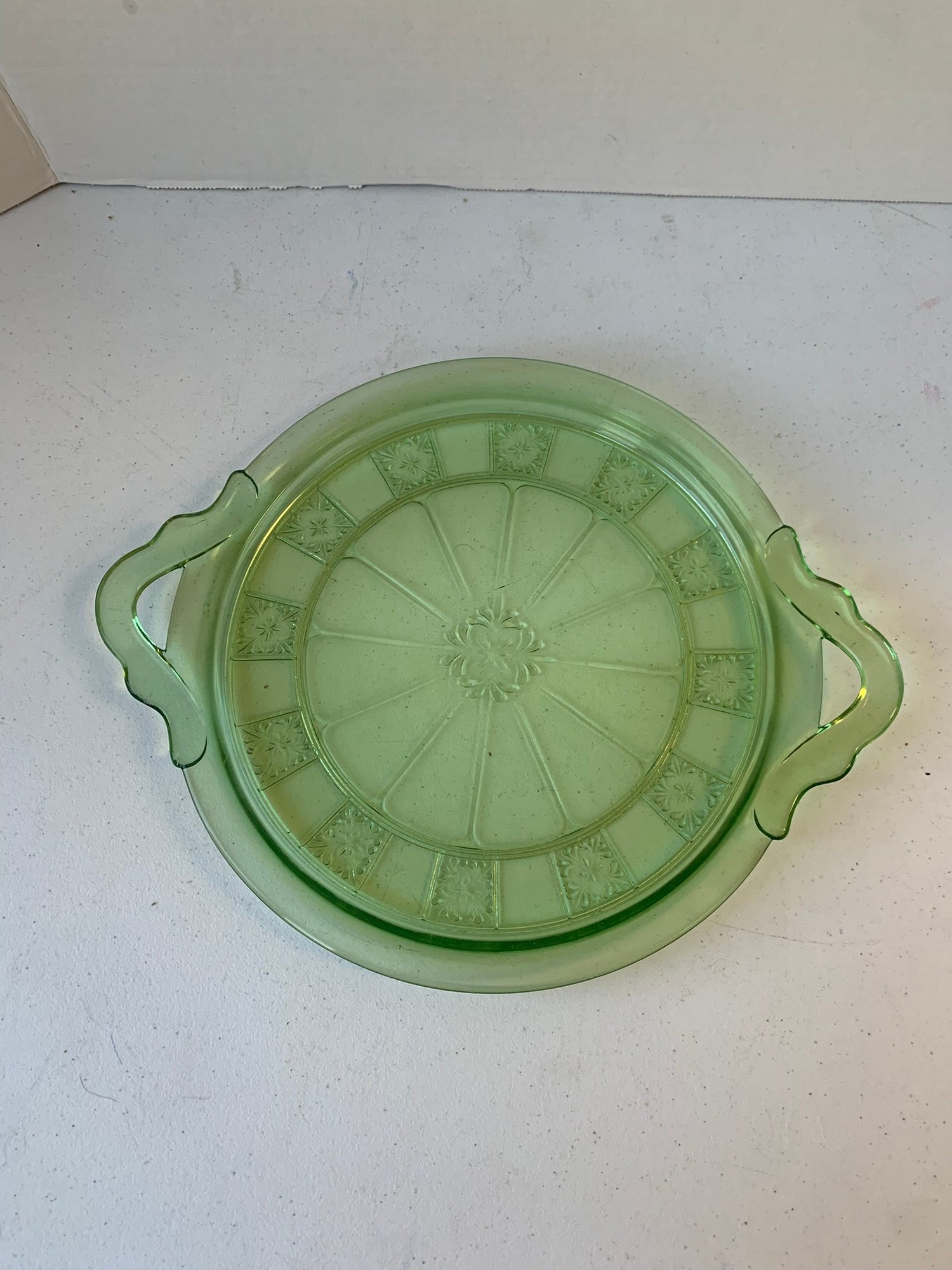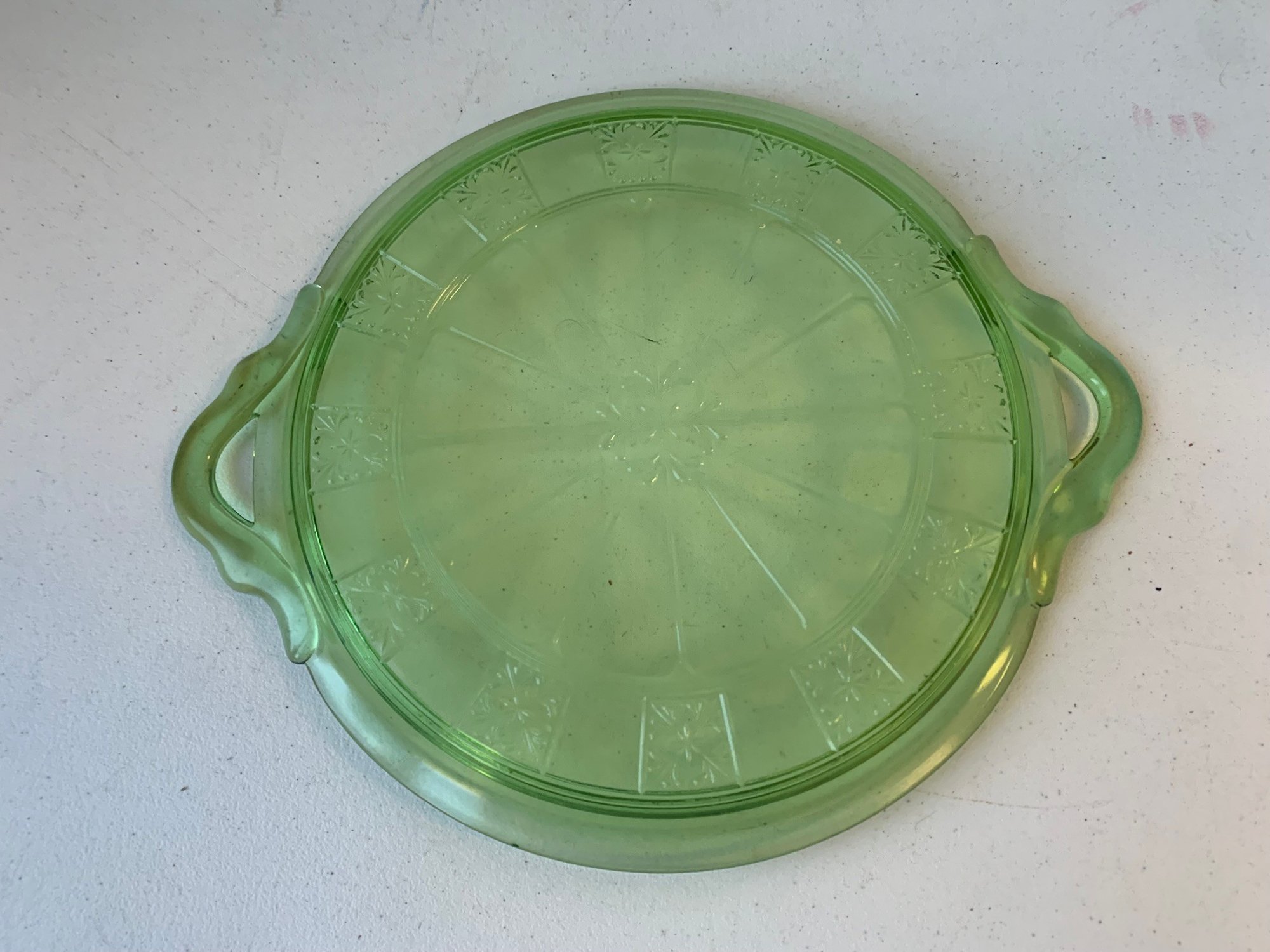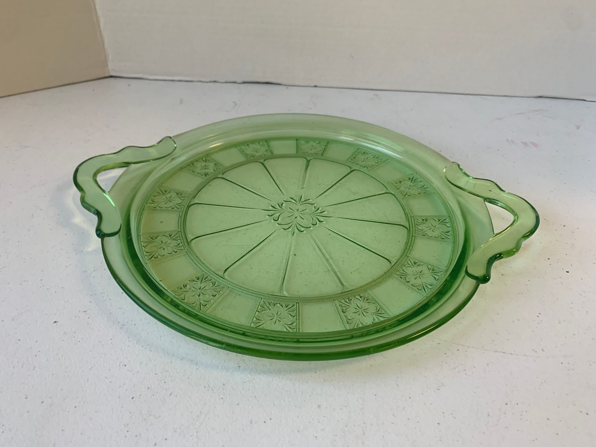 URANIUM GLASS DOUBLE HANDLED CAKE PLATE, JEANNETTE GLASS