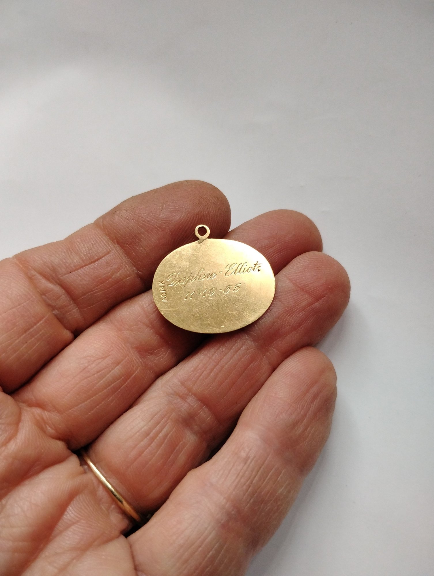 The charm needs a bale to attach to as a pendant or charm. It is inscribed “to Daphne Elliott” with a date on the reverse, and signed AG14k.