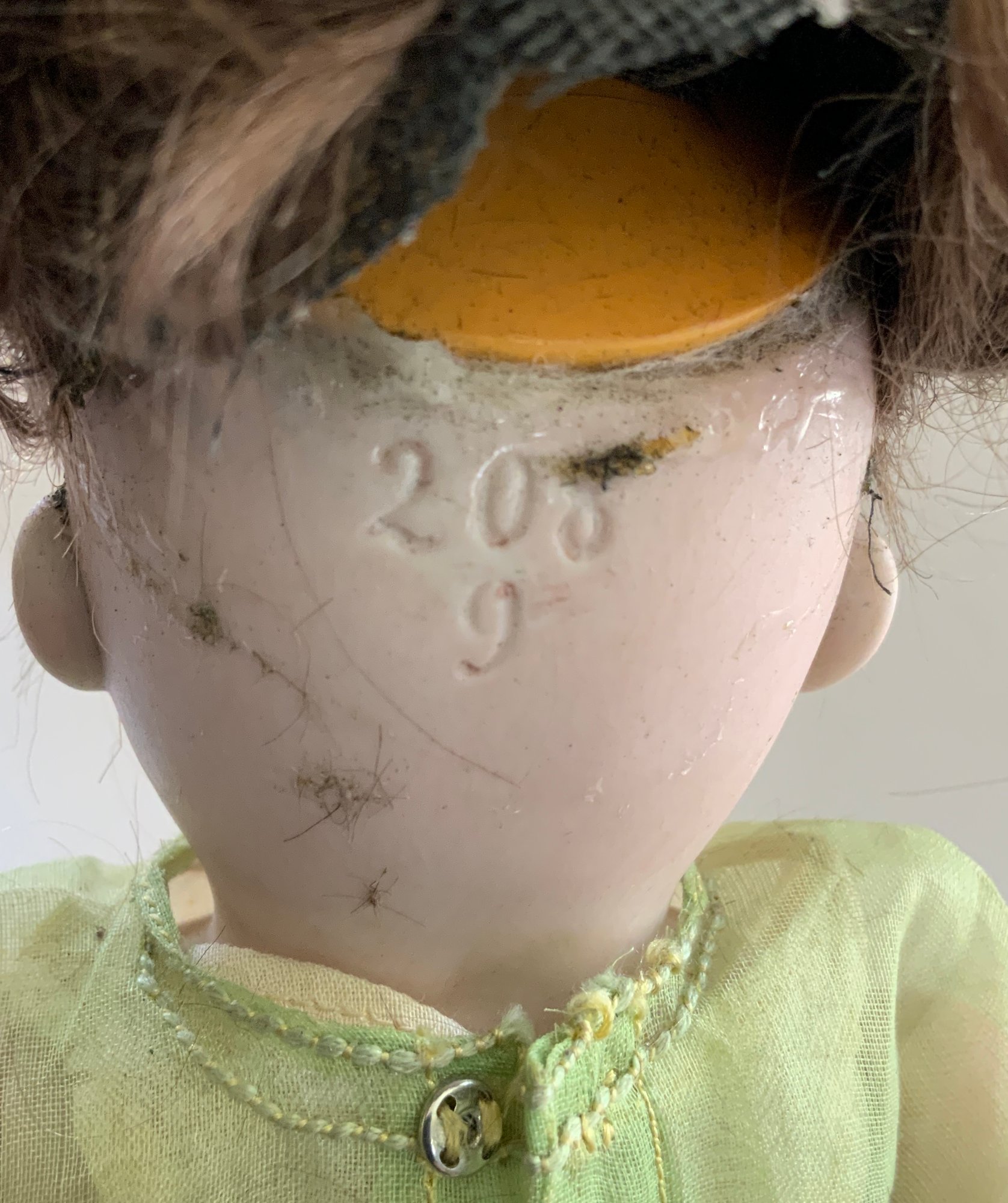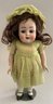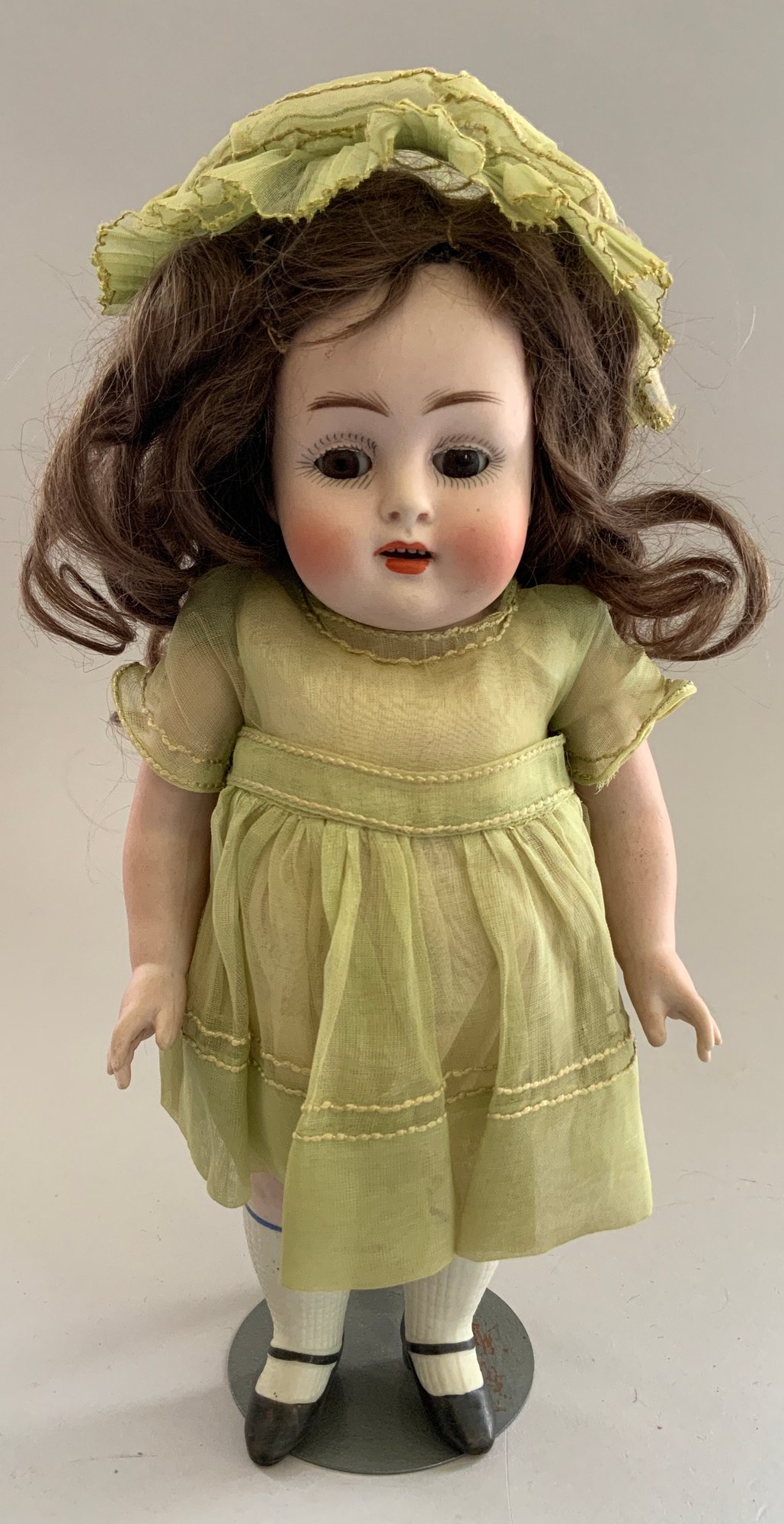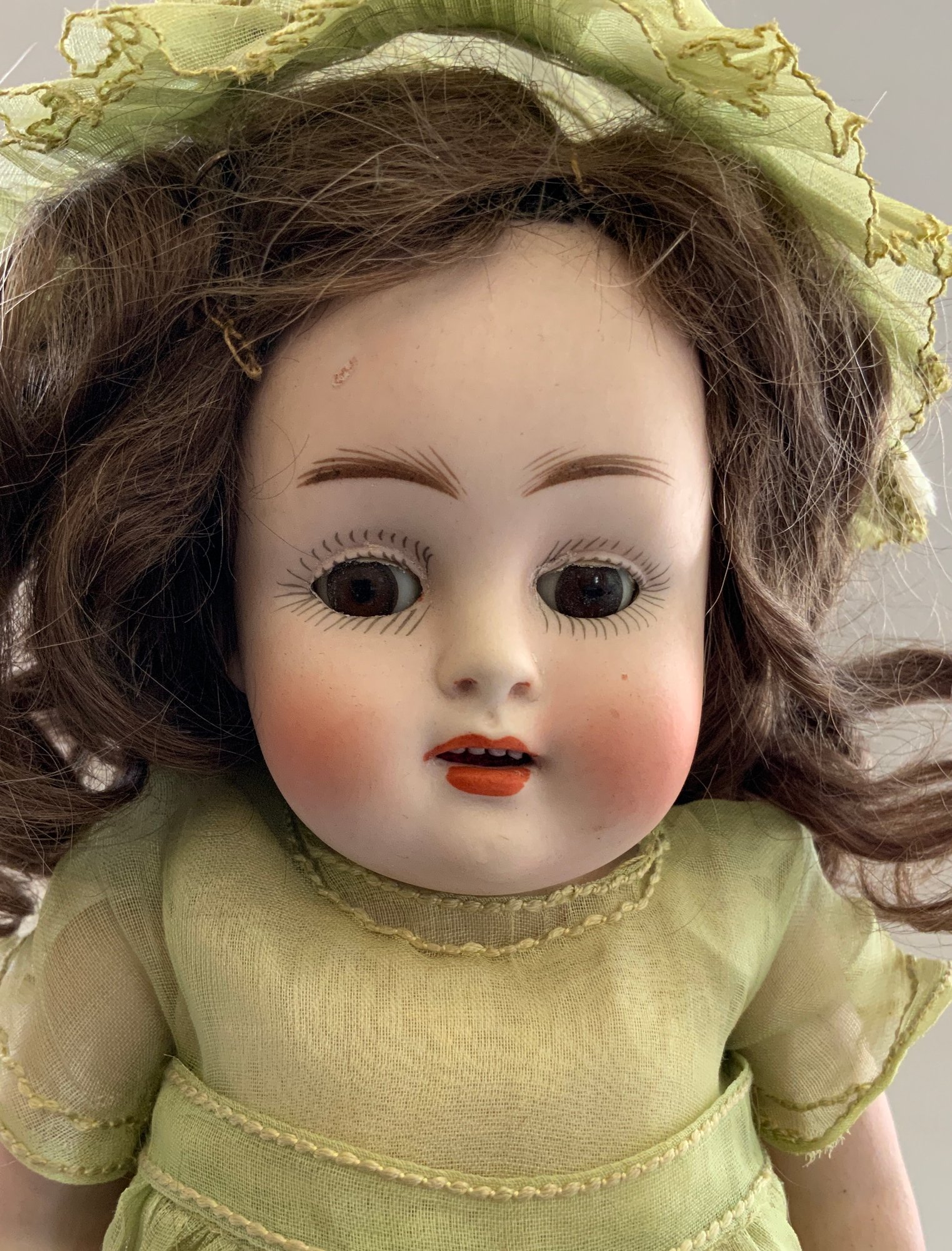 10” All bisque incised 208 9, brown glass eyes, OM with teeth, brown mohair wig, green dress, painted socks & shoes