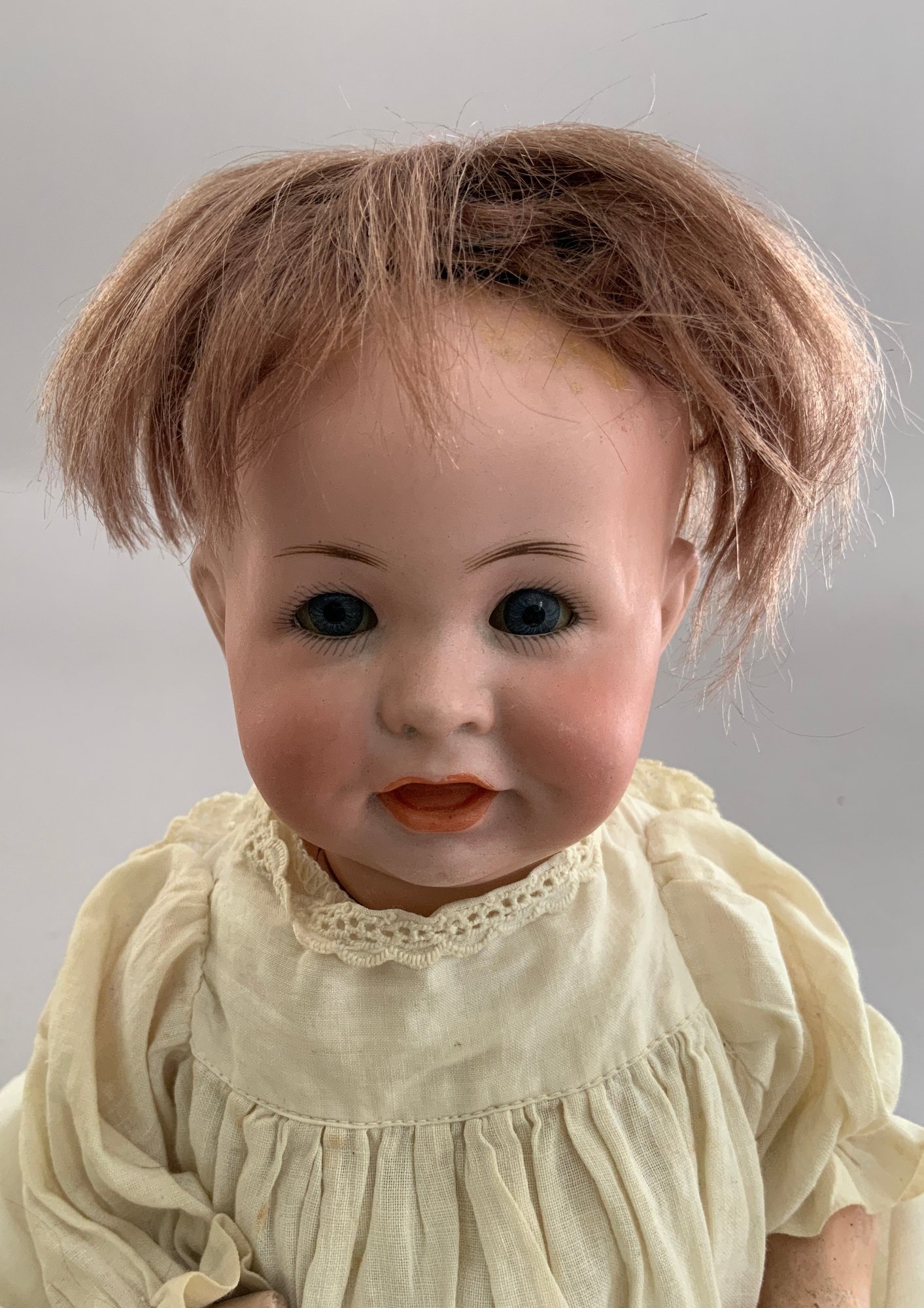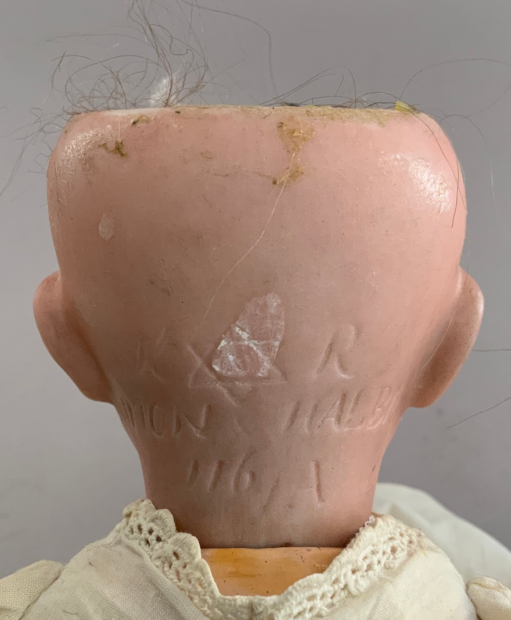 10 ½” Bisque K*R Simon Halbig 116A character baby, blue glass sleep eyes, OM with tongue, compo body, white gown (hairline left front top forehead)