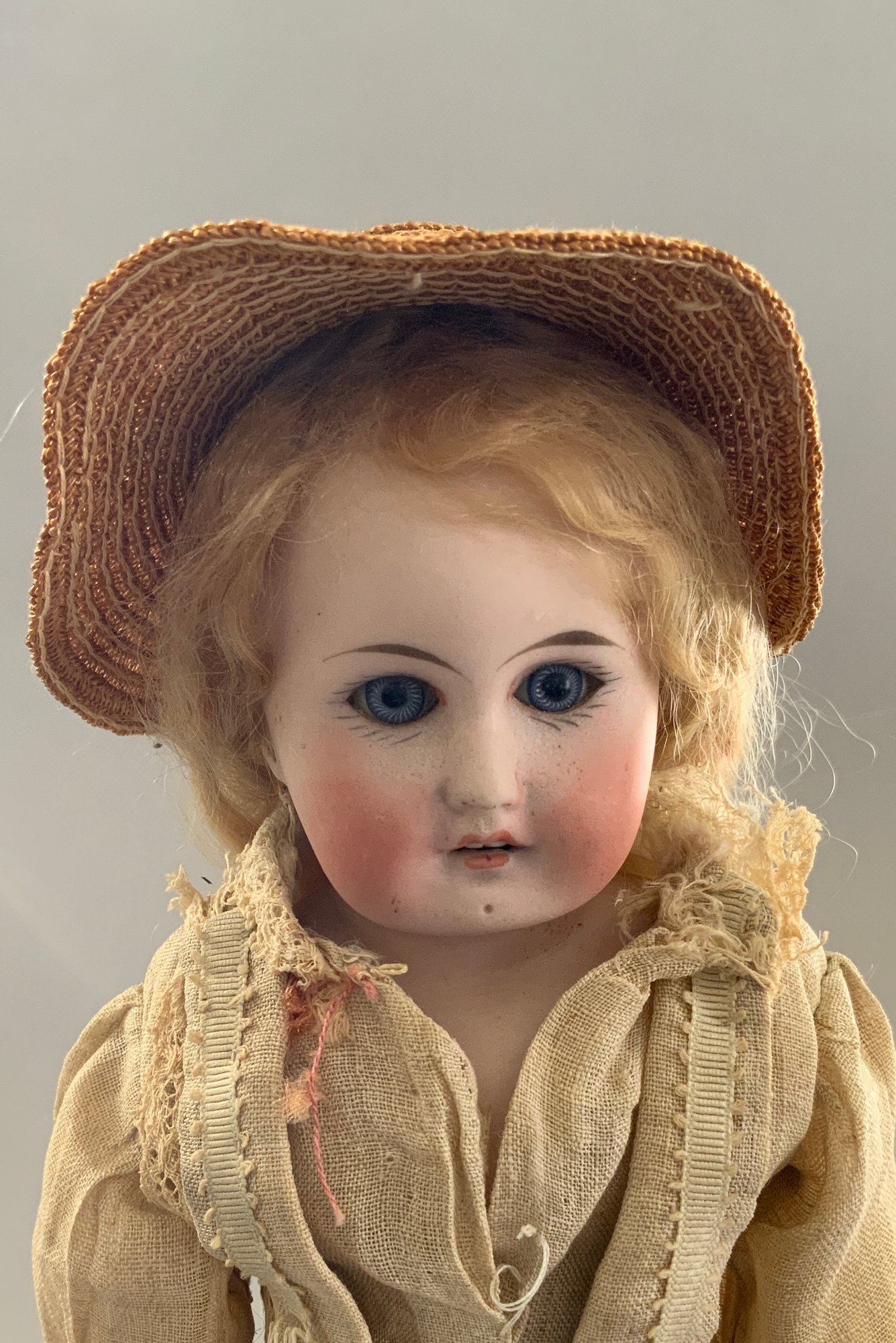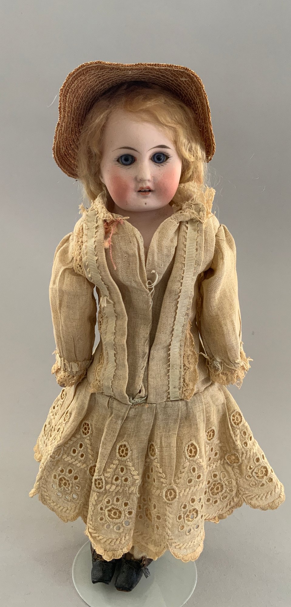 10 ½” Bisque shoulder head, blue glass eyes, PE, OM with teeth, chin dimple, blonde mohair wig, cloth body with bisque arms, off white dress (faded)