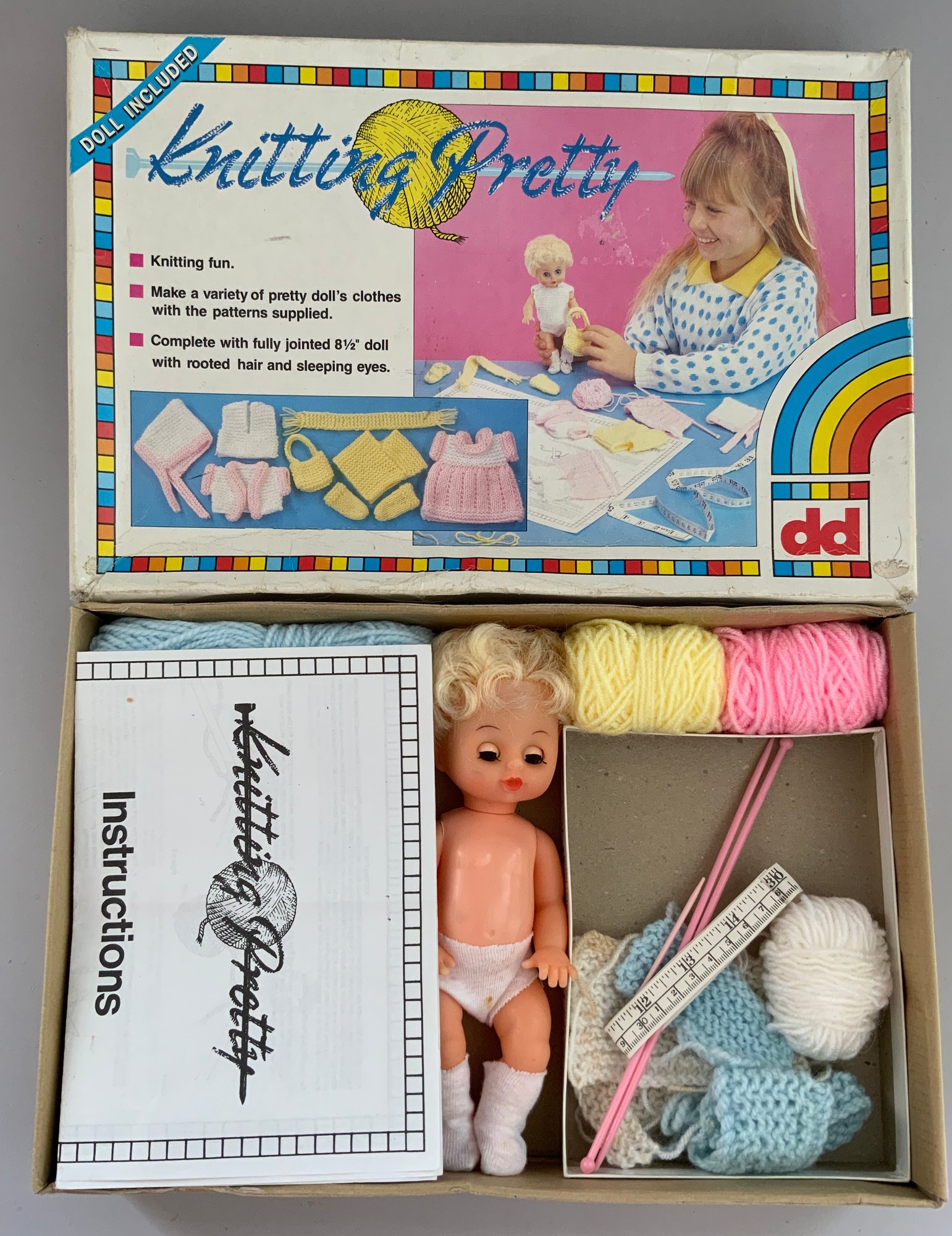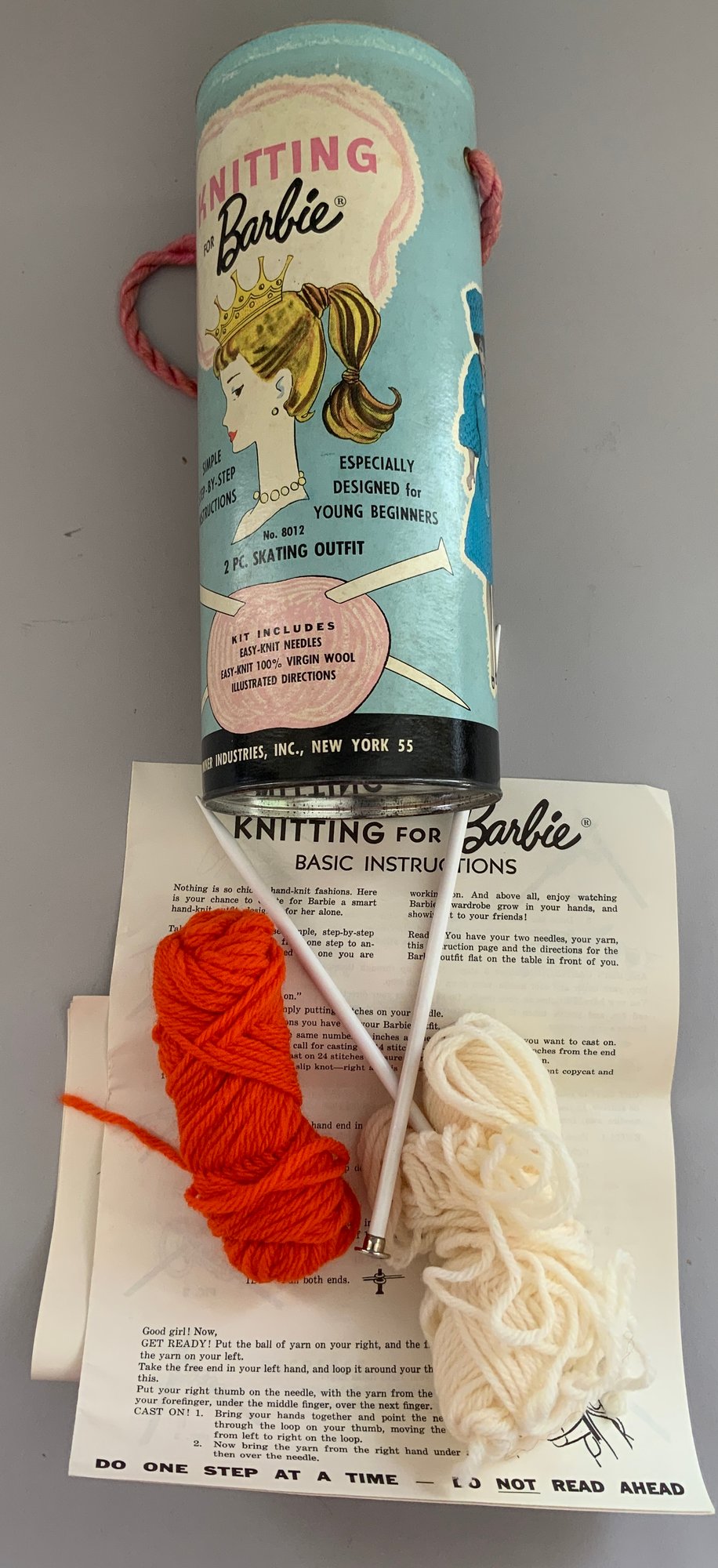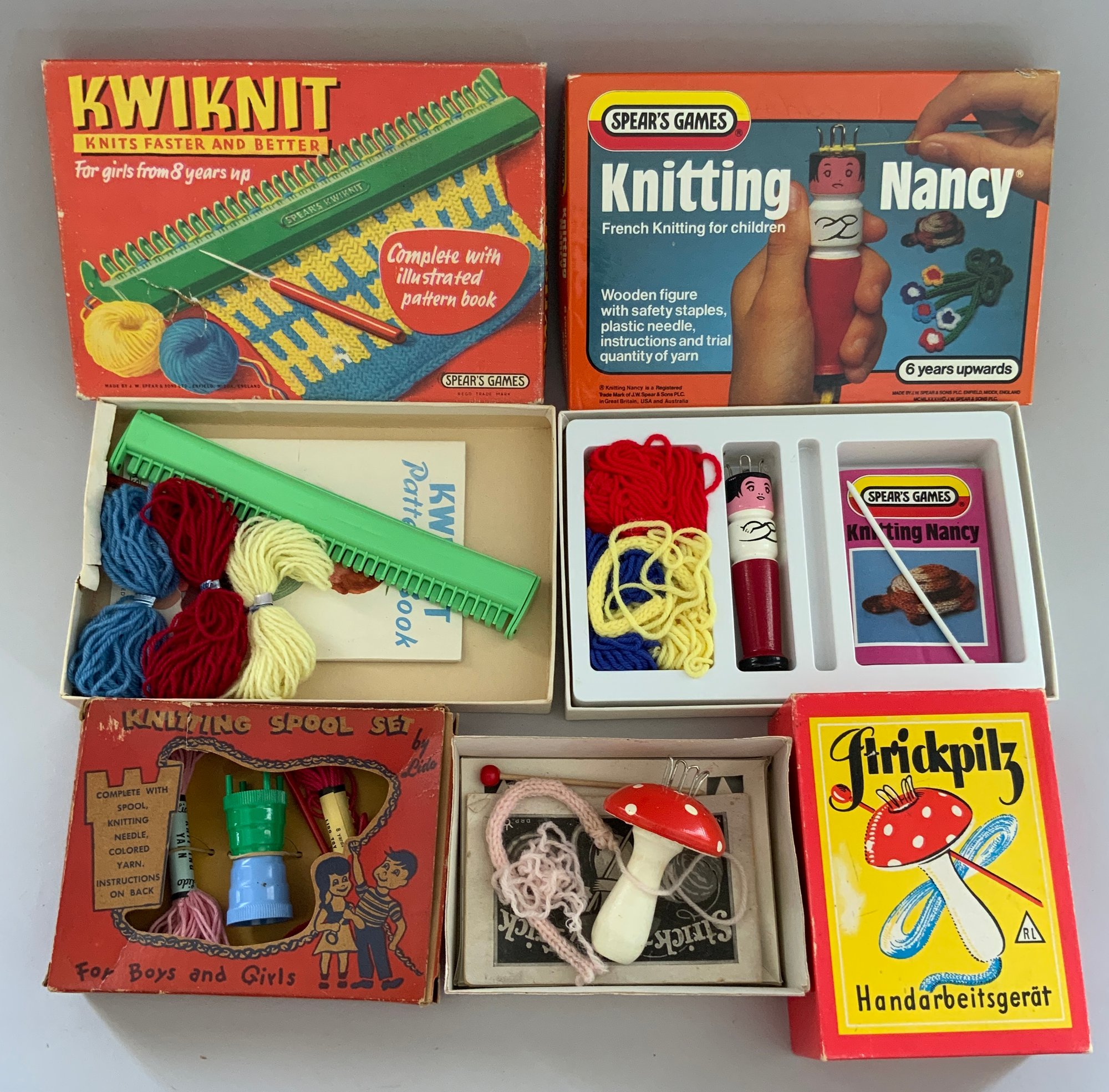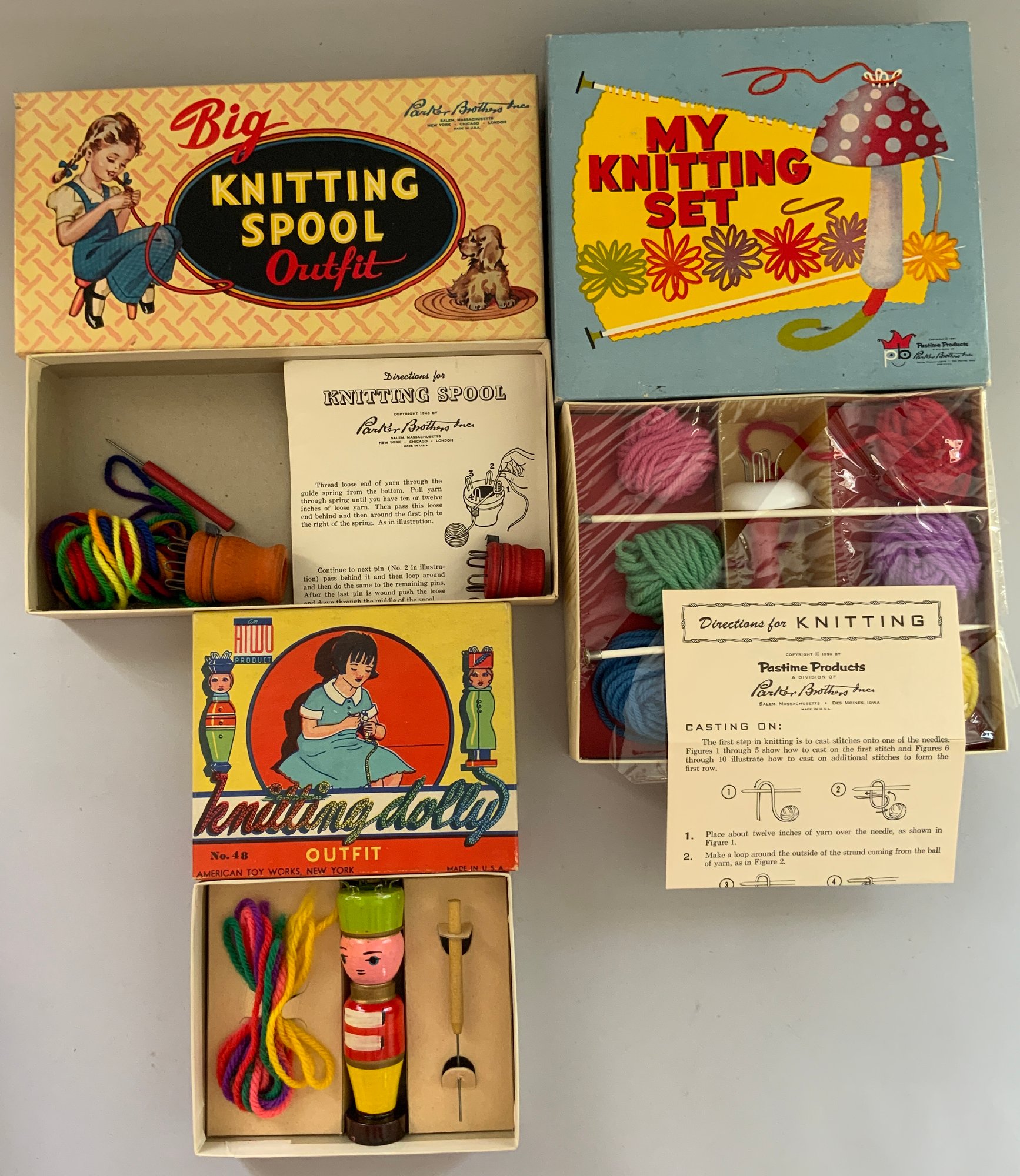 10 – Children’s knitting & crochet sets, Strickpilz Handarbeitsgerat knitting mushroom needlework set 1950’s, Knitting Pretty # 1053, Dekkertoys, 1960’s, Bear Brand Baby Doll Kit # 7540, Bernhard Ulmann Co., 1951, Kniting Dolly Outfit #48, American Toy Works 1940, My Knitting Set, Parker Brothers, 1961, Kwiknit #48-4612, J W Spears & Sons, 1960, Knitting Spool Set # 1082, Lido Toy Co., Knitting for Barbie #8012, Mattel, 1962, Big Knitting Spool Outfit, Parker Brothers 1948, Knitting Nancy # 6001, J W Spears & Sons 1953, original boxes some wear