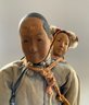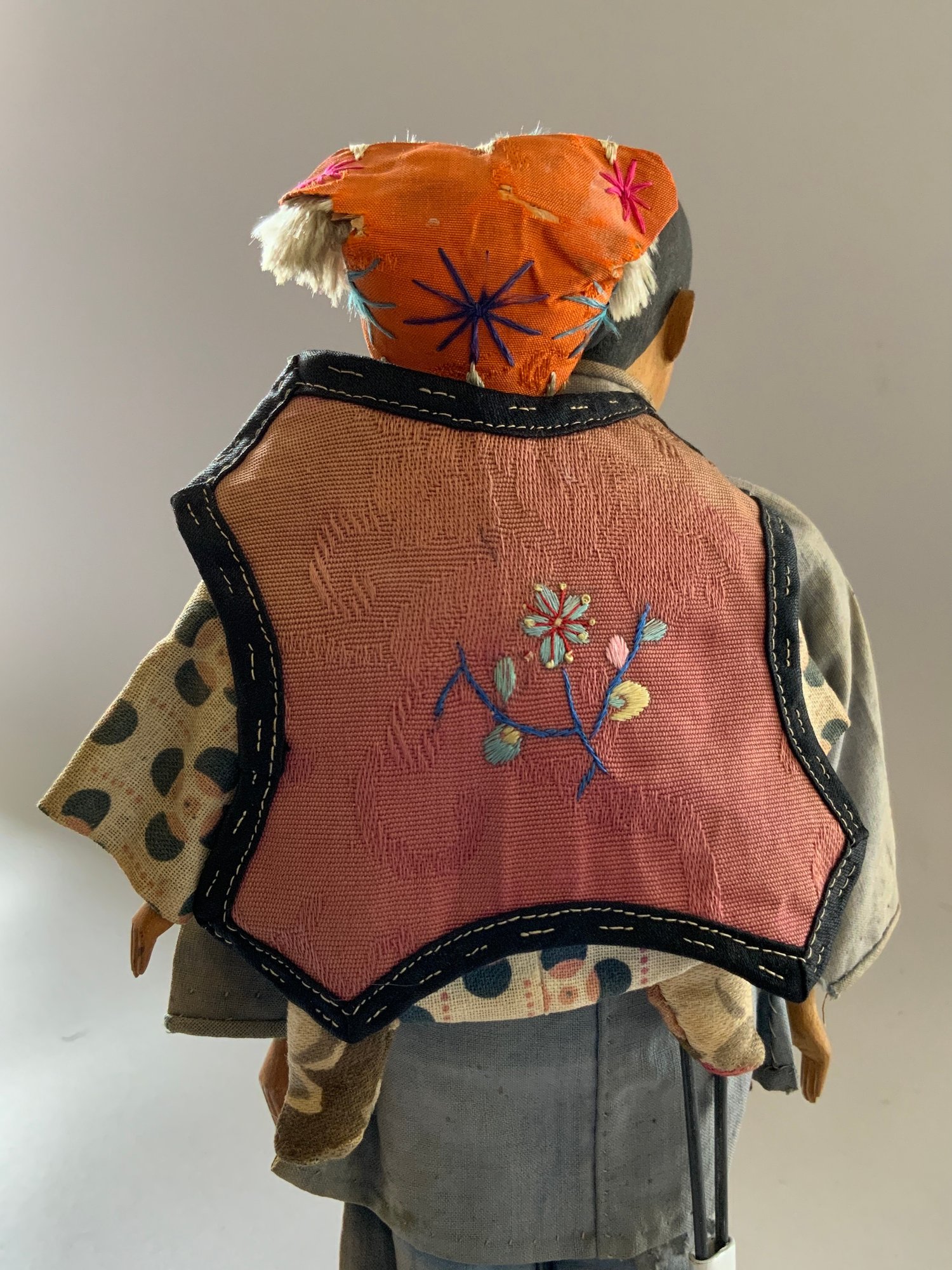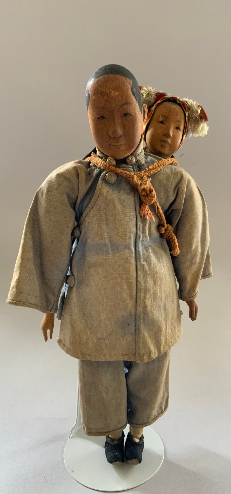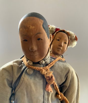 10 ½” Door of Hope doll with 5” child in back pack, carved pear wood, painted features, regional costumes (fading) light forehead rubs
