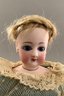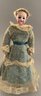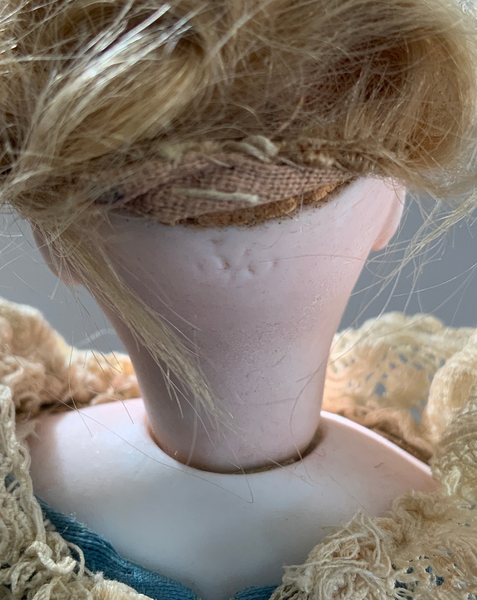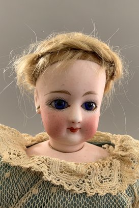 10” French Fashion 1/0?, swivel neck, blue glass eyes, CM, PE, blonde mohair wig, kid body, blue silk dress with shear needlework, (slight cheek roughness)