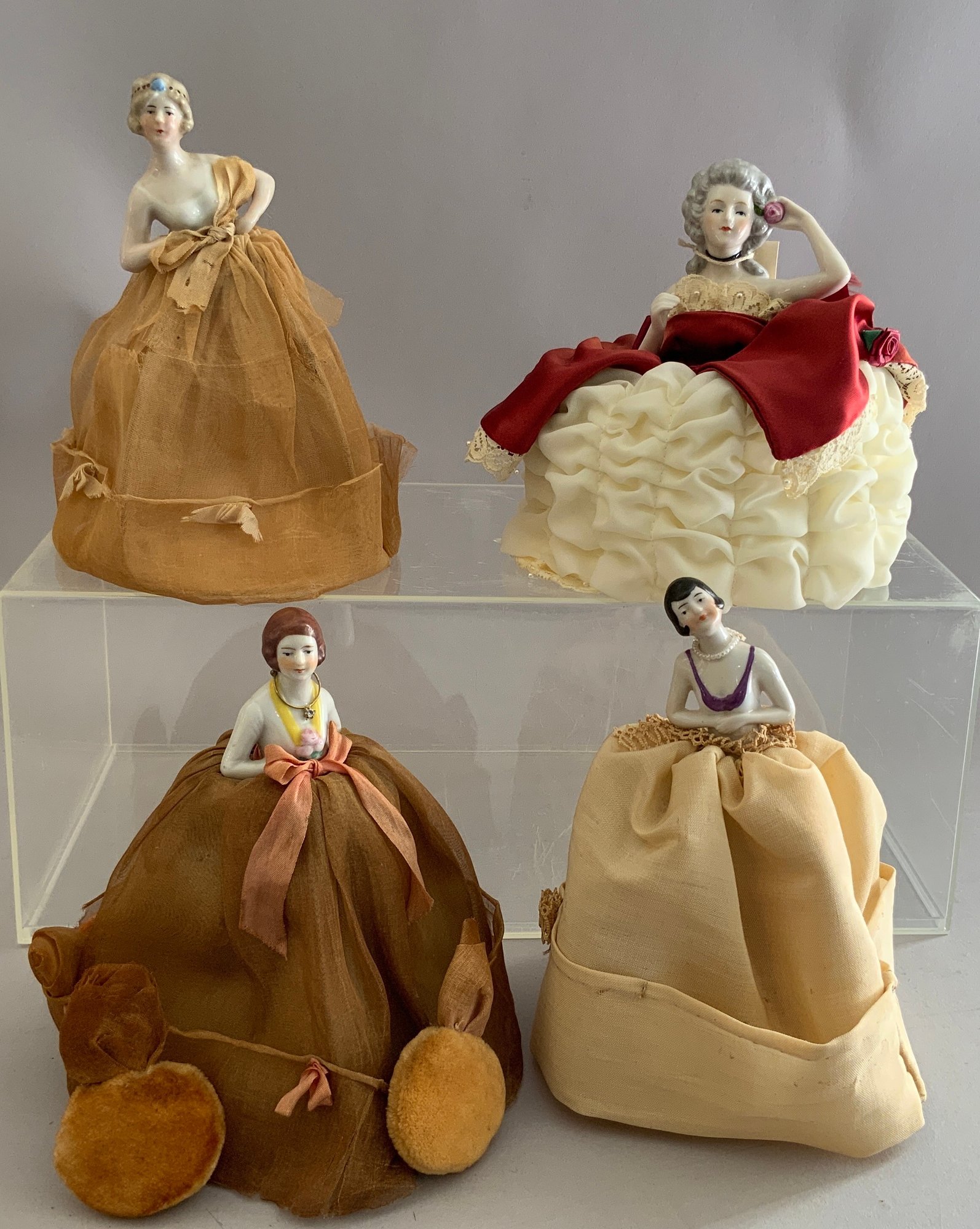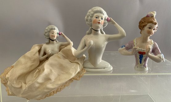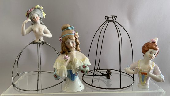 10 – Larger Half Dolls: 5 w/ wire lamp shade frames, 5 are Half Doll only, many have “arms away”, one marked Bavaria – Goebel Mark, one incised #15542, Germany, assorted sizes: 3” - 6 ½”