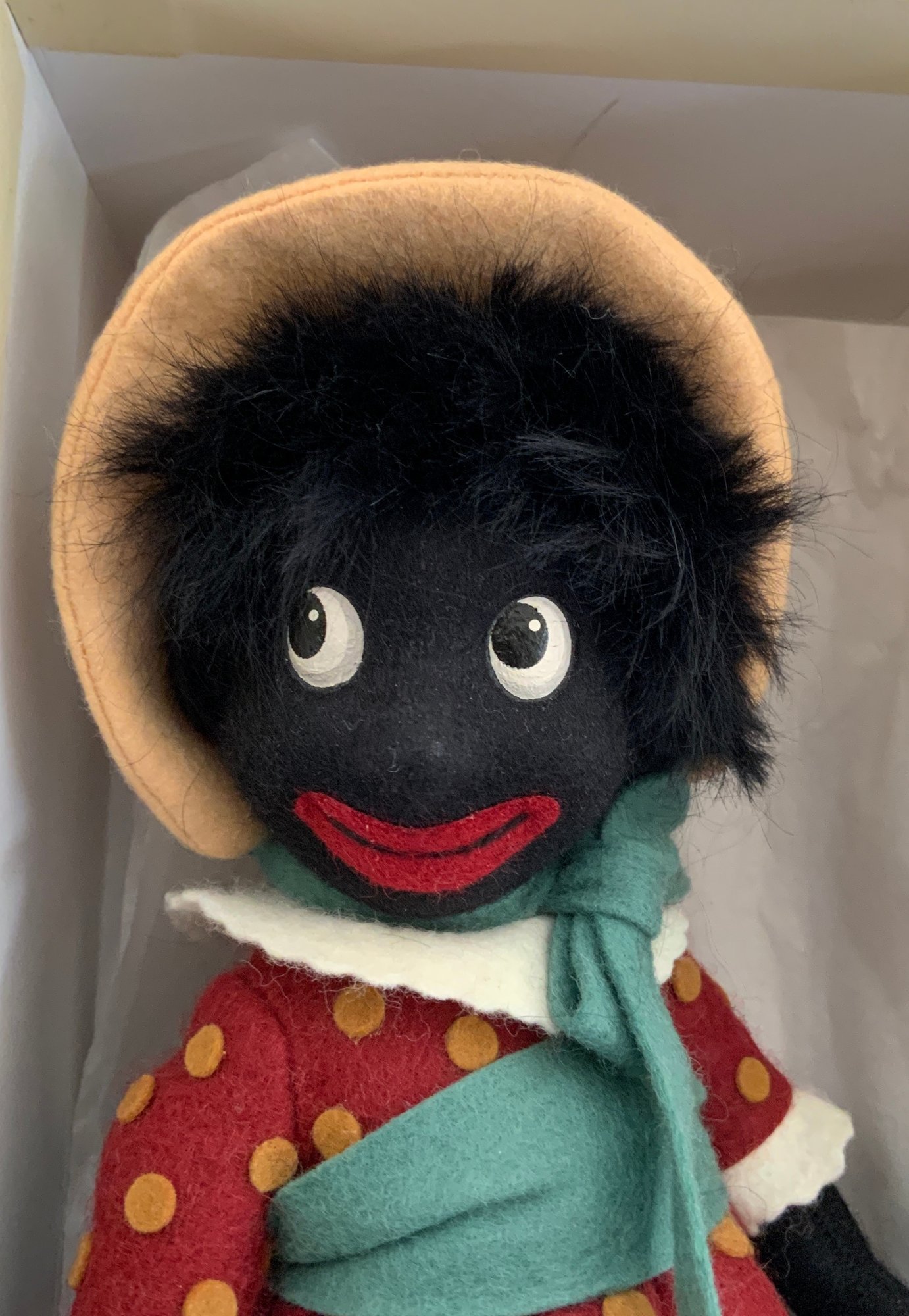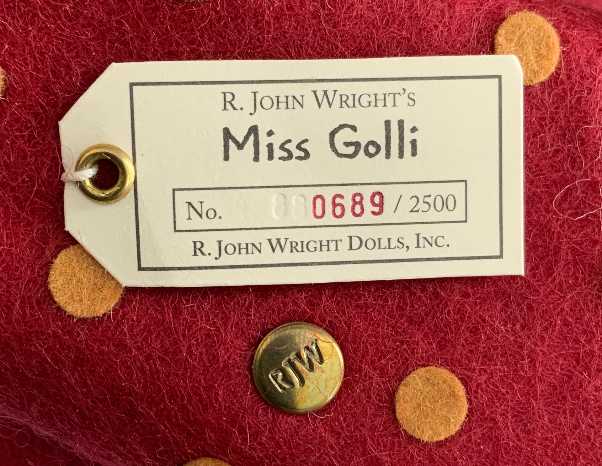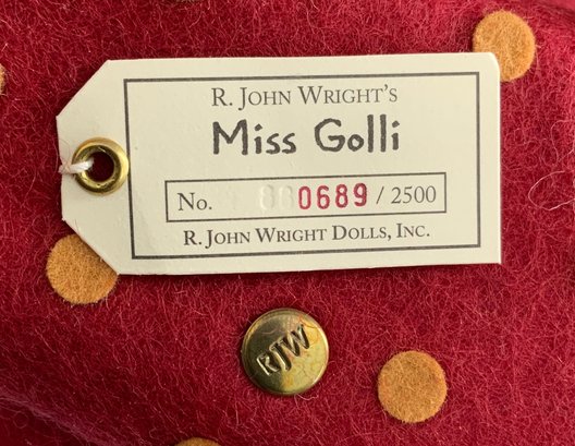 10” R John Wright felt doll. “Miss Golli”, #689, painted features, red felt polka dot dress, original box & certificate