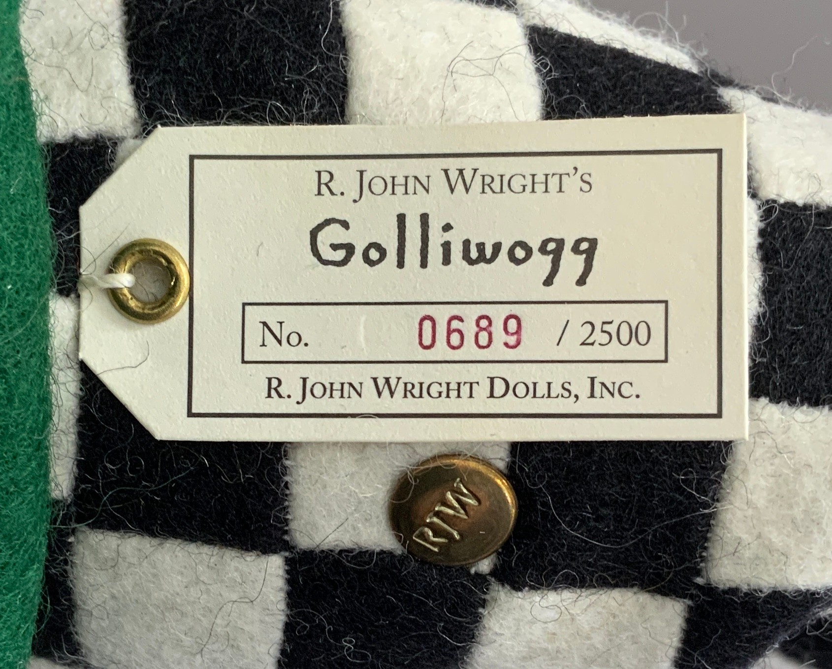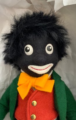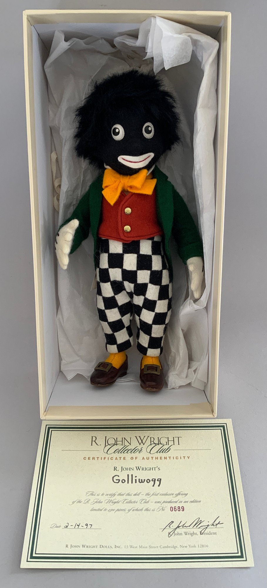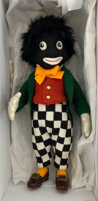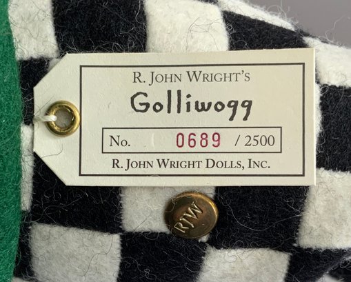 10” R John Wright felt doll, “Golliwogg” 689, painted features, black/white check pants, certificate & original box, excellent condition