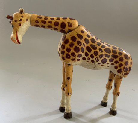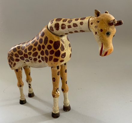 10” Schoenhut wood Giraffe, painted features, glass eyes, double jointing of neck, closed mouth, wood horns, leather ears, no tail, (rubs & wear, loose neck joint)