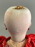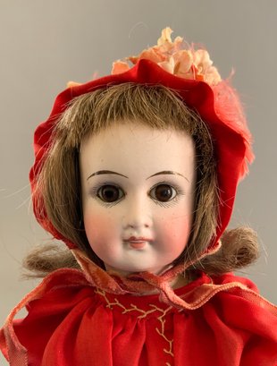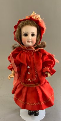 11” Belton type, brown glass eyes, O/C mouth, PE, brown mohair wig, straight wrist compo body, red dress, black shoes, (some tiny facial dark flecks)