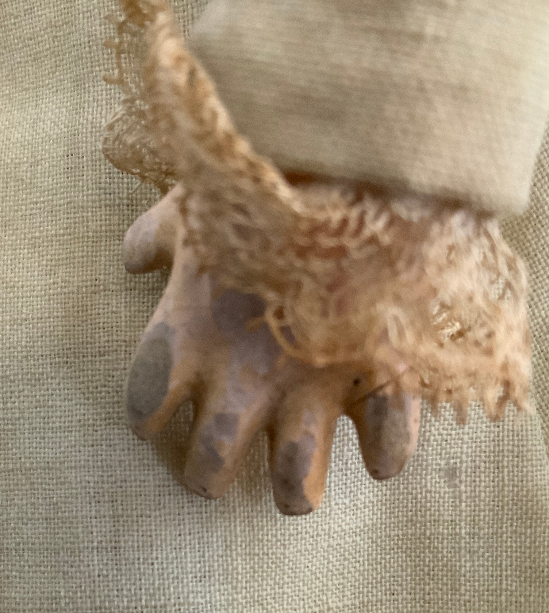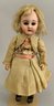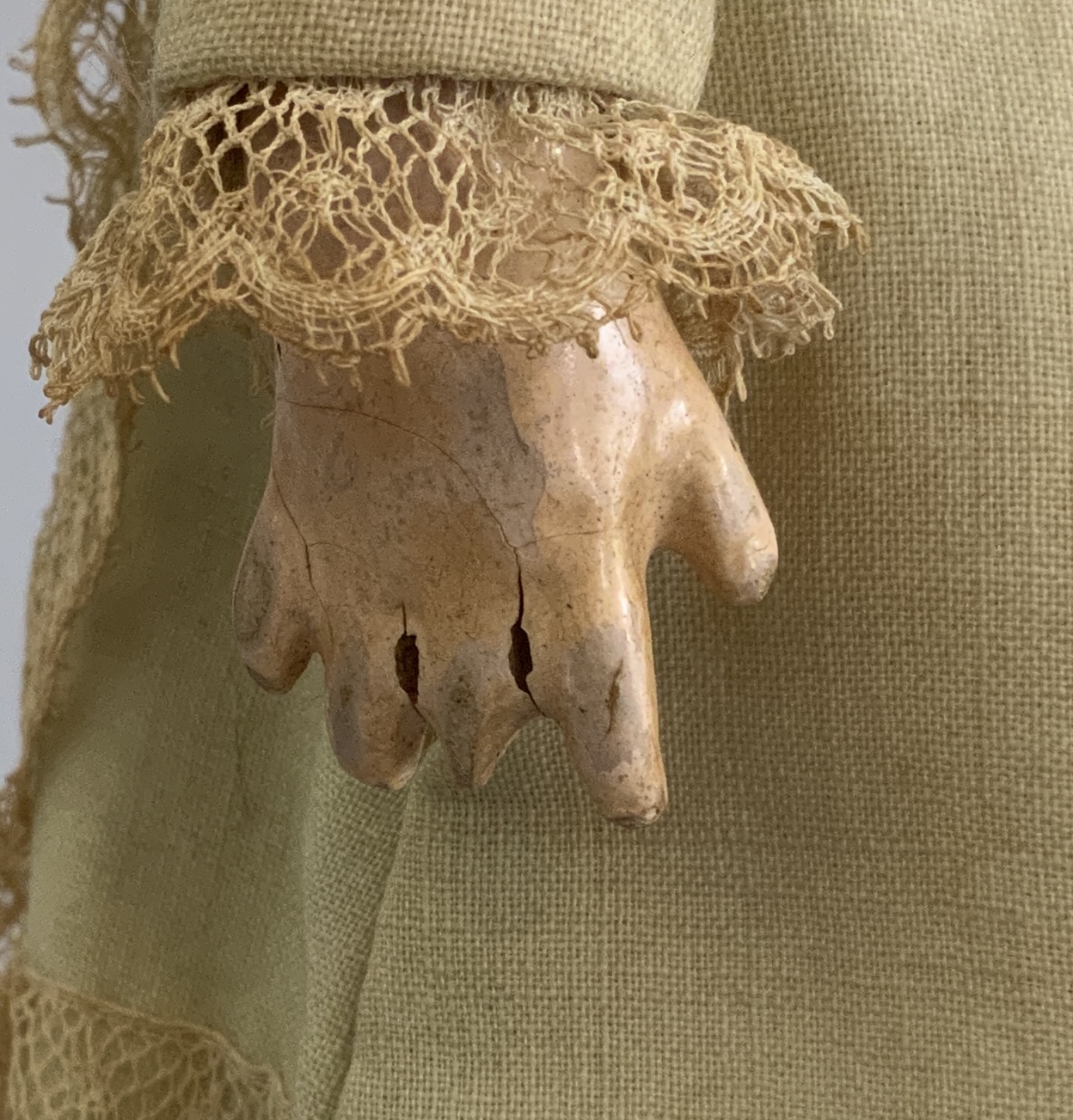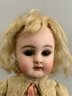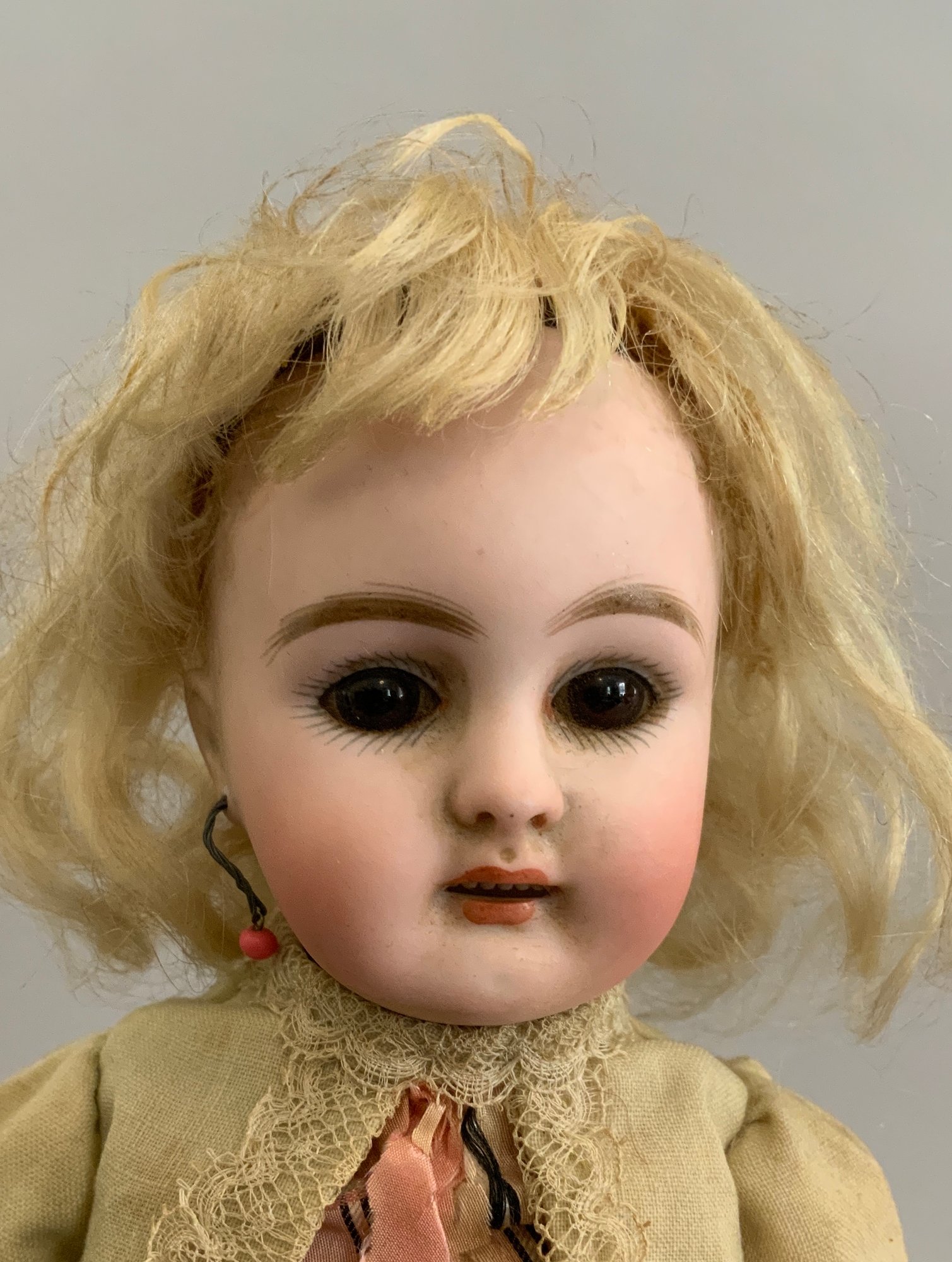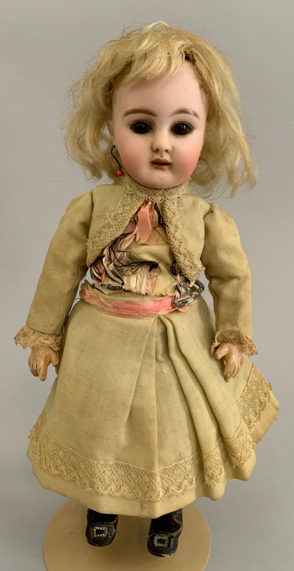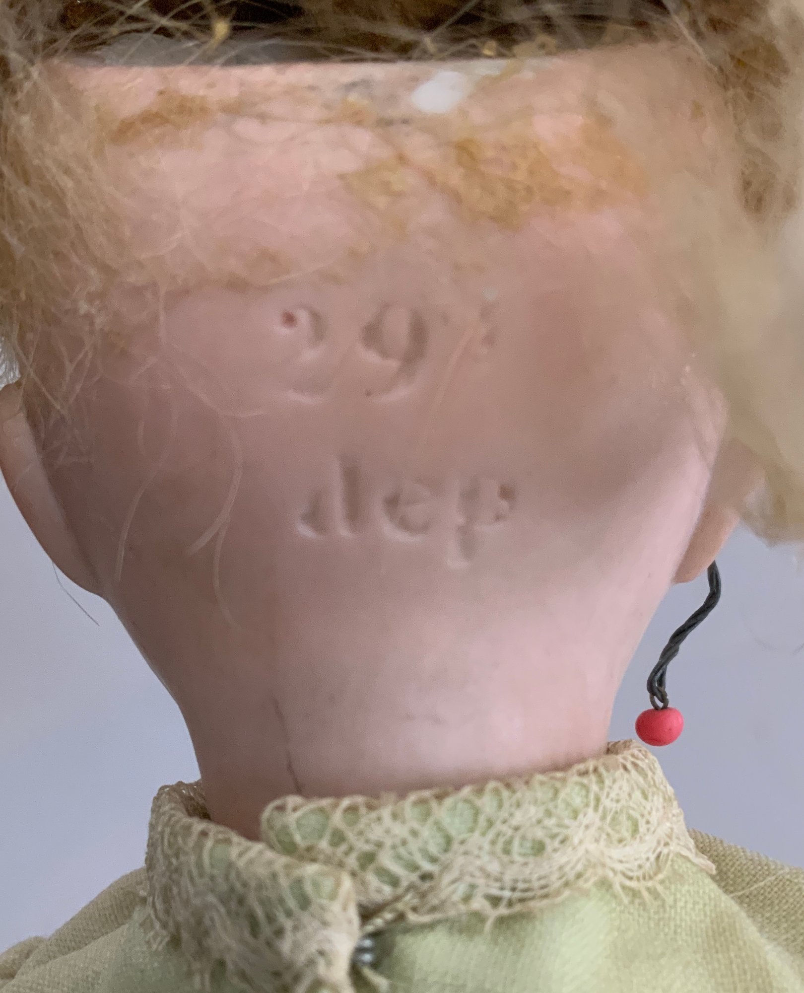 11 ½” Bisque 29/7?, brown glass eyes, OM with teeth, PE, blonde mohair wig, BJCB ( right finger damage), green dress