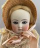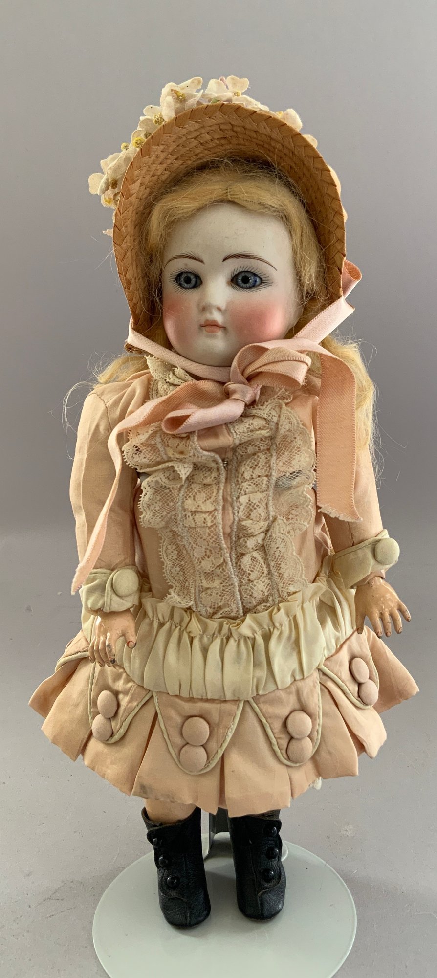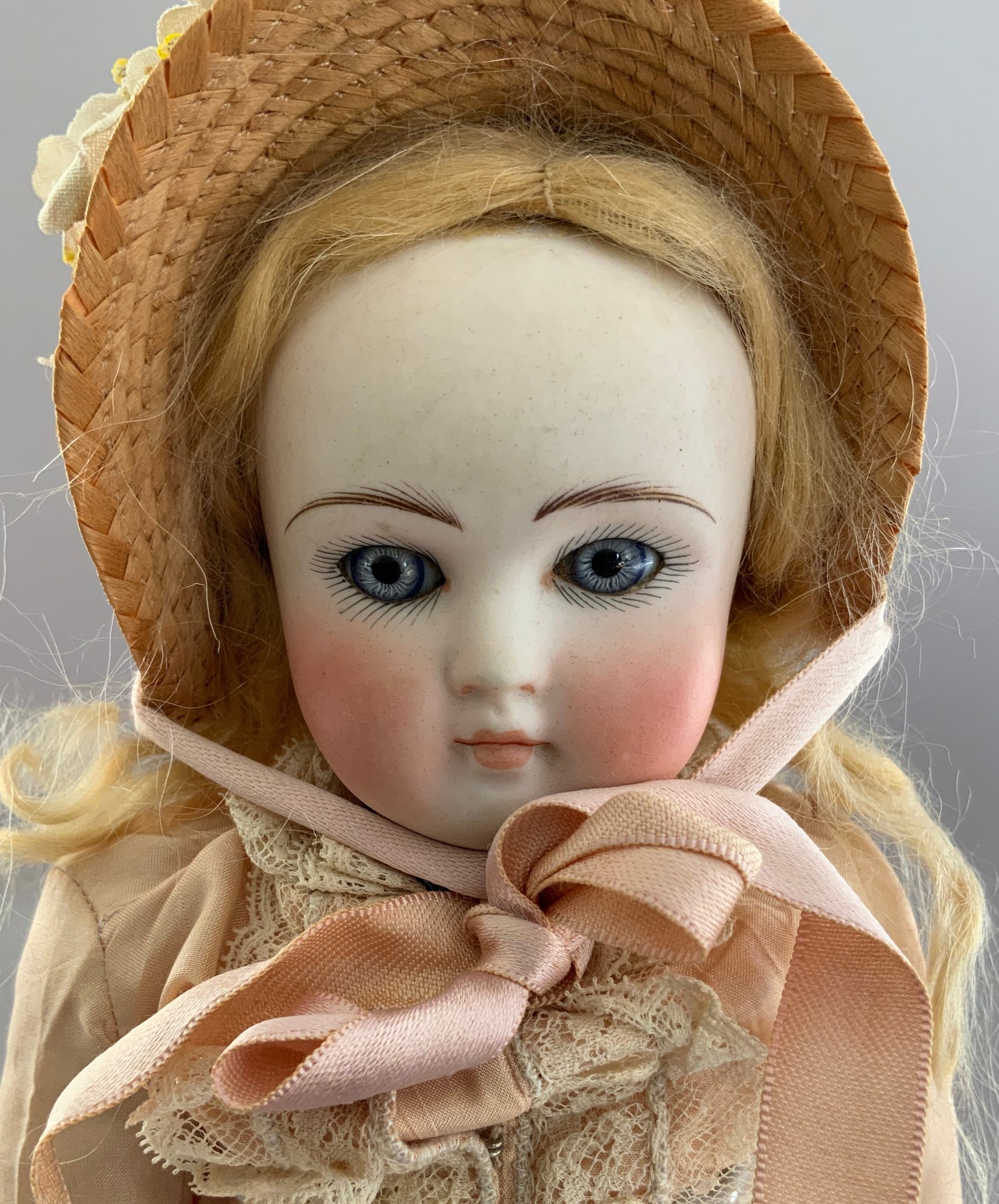 11 ½” Bisque Belton-type, blue glass paper weight eyes, CM, blonde mohair wig, BJCB, pink silk French style outfit (tiny spec over right eye)