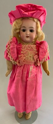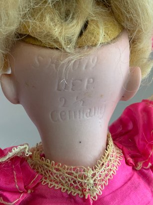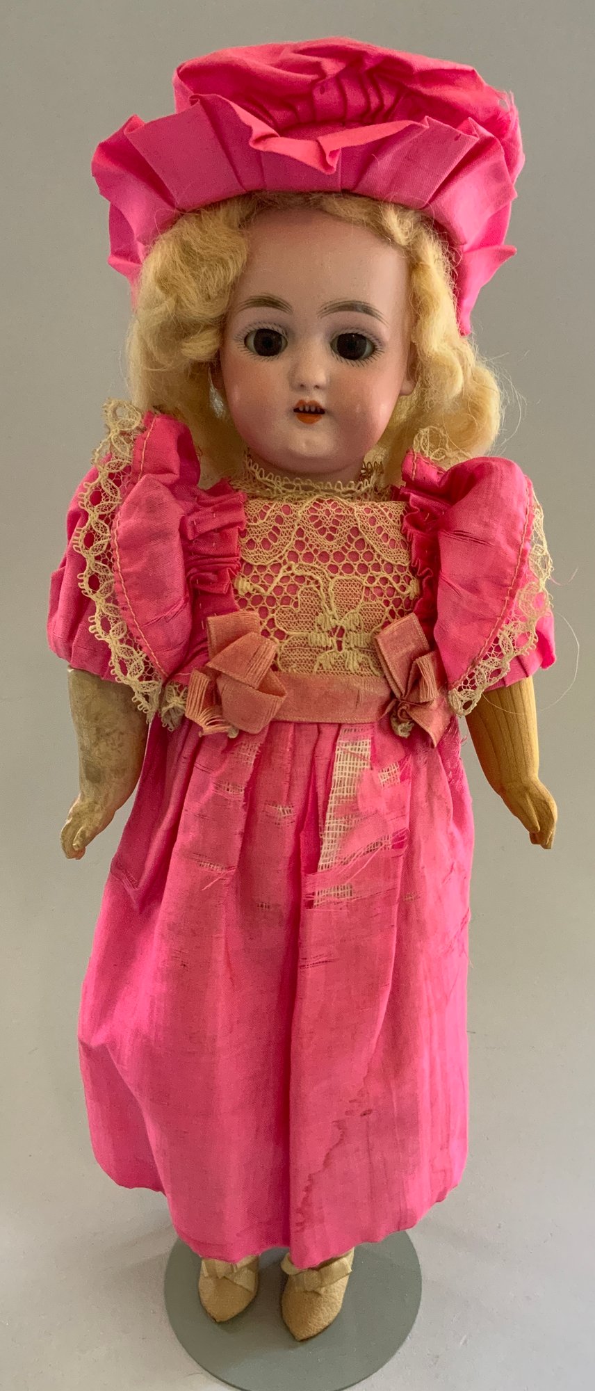 11” Bisque S&H 1079, brown glass sleep eyes, OM with teeth, blonde mohair wig, BJCB (replaced wood left arm), silk dress (melting)