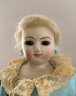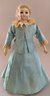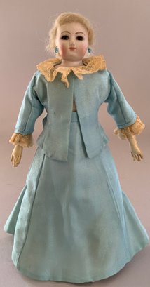 11” Bisque shoulder head fashion, brown glass eyes, CM, blonde mohair wig, cloth body with kid arms, blue dress (can’t make out marks on the front of the shoulder plate, last letter is a G)