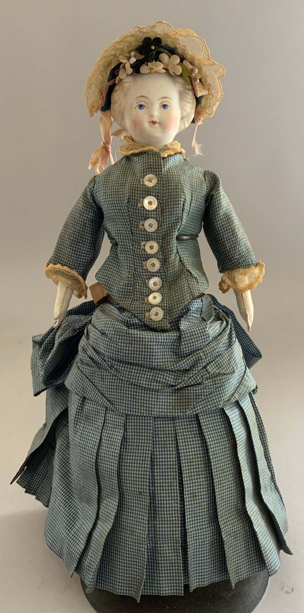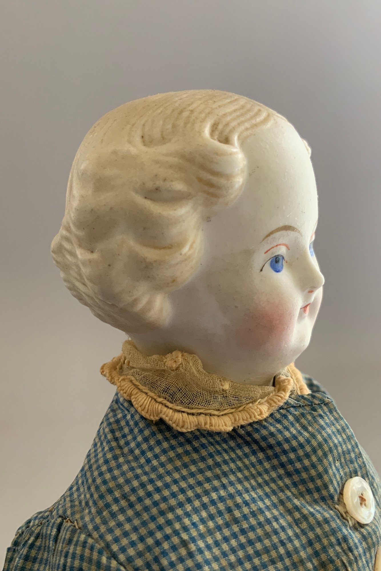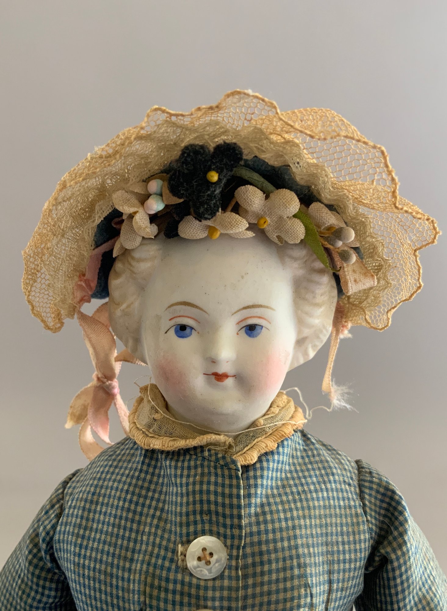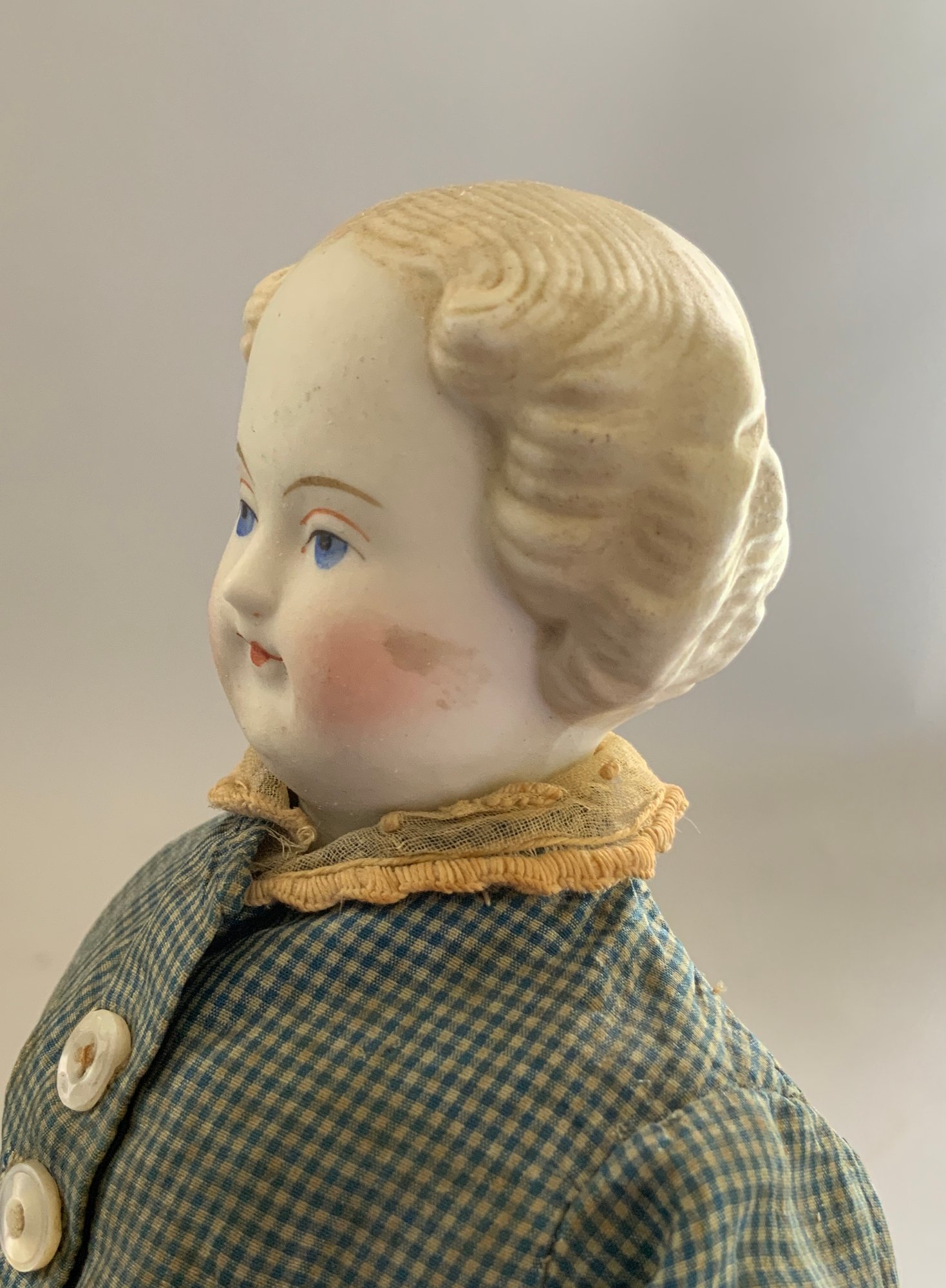 11 ½” Blonde hair Parian, painted features, kid body, antique blue silk dress, leather booties