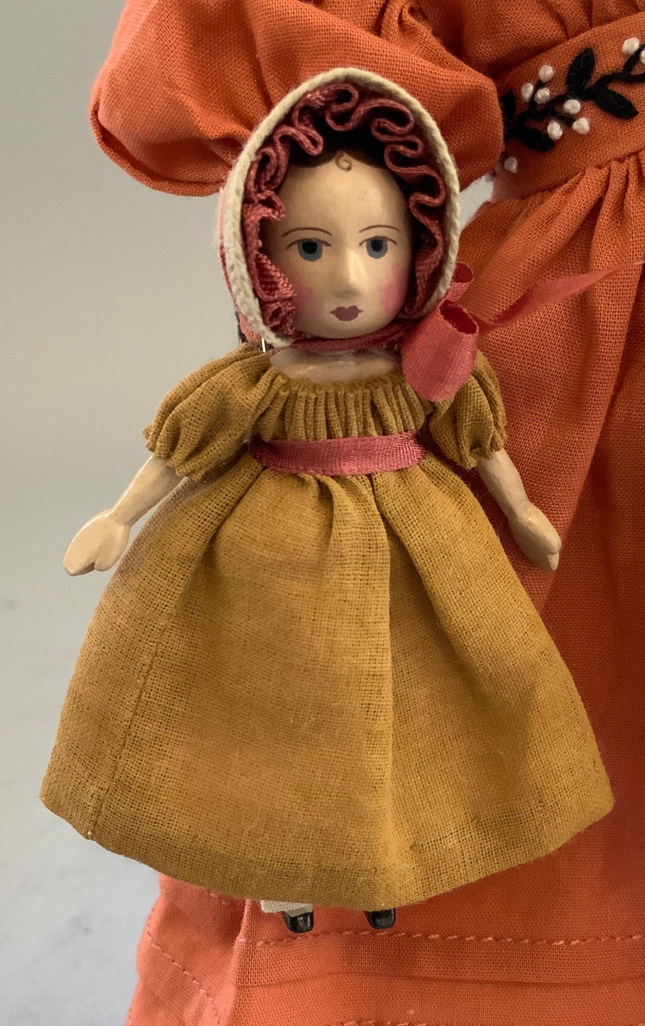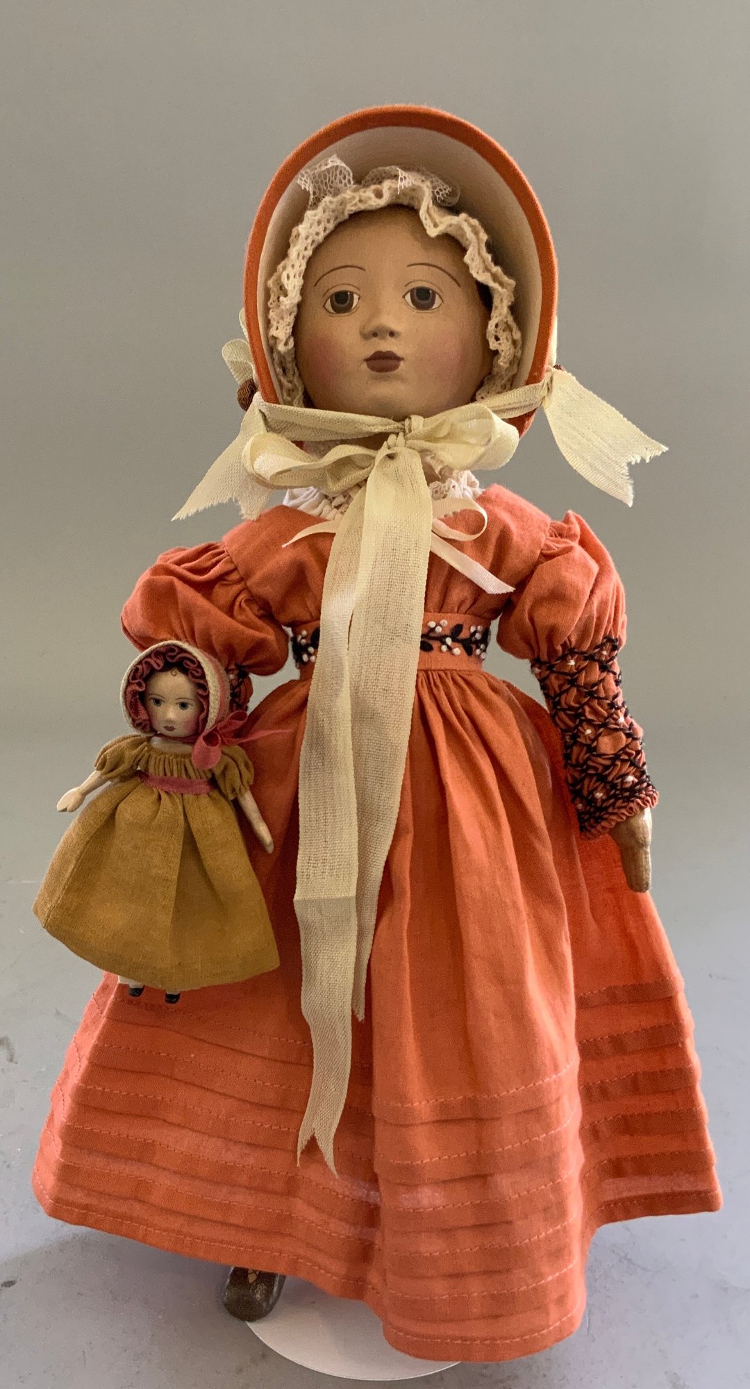 11” Gail Wilson Izannah Walker artist doll for UFDC Convention, molded & painted face & features, embroidered orange dress, holding a 3” toy doll, signed 2011