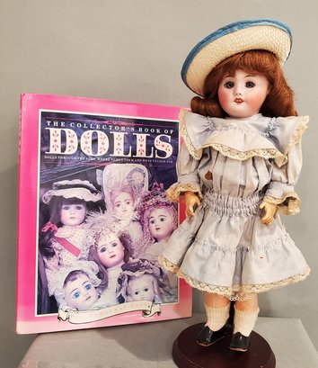 12.5" SFBJ MOLD 60 BISQUE DOLL W/ DOLL BOOK - SFBJ 60, BISQUE HEAD (HAIRLINE NOTED TO BACK OF HEAD), BLUE STATIONARY EYES, OPEN MOUTH W/ TEETH, BALL-JOINTED BODY (1 FINGER REBUILT), VINTAGE WIG, BLUE DRESS W/ HAT, DOLL REFERENCE BOOK