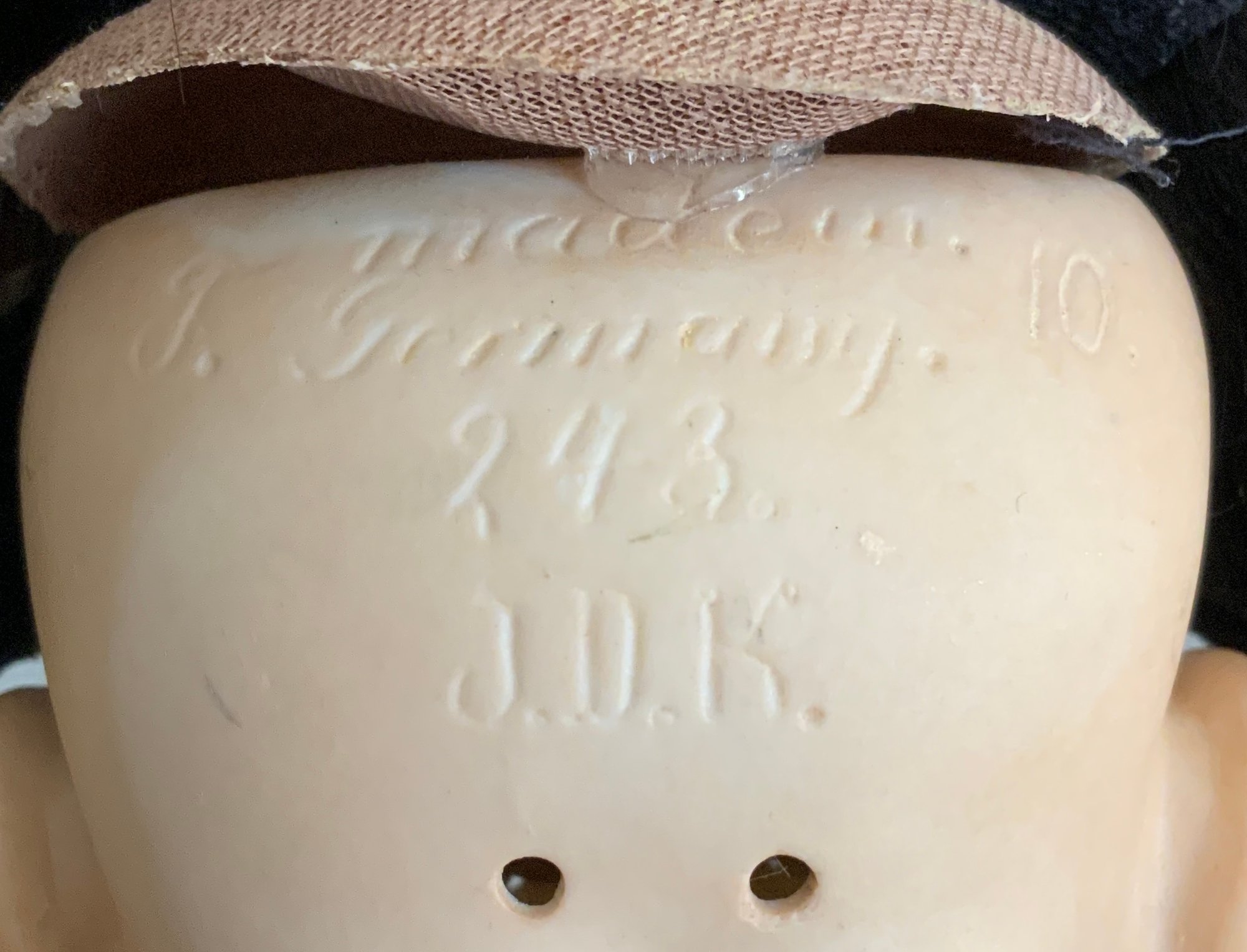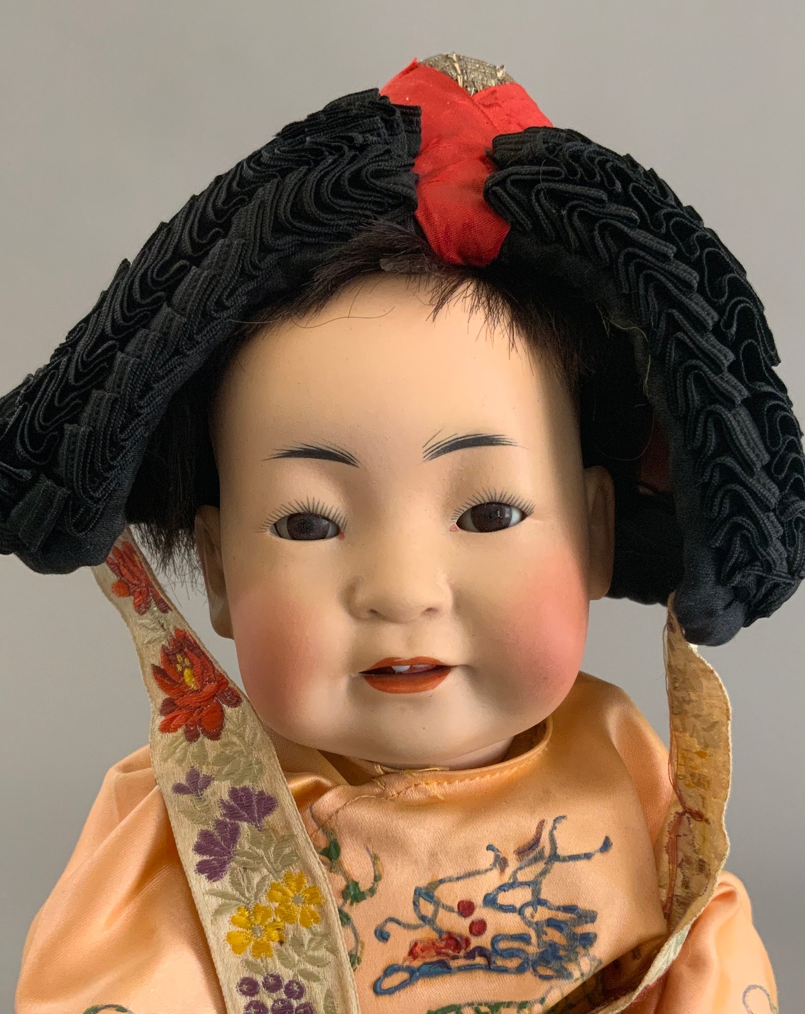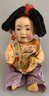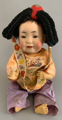 12” Bisque JDK 243 Oriental doll, brown glass sleep eyes, OM with teeth & tongue, black mohair wig, compo body, purple/orange Oriental outfit, elaborate hat, (professional repairs to forehead)