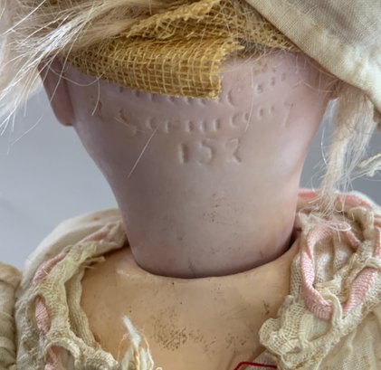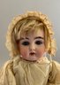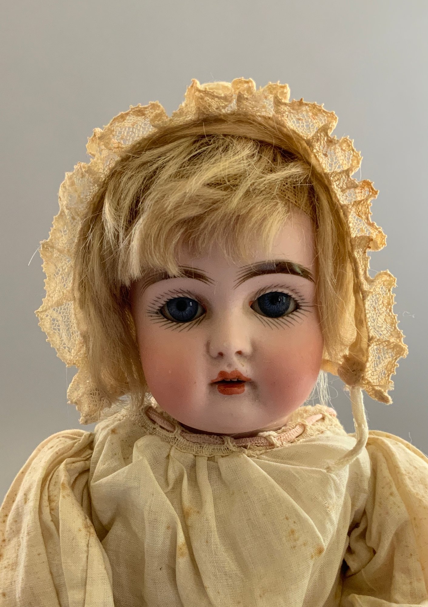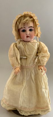 12” Bisque Kestner 152, blue glass sleep eyes, OM with teeth, blonde mohair wig, BJCB, white dress (stains),