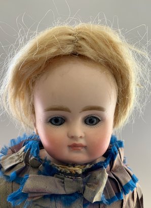 12” Bisque turned shoulder head, blue glass sleep eyes, CM, blonde mohair wig, kid body with bisque arms, silk antique dress (melting, wig glued down, eyes reset?)