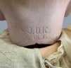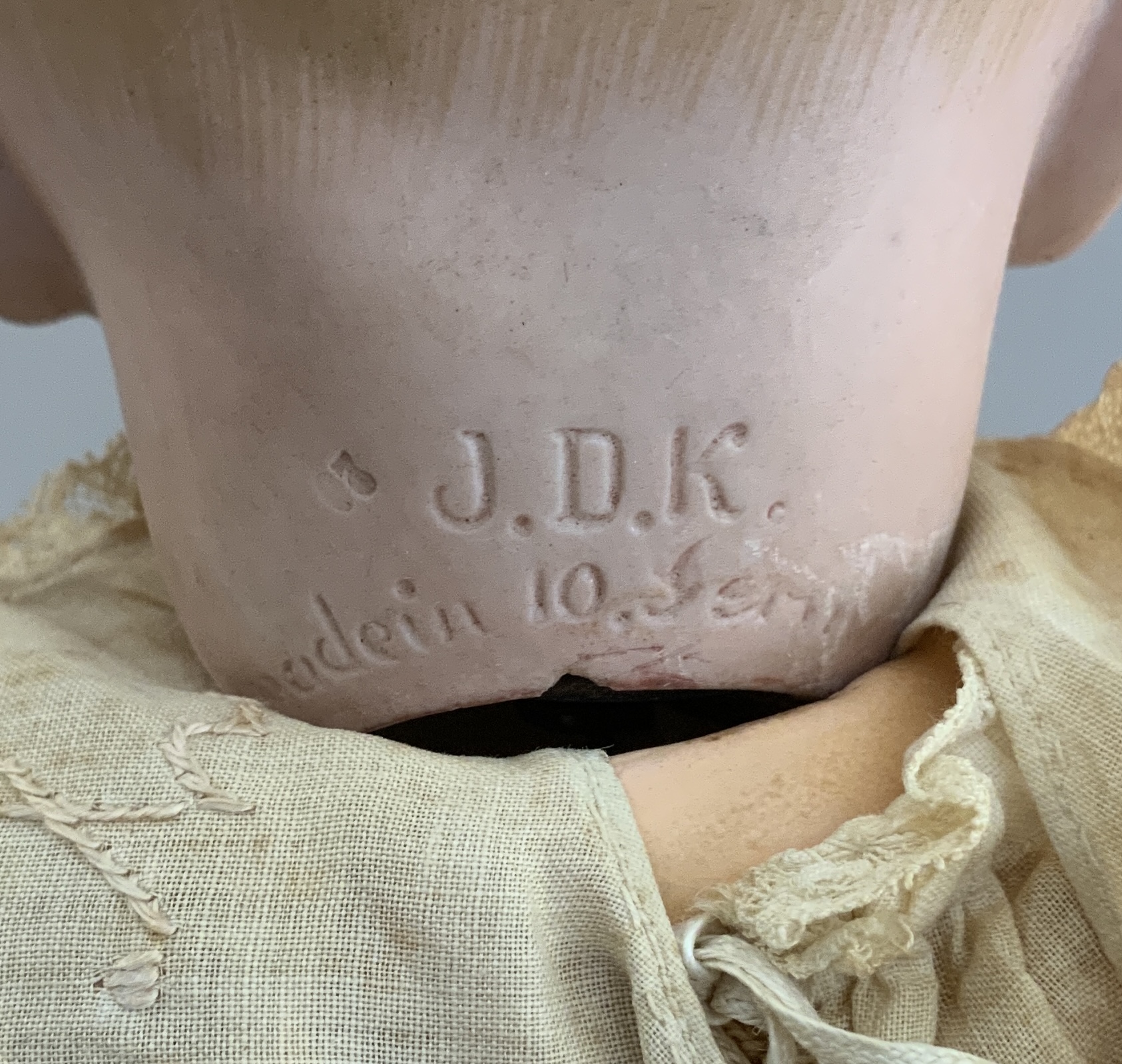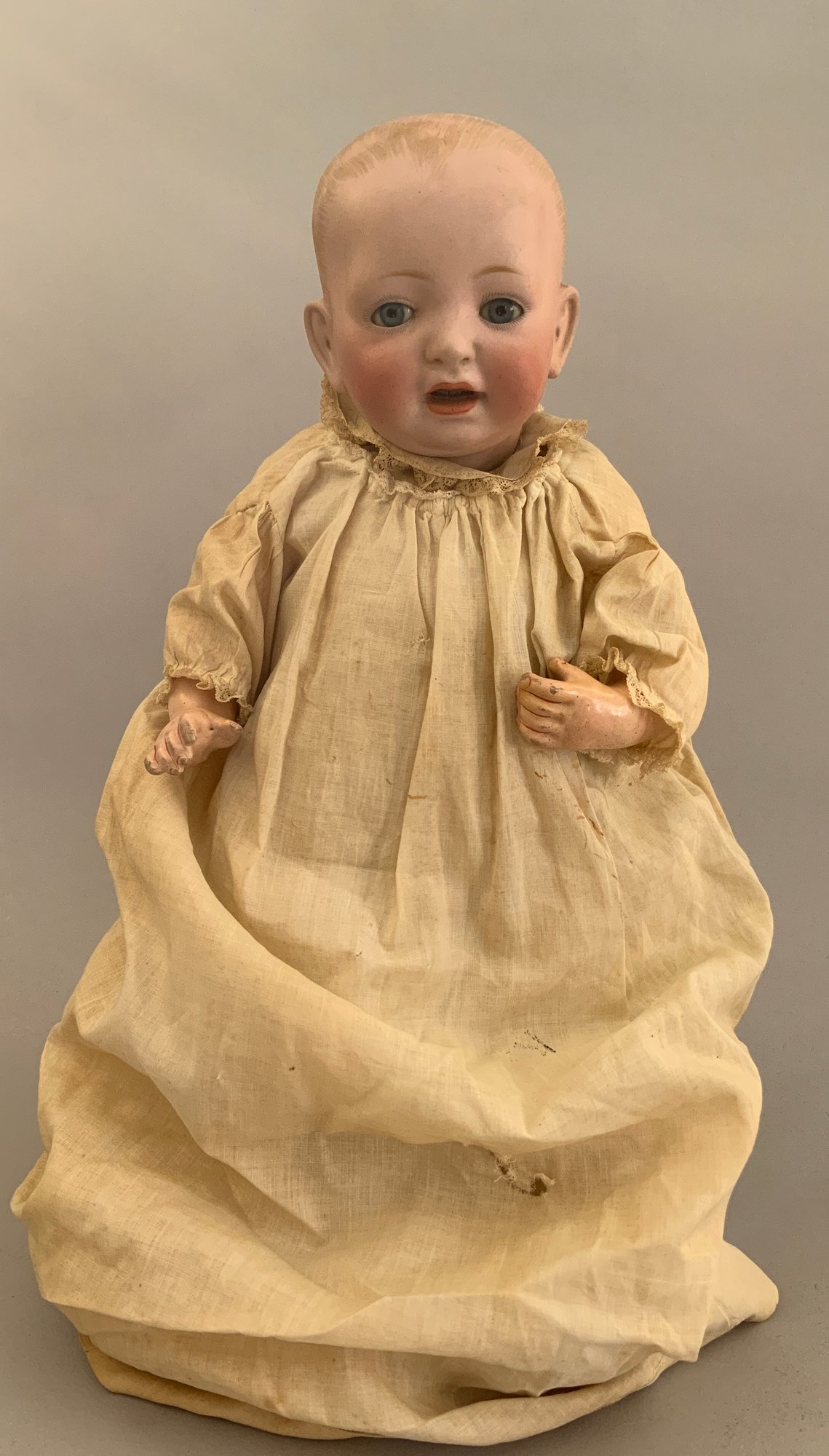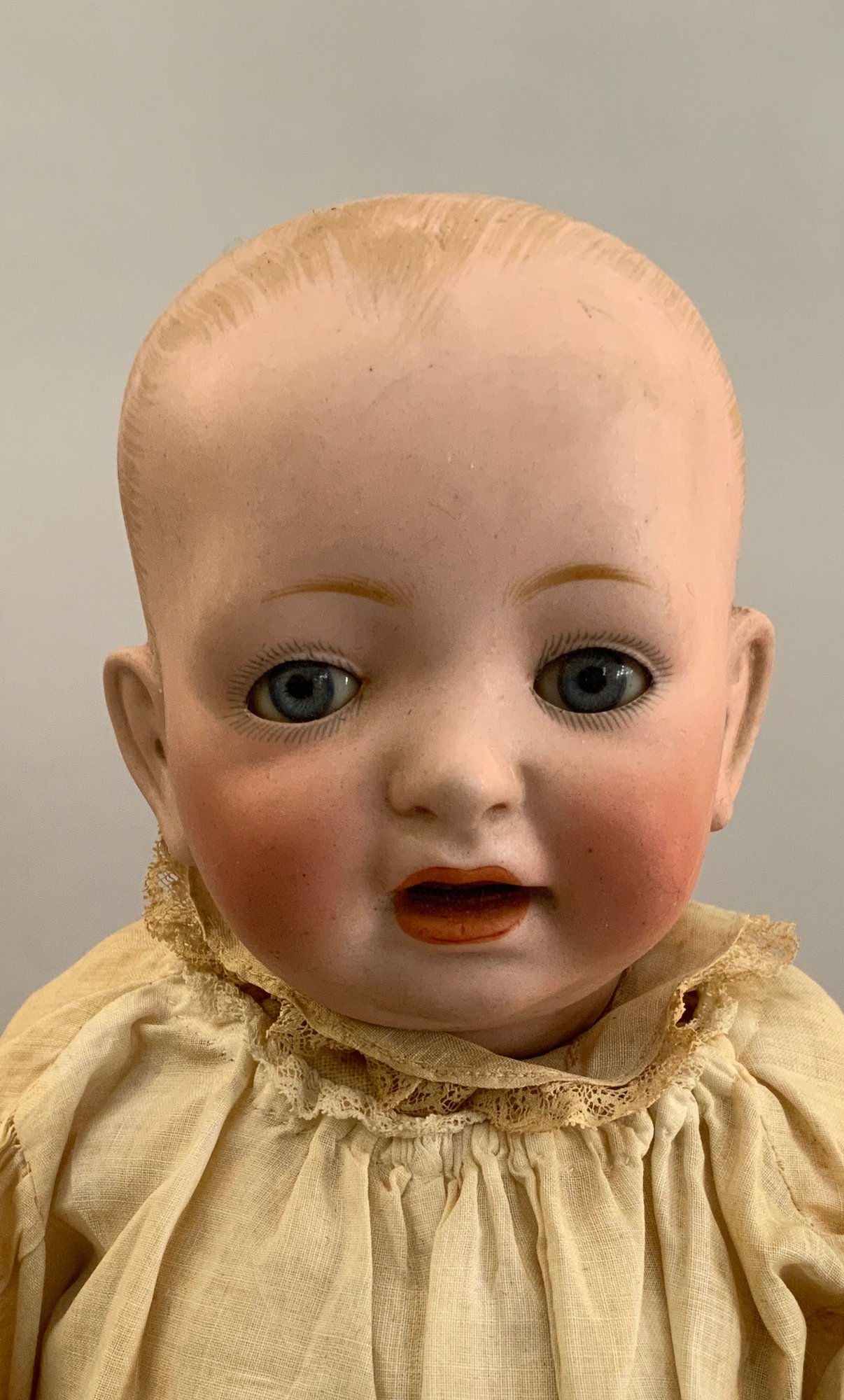 12” JDK 10 Baby, blue glass sleep eyes, OM with teeth & tongue, baby compo body, white dress (stains)