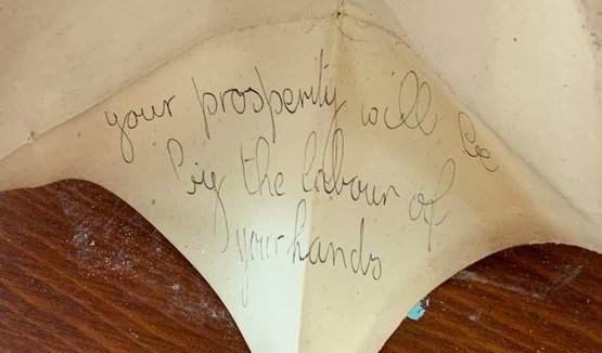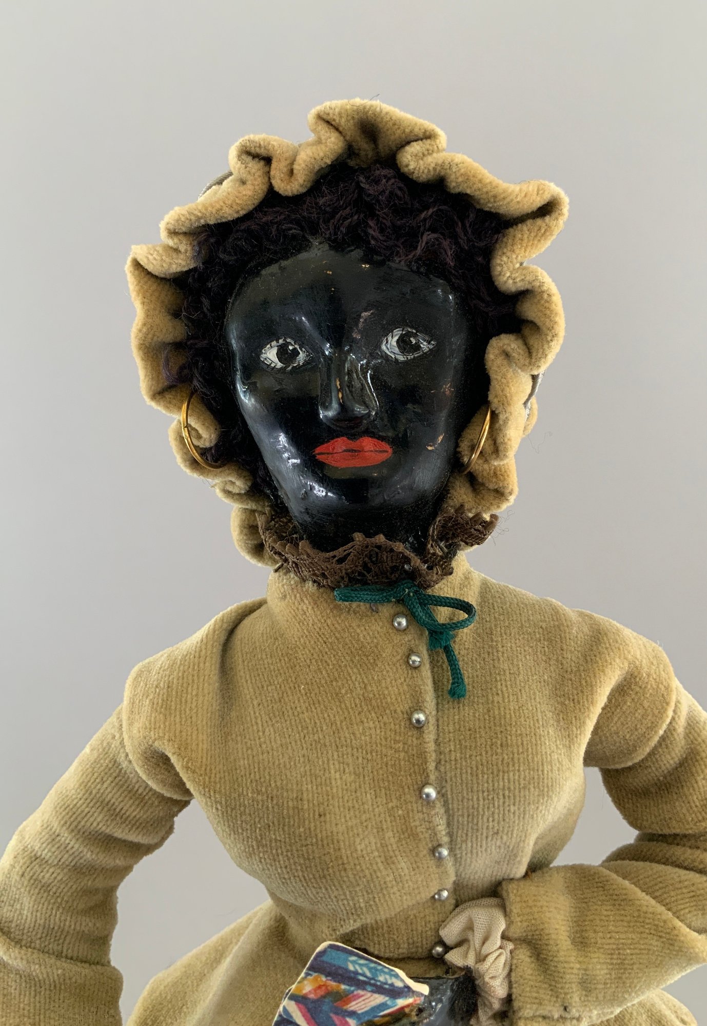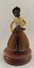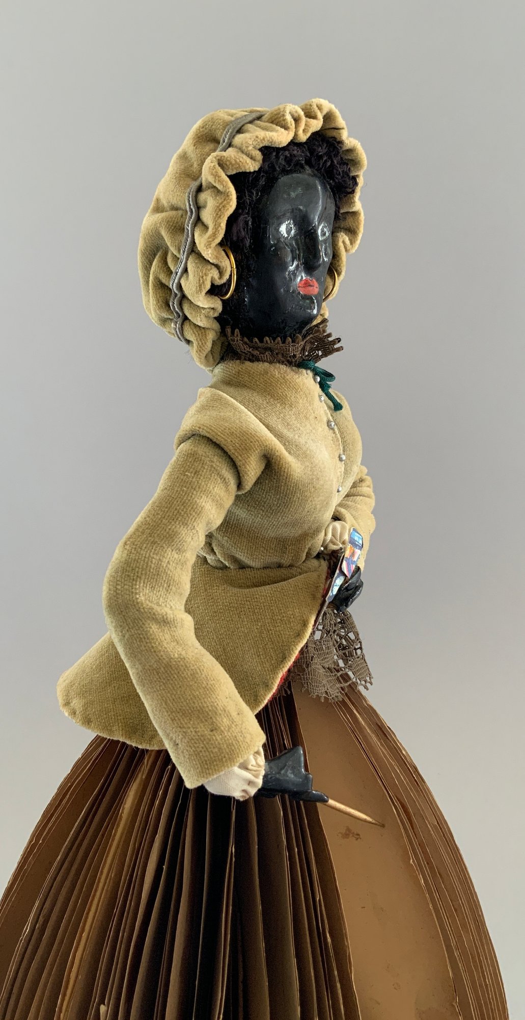 12” Paper mache black face fortune teller doll, painted features, bent arms, olive jacket with red lining on a skirt made up of folded paper with fortunes written on them, body lifts off of skirt, on round embossed metal base which sits on a round wood base, with glass dome