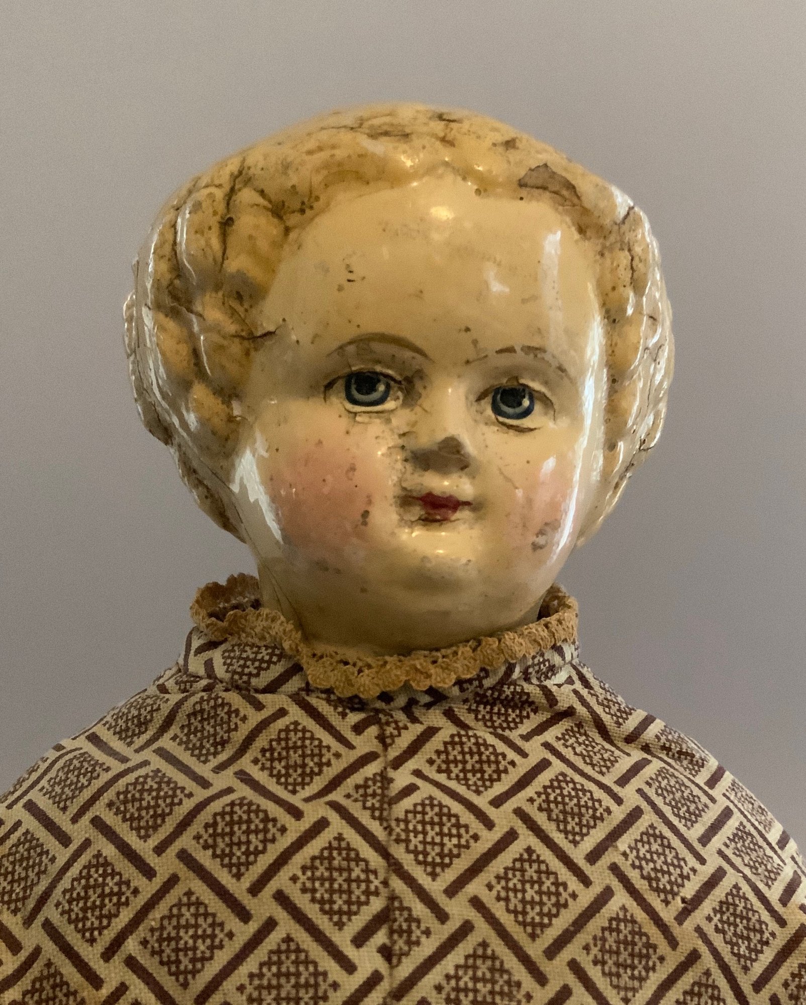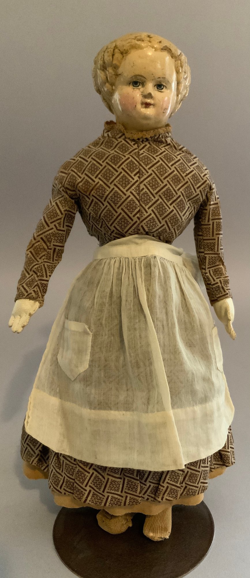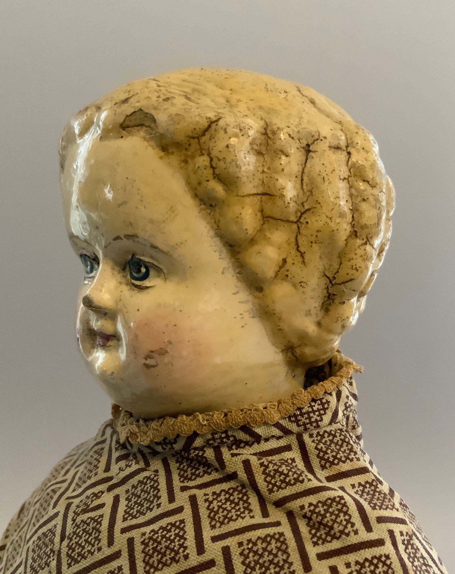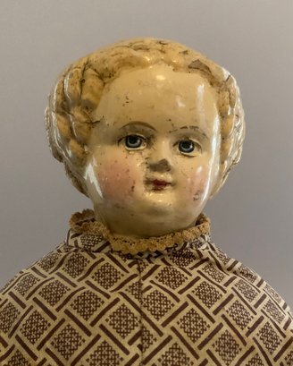 12 ½” Paper mache shoulder head, painted features, sculpted blonde hair, cloth body with leather arms (replaced), compo legs, brown dress ( cracks to head)