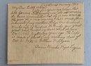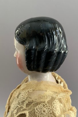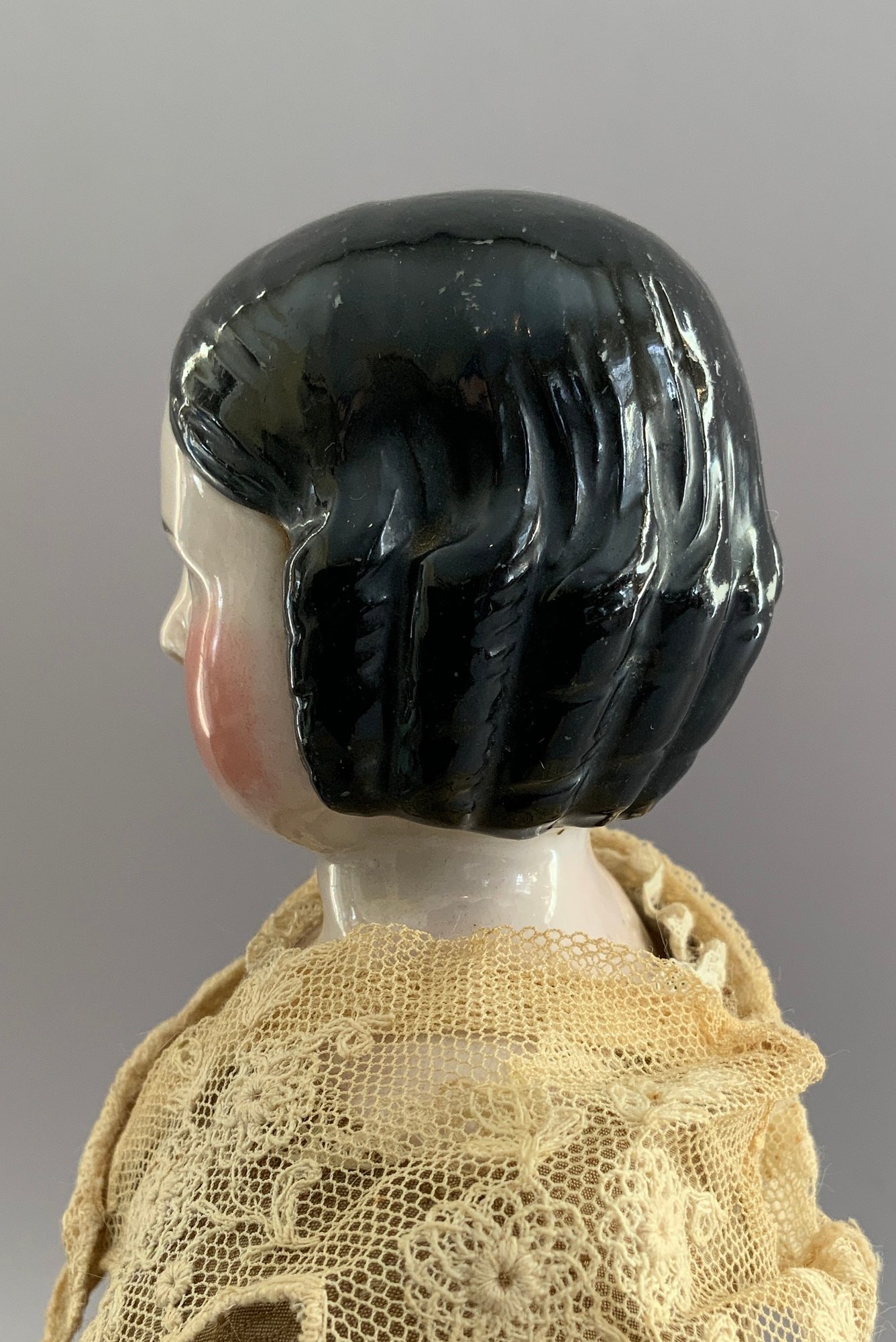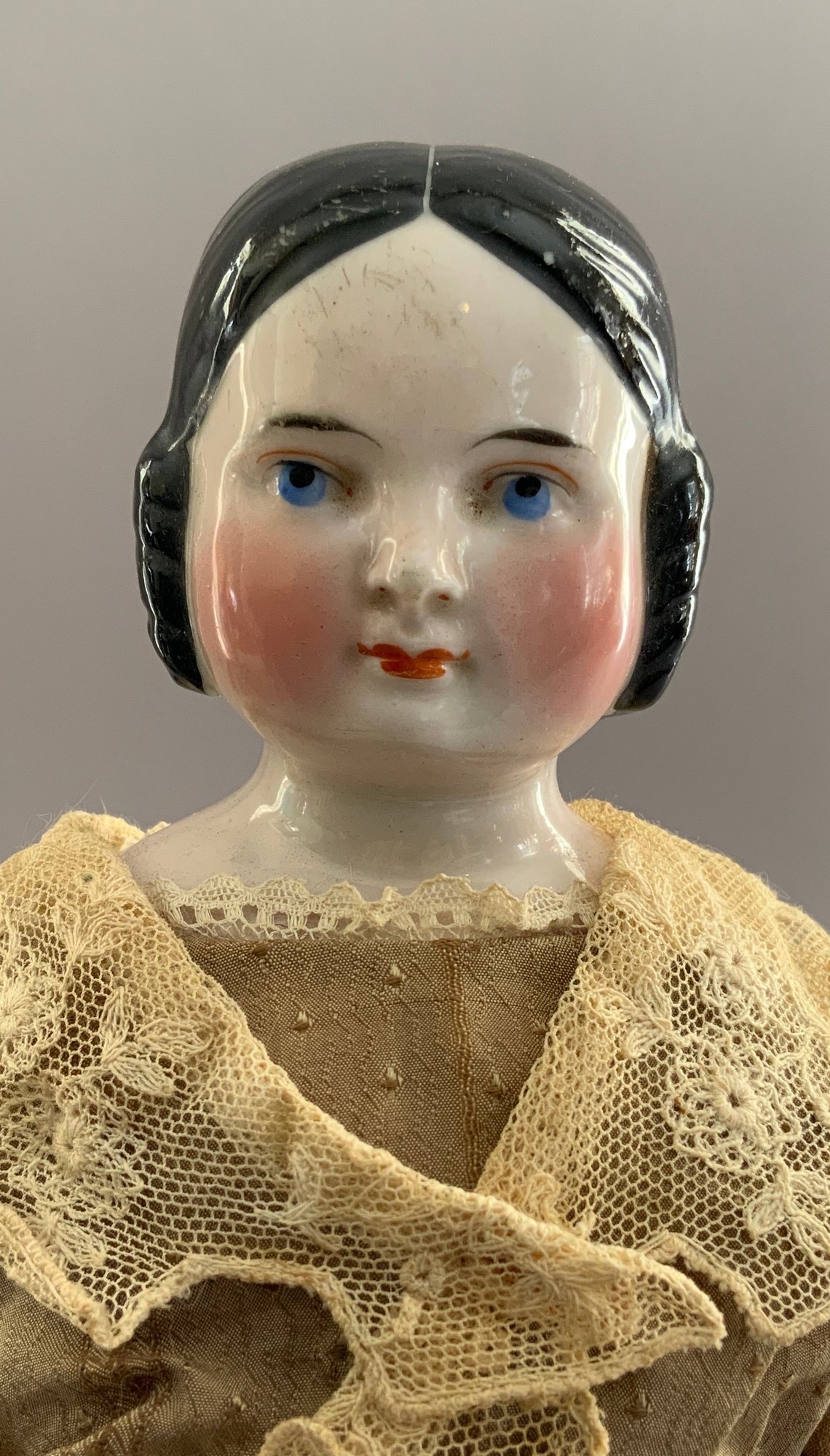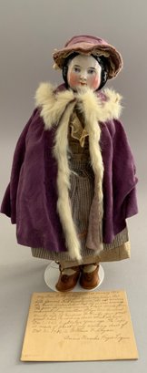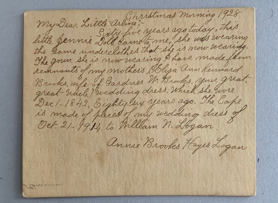 12” Pink tint black hair Jenny Lind style china doll, painted features, center part with braids (light rubs), cloth body with bisque arms, antique outfit, with Christmas Postcard marked Christmas Morning 1928 to My Dear Little Arline, 65 years ago today this little Jennie Doll came to me, etc. writing explaining the outfits history, signed Annie Brooks Hayes Logan, 1854 – 1933 Manchester NH