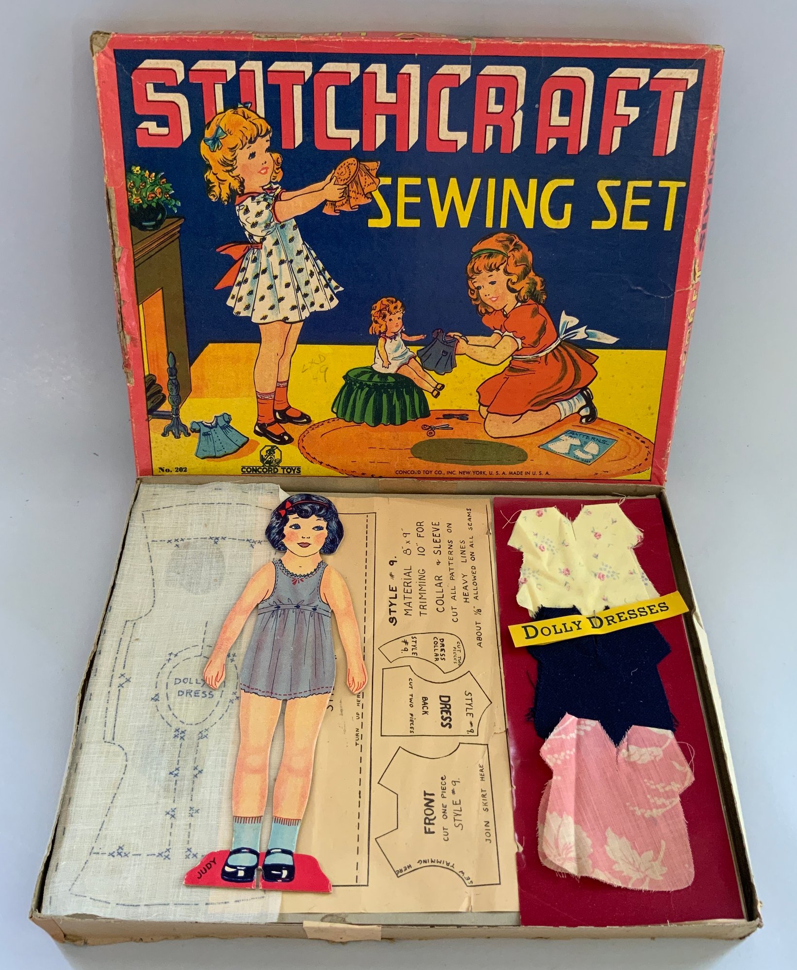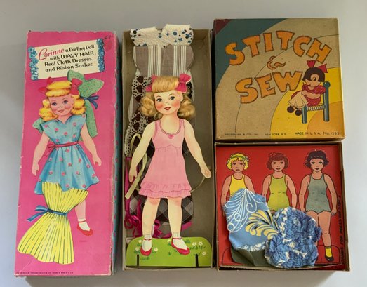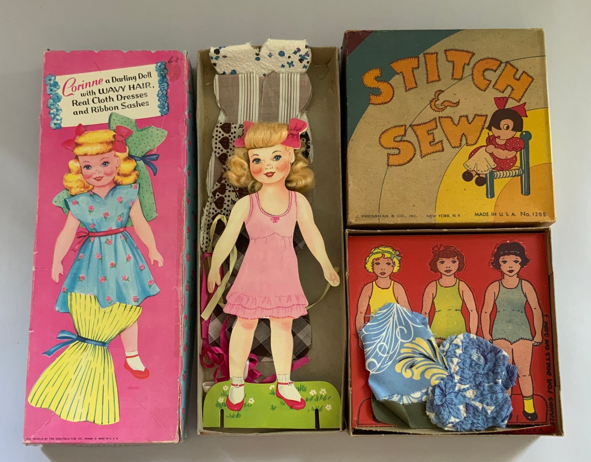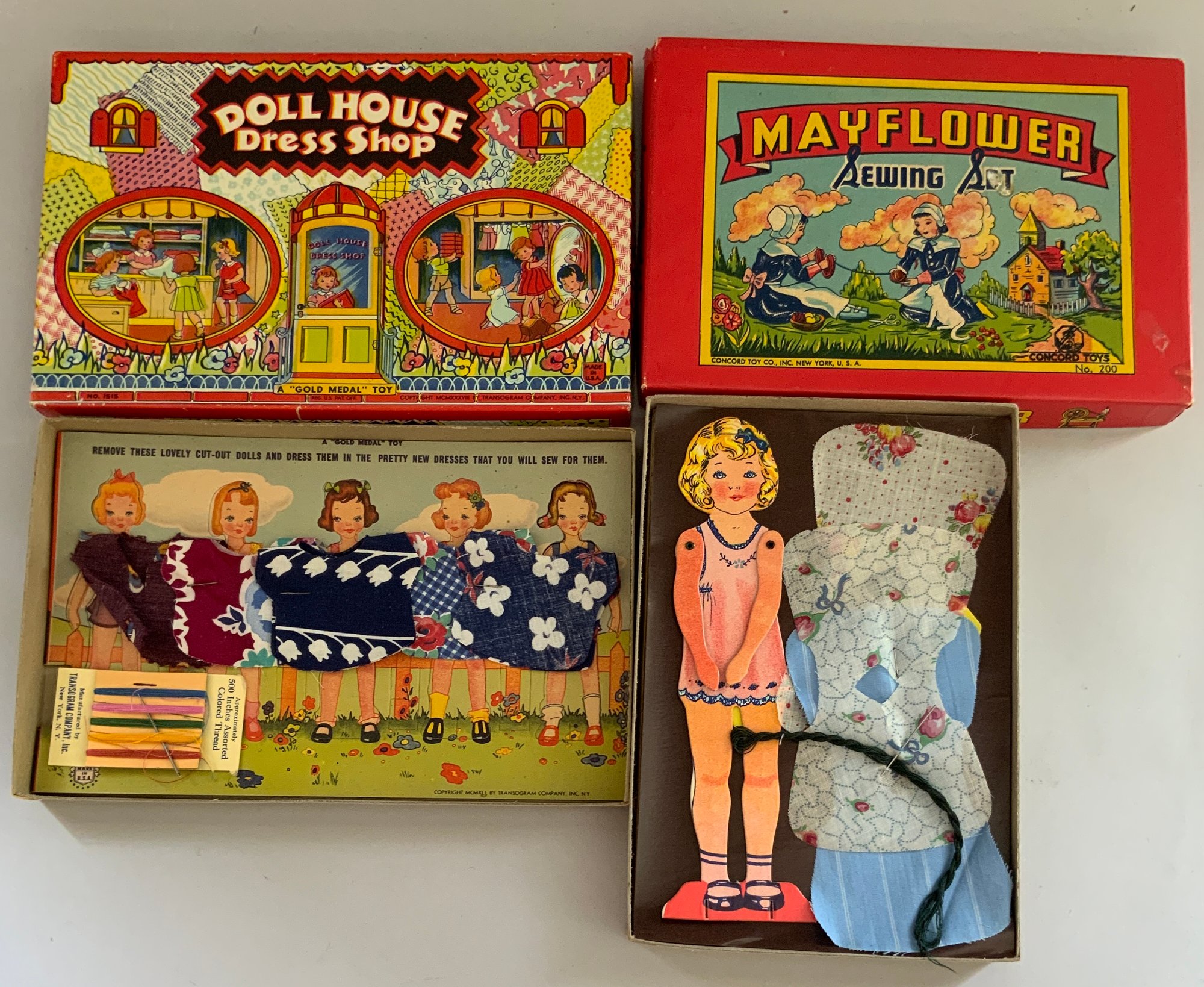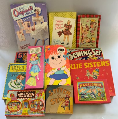 12 - Sewing Sets, Stitch & Sew, doll House Dress Shop, Mayflower Sewing Set, Sassie Paper Doll, Make Mary’s Clothes, Jr. Miss Sewing Kit, Stitchcraft Sewing Set, Style Show Sewing Set, Paper Dolls Wit Lace-On Costumes, Corinne a Darling Doll, Dollie Sisters, & Bride Originals Designer Set, original boxes some wear