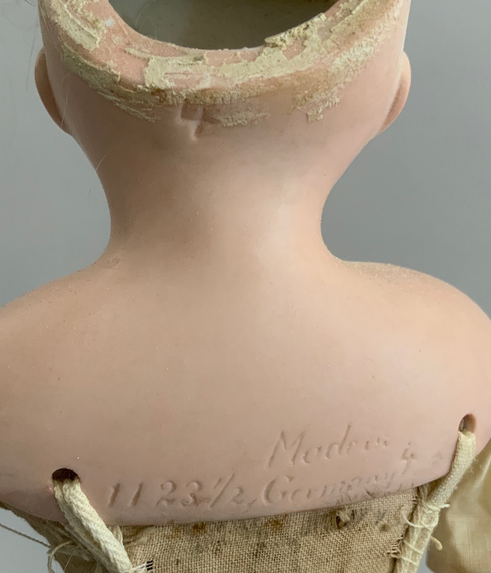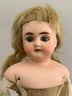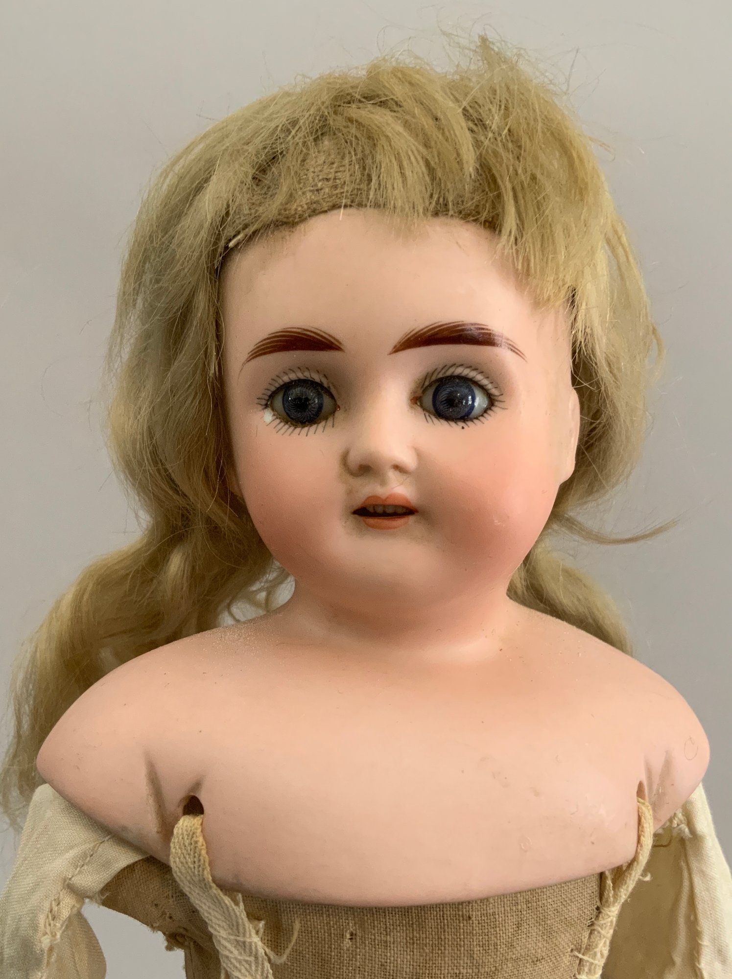 12” Turned shoulder head 4 11231/2, blue glass eyes, OM with teeth, blonde mohair wig, cloth body compo arms (hand roughness), no clothes (right eye corner nick)