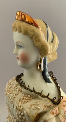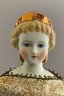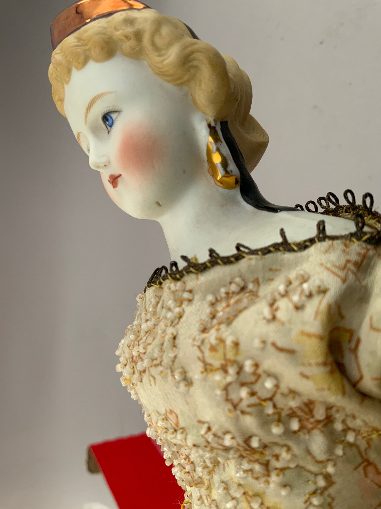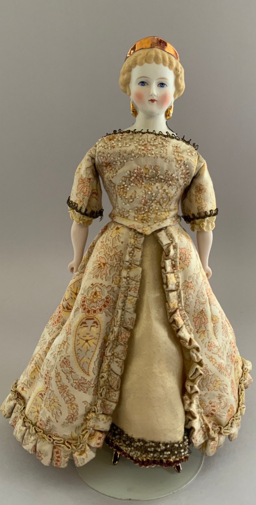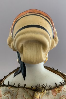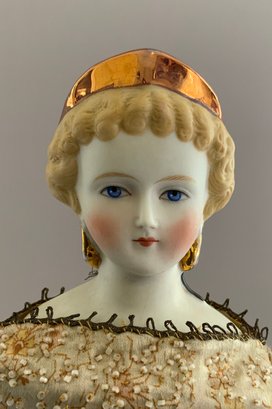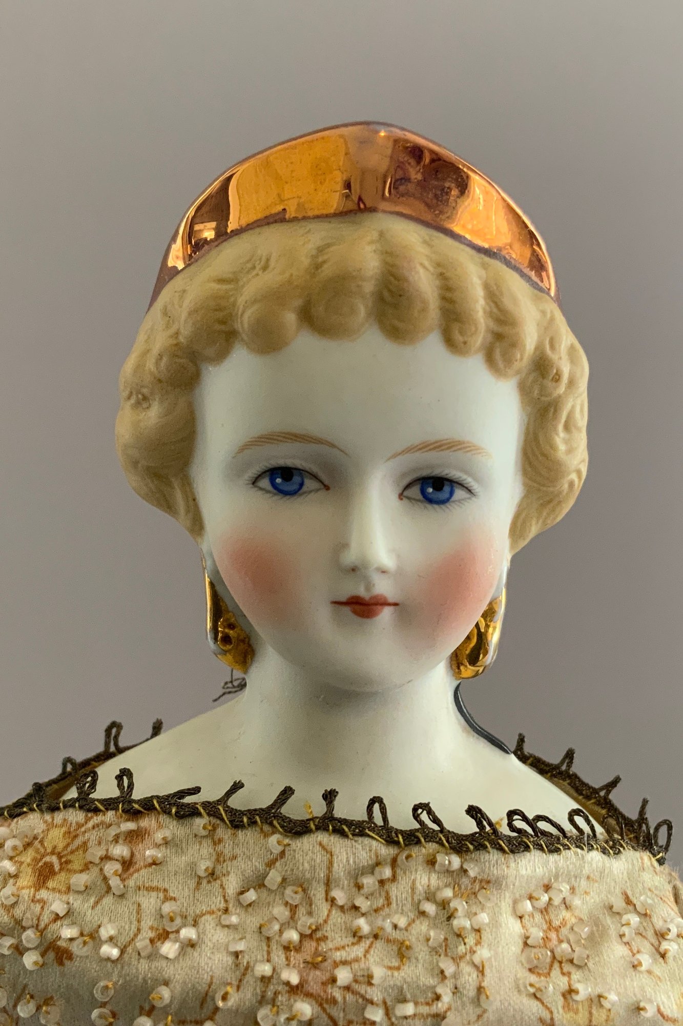 13” blonde hair parian, painted features, black head bands & copper luster comb, cloth body with parian limbs, green/gold print dress, copper luster boots, Ex Velma Driscoll collection, **** There is a tiny in manufacture flaw in the lower chin area ****