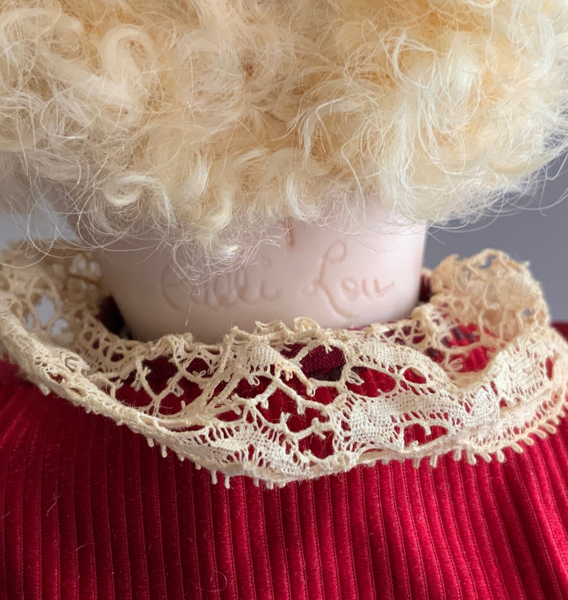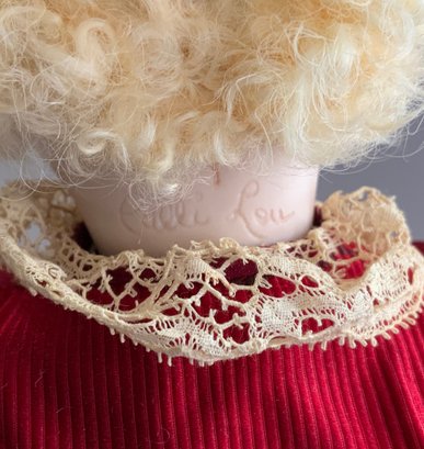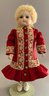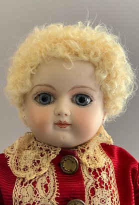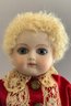 13” Calli Lou French artist doll, blue glass eyes, CM, PE, blonde skin type wig, compo body, red outfit with lace trim