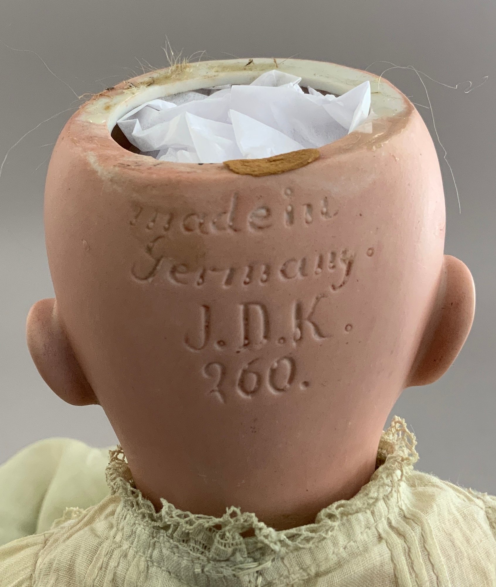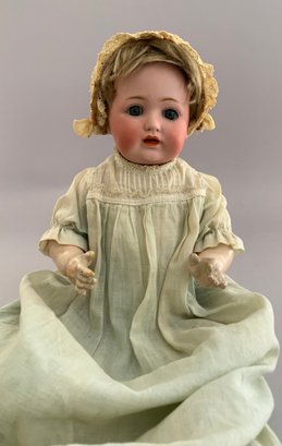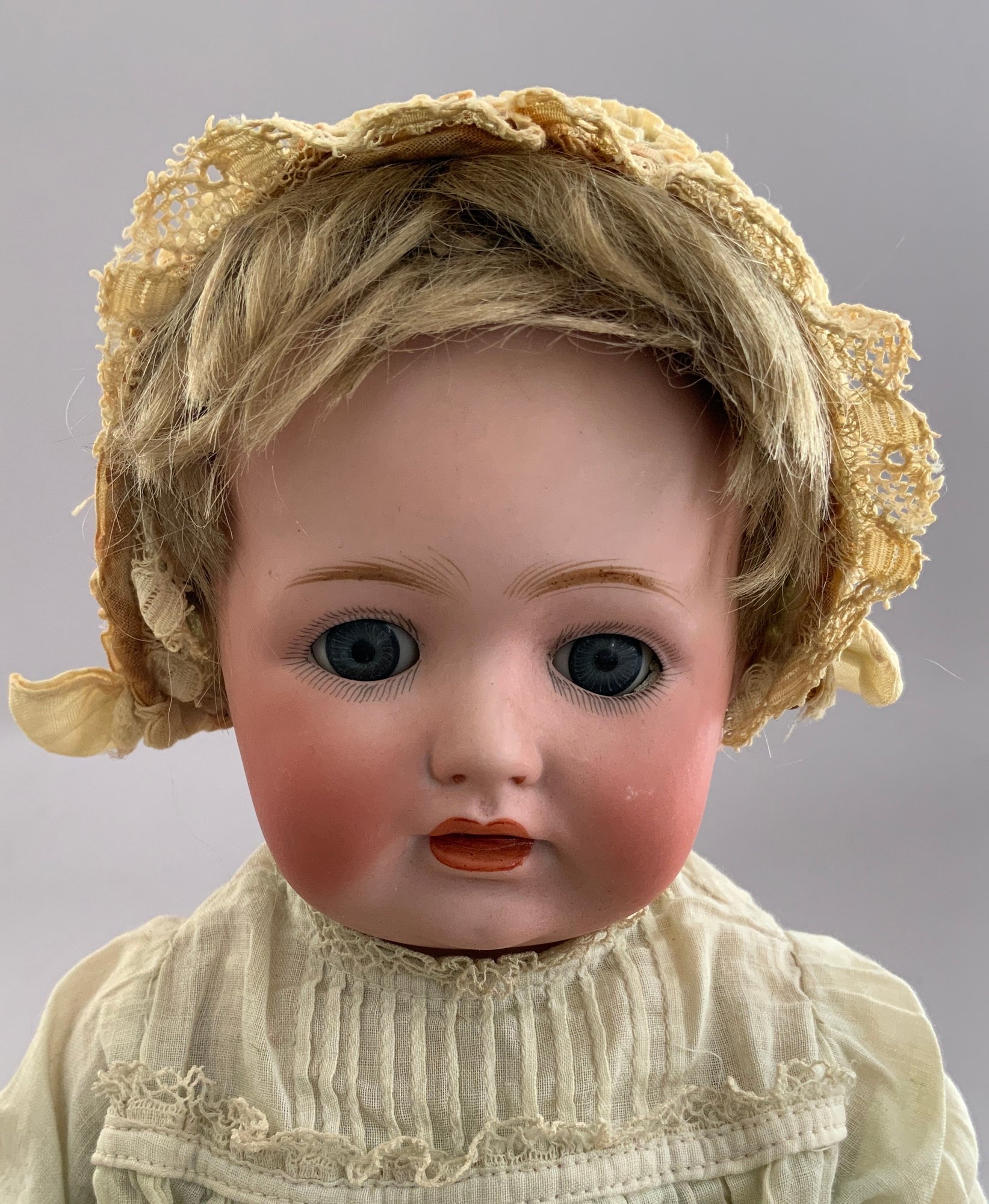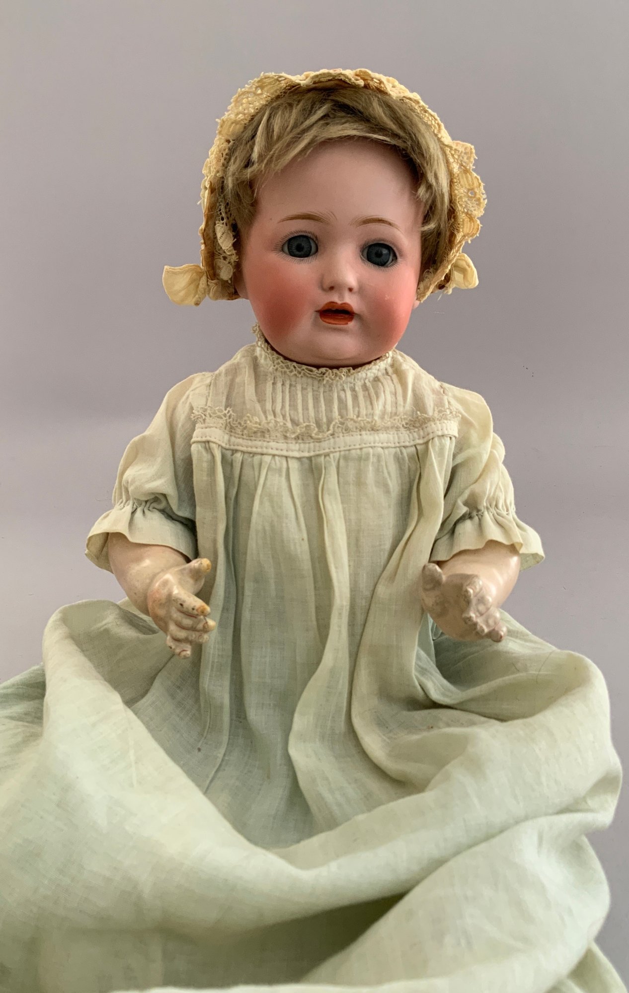 13” Character baby, JDK 260 made in Germany. 5-pc. baby body, blue sleep eyes, orig. dk. blonde mohair wig (as-is), o/m w/ tongue w/ 2 teeth, (glue on head rim, tiny dimple in forehead), wears christening gown & bonnet