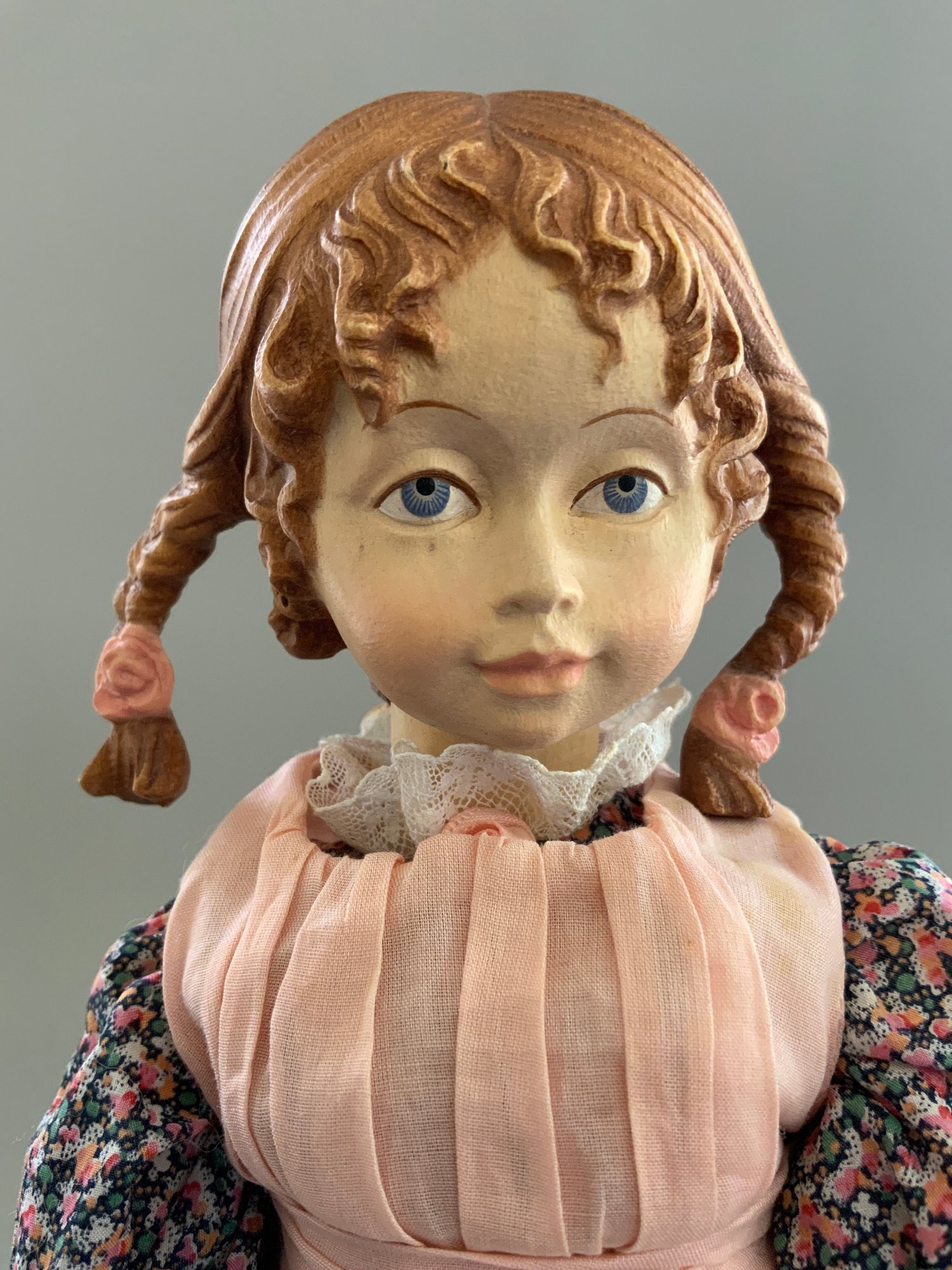 13” Dolfi made in Italy artist doll, sculpted & carved wood, elaborate hair style, painted features, pink/floral outfit, original tag, very good condition