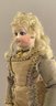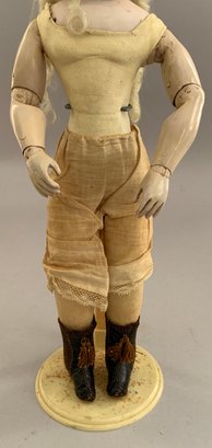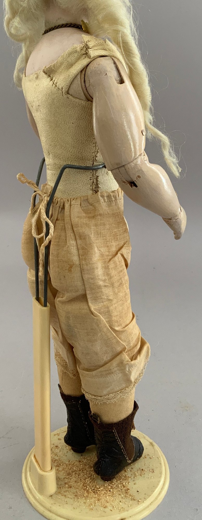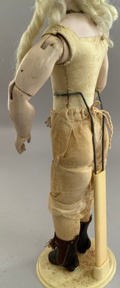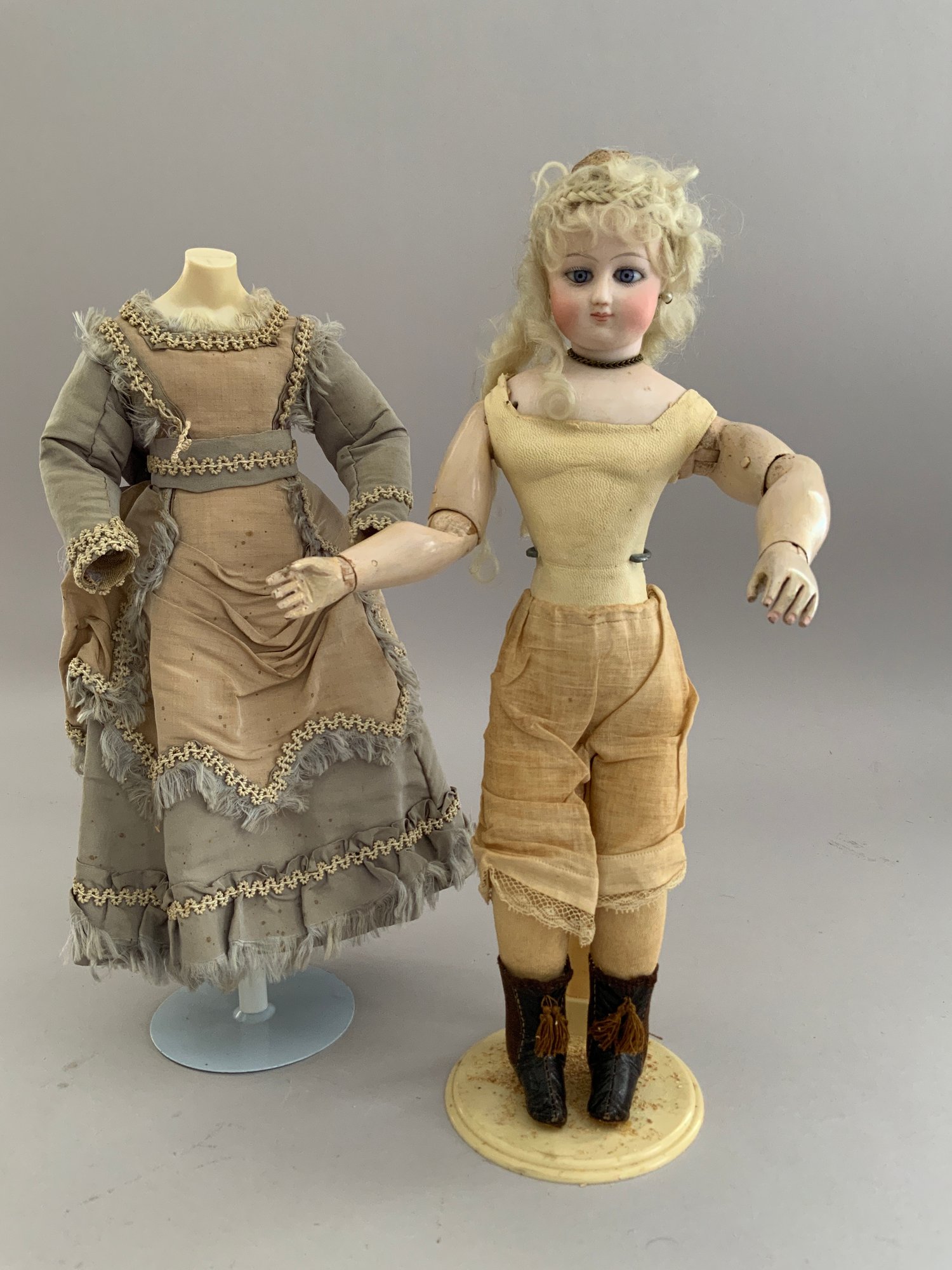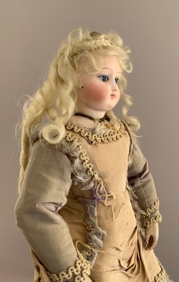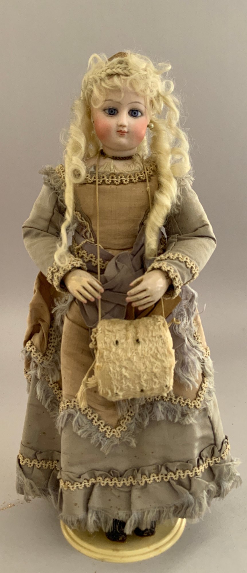 13” French Fashion, blue glass paperweight eyes, CM, PE, blonde mohair wig, kid body with wood arms, blue/gray silk walking suit (wear), brown boots
