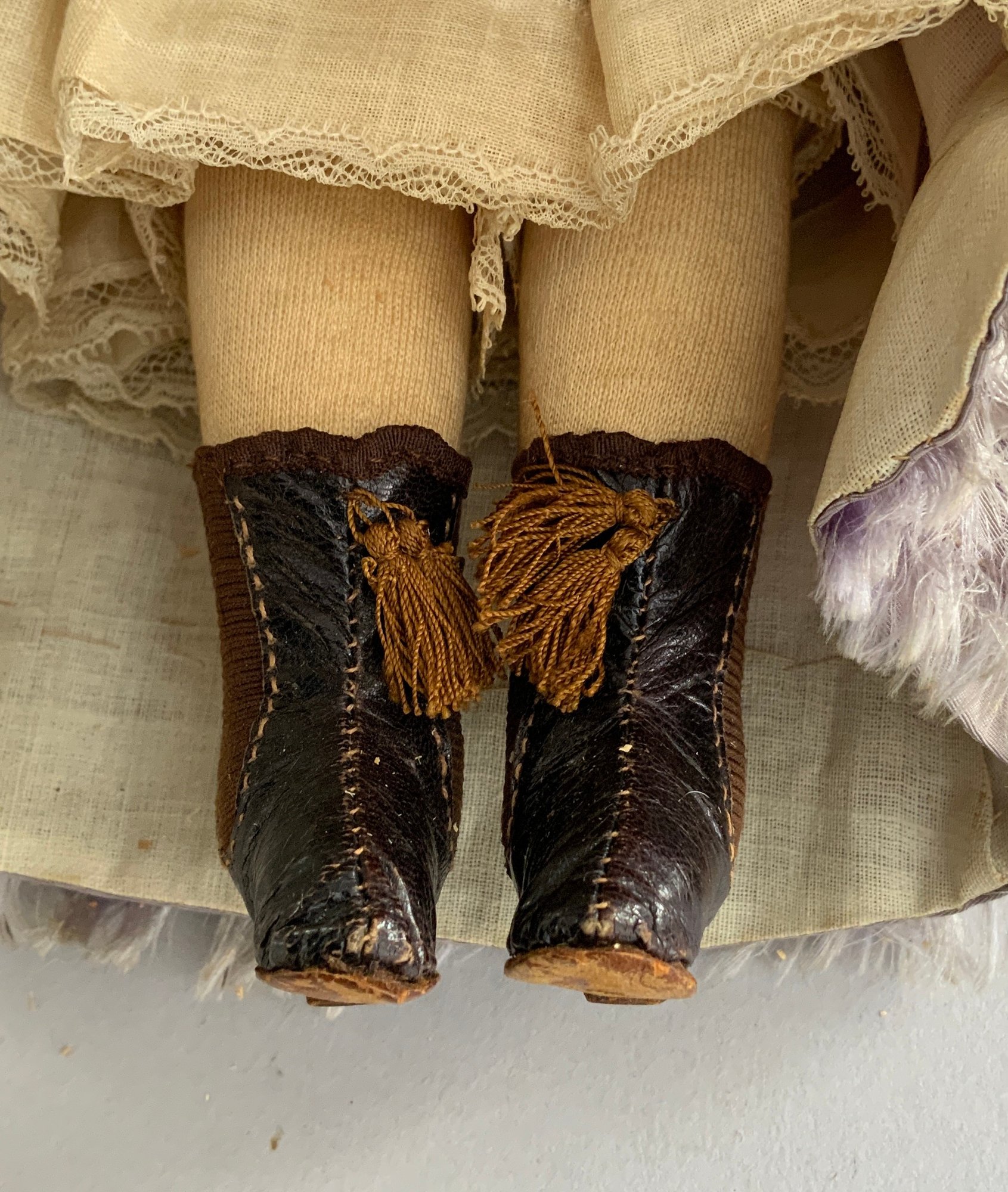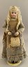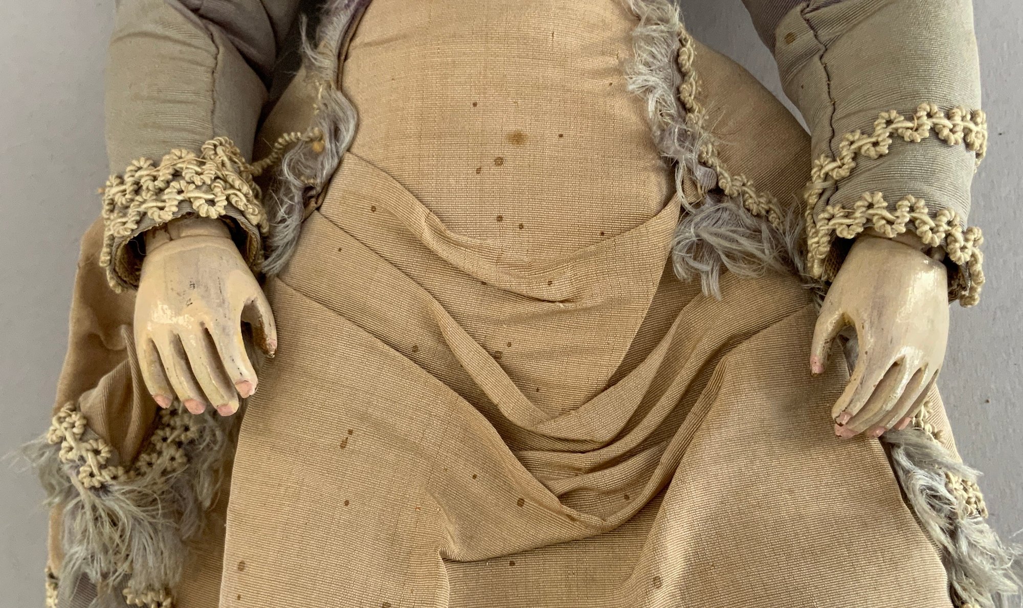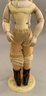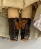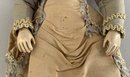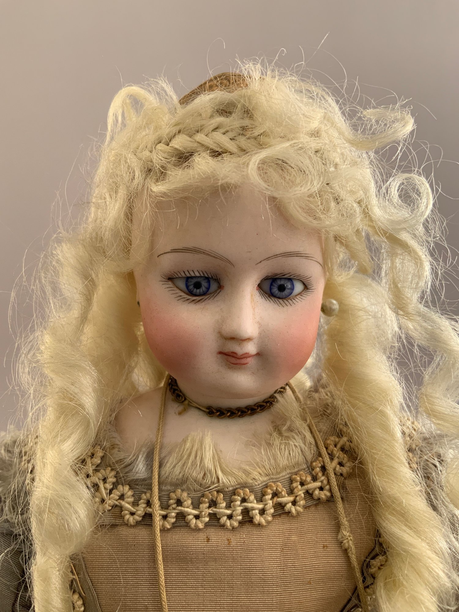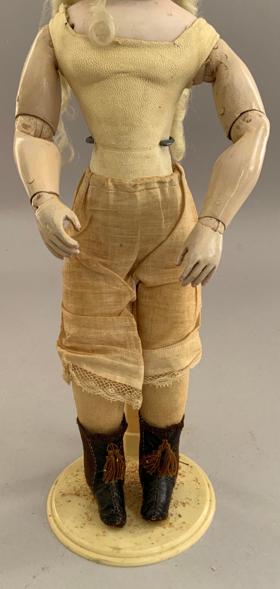 13” French Fashion, blue glass paperweight eyes, CM, PE, blonde mohair wig, kid body with wood arms, blue/gray silk walking suit (wear), brown boots