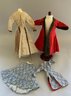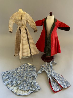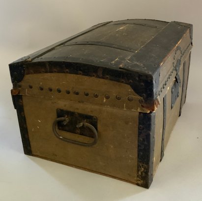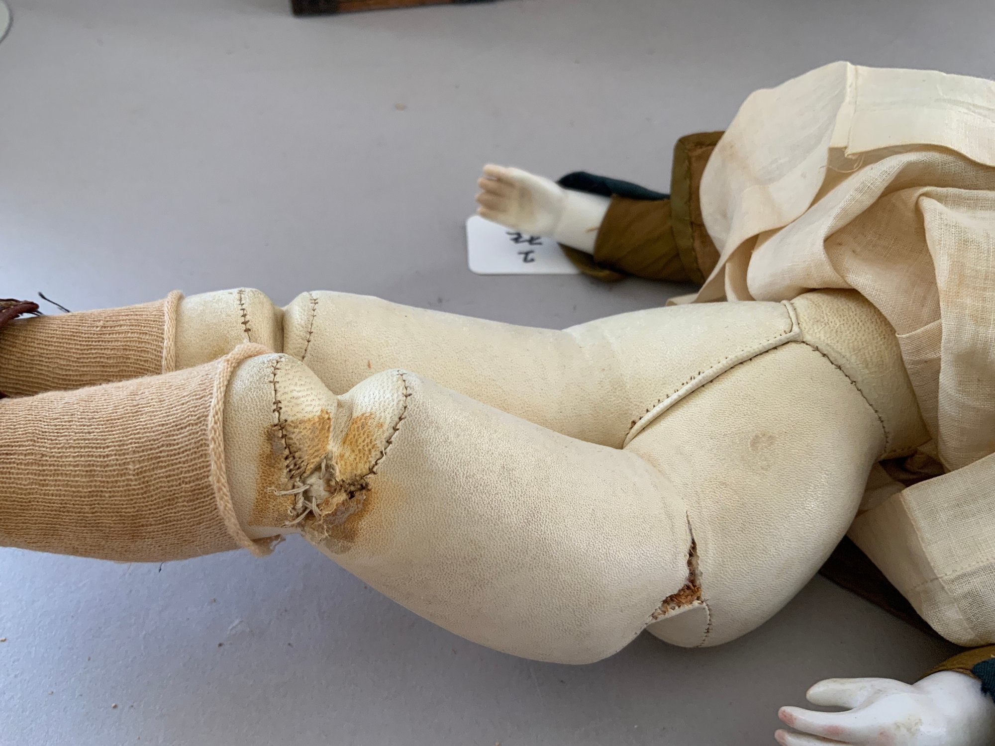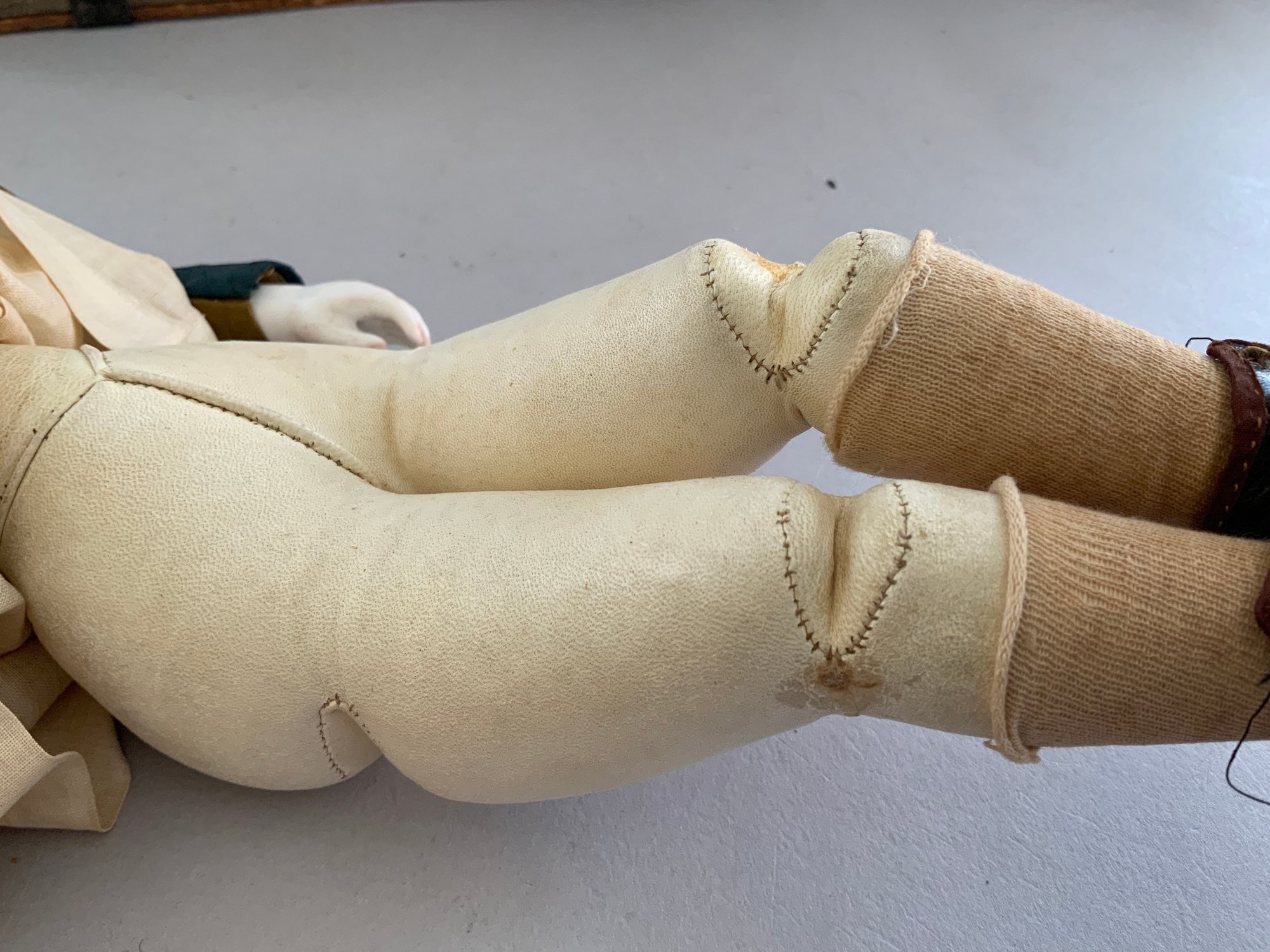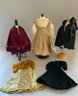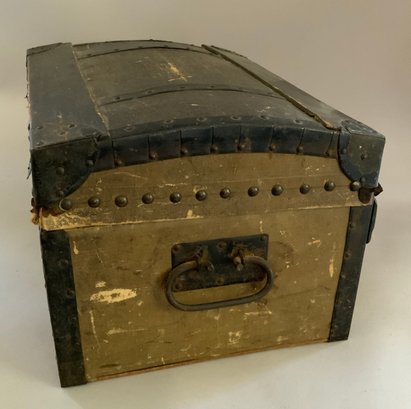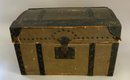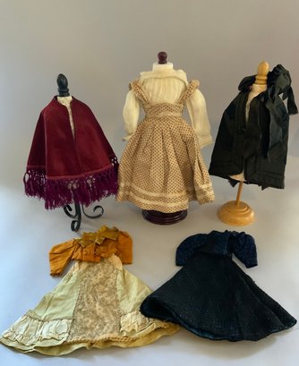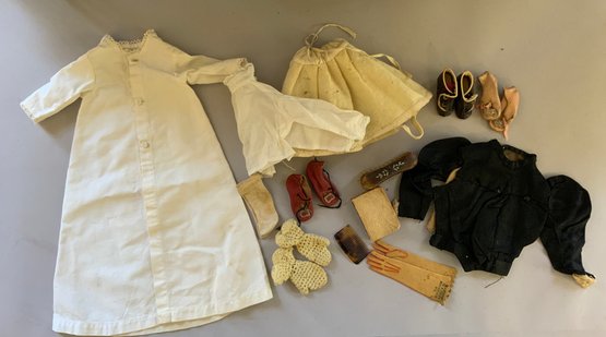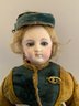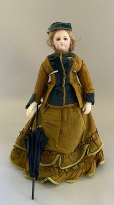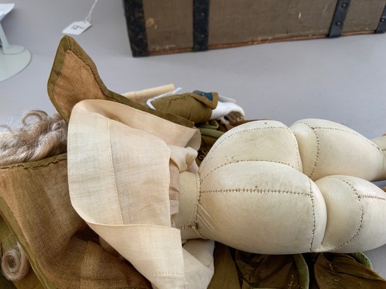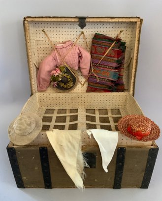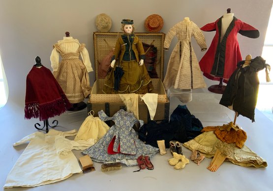 13” French Fashion swivel neck shoulder head, blue glass eyes, CM, PE, blonde mohair wig, kid body with bisque arms, gold silk 2 pc walking suit, with dome top doll trunk 13 ½”x 9 ½” x 10, with 8 outfits, assorted shoes, etc.