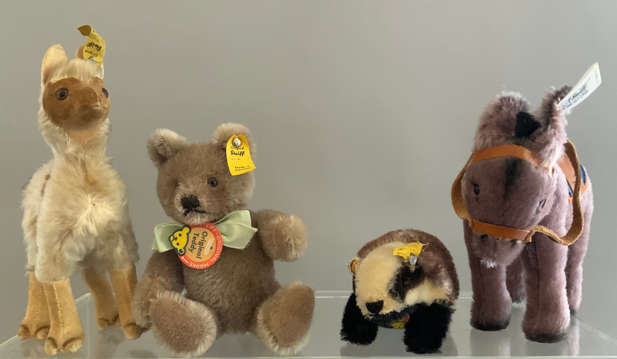 13 Steiff animals, Raudi dog, Badger diggy, Hoppy bunny, 2 - Boar, 2 -Red panda, Llama, Nagy beaver, 2 – 2 - chickens, donkey, Teddy