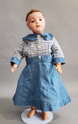 14 1/2" SCHOENHUT DOLL - ORIGNAL WIG CAP, BLUE PAINTED EYES, RUBS & PAINT CHIPS NOTED TO FACE