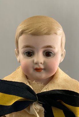 14” Bisque shoulder head boy, brown glass eyes, CM, sculpted blonde hair, kid body with bisque limbs (rough joints at shoulders), white shirt black pants (shelf dust stains & wear)