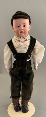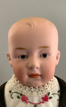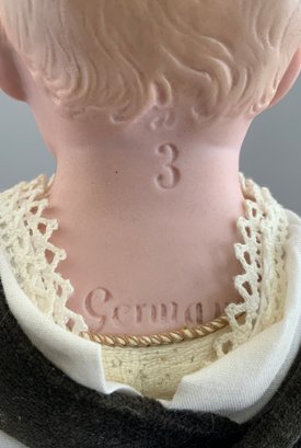 14” Bisque shoulder head incised Germany 3, painted features, CM, sculpted wispy hair, cloth body with bisque arms, dark green velvet pants