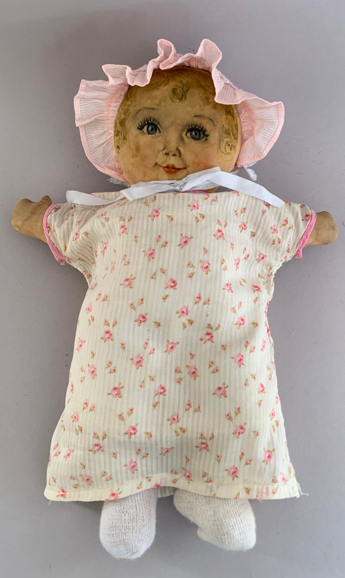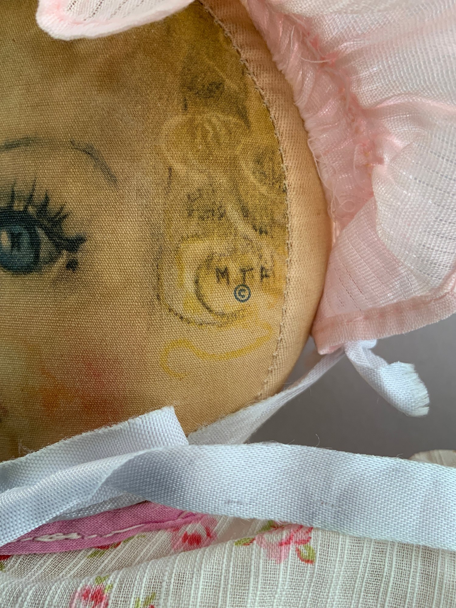 14” Cloth Maud Tousey Fangel “Sweets” doll, printed face, floral outfit, left side M T F (staining under hat)