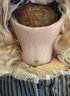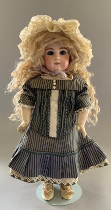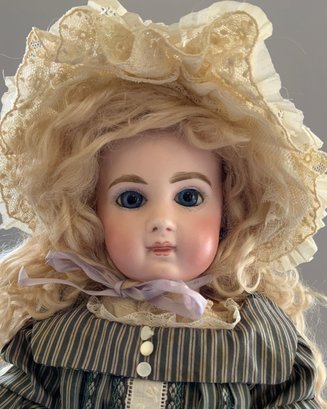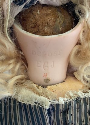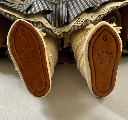 14 ½” Depose E6J Jumeau, blue glass paper weight eyes, CM, PE (nicks), blonde mohair wig, Jumeau blue stamp body (hand & forearm roughness & cracks, small chip on body by back of neck socket), silk stripe dress (light stains, back collar small holes), white leather Jumeau stamped shoes